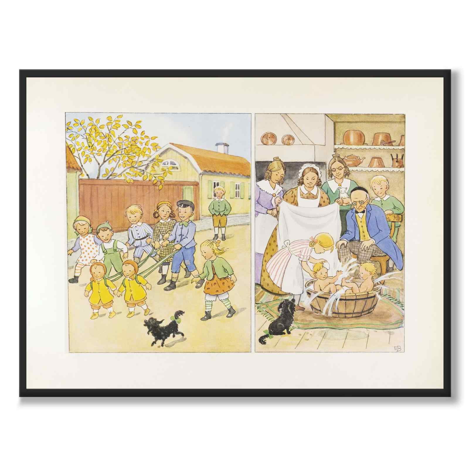 The illustration is divided into two scenes. On the left we see children playing outside in the yard on a cold winter day, pulling a sled while others run alongside. The trees have lost their leaves and the colorful facades of the houses give the scene an idyllic and playful character. On the right is a popular tradition: the Christmas bath. A small child sits in a wooden tub while adults help hold up a towel and ensure that the bath time is safe, warm and joyful. A small black dog curiously follows along in both scenes and playfully ties them together.