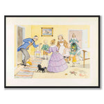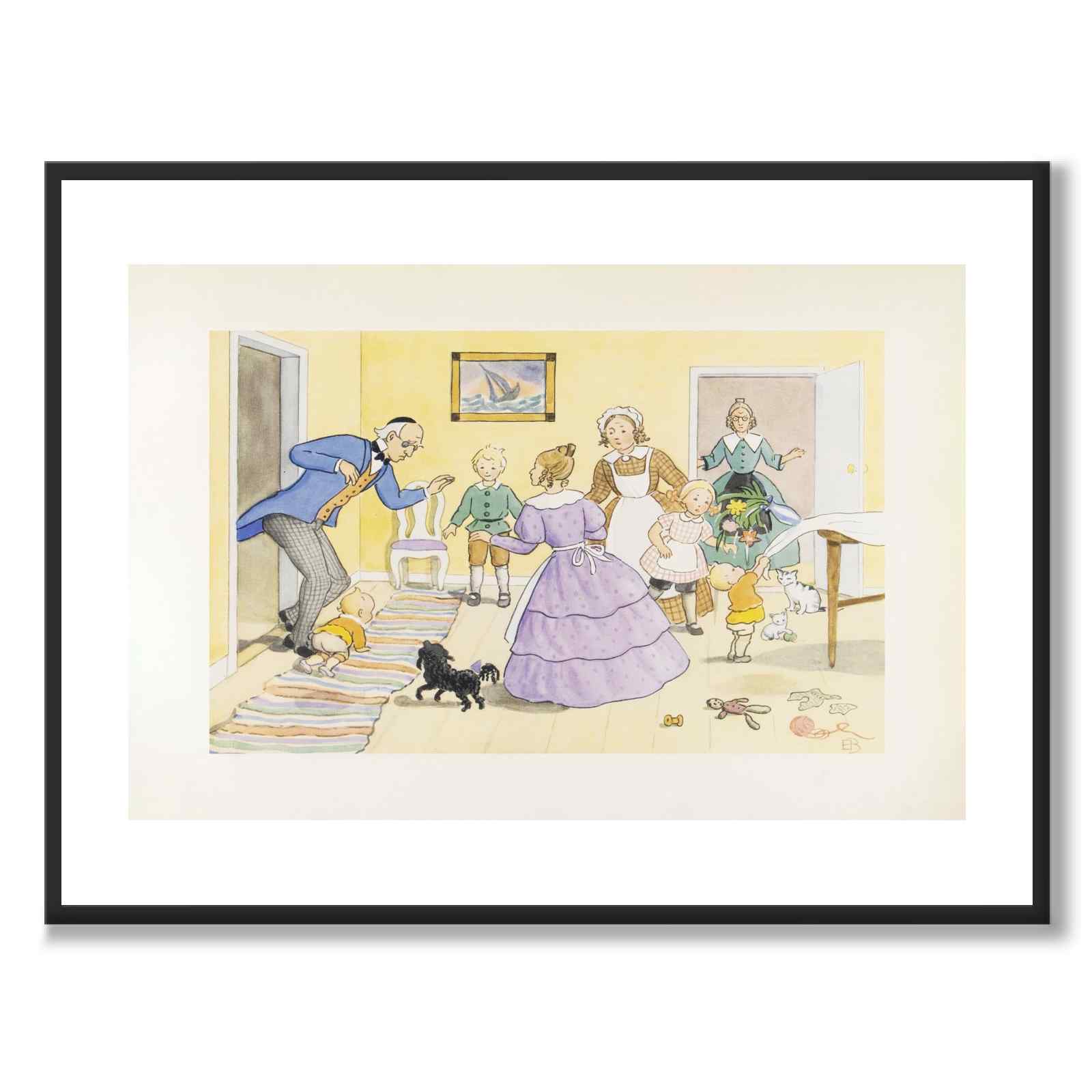 The illustration shows a lively indoor scene where children play and move around the room, while the adults follow their antics with both warmth and surprise. A man steps through the door and is greeted by the children's enthusiasm, and around him are details such as toys, rugs and a curious little dog that contribute to the playful atmosphere. The room is filled with movement and everyday joy, captured with Beskow's characteristic soft colors and clear design language.