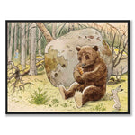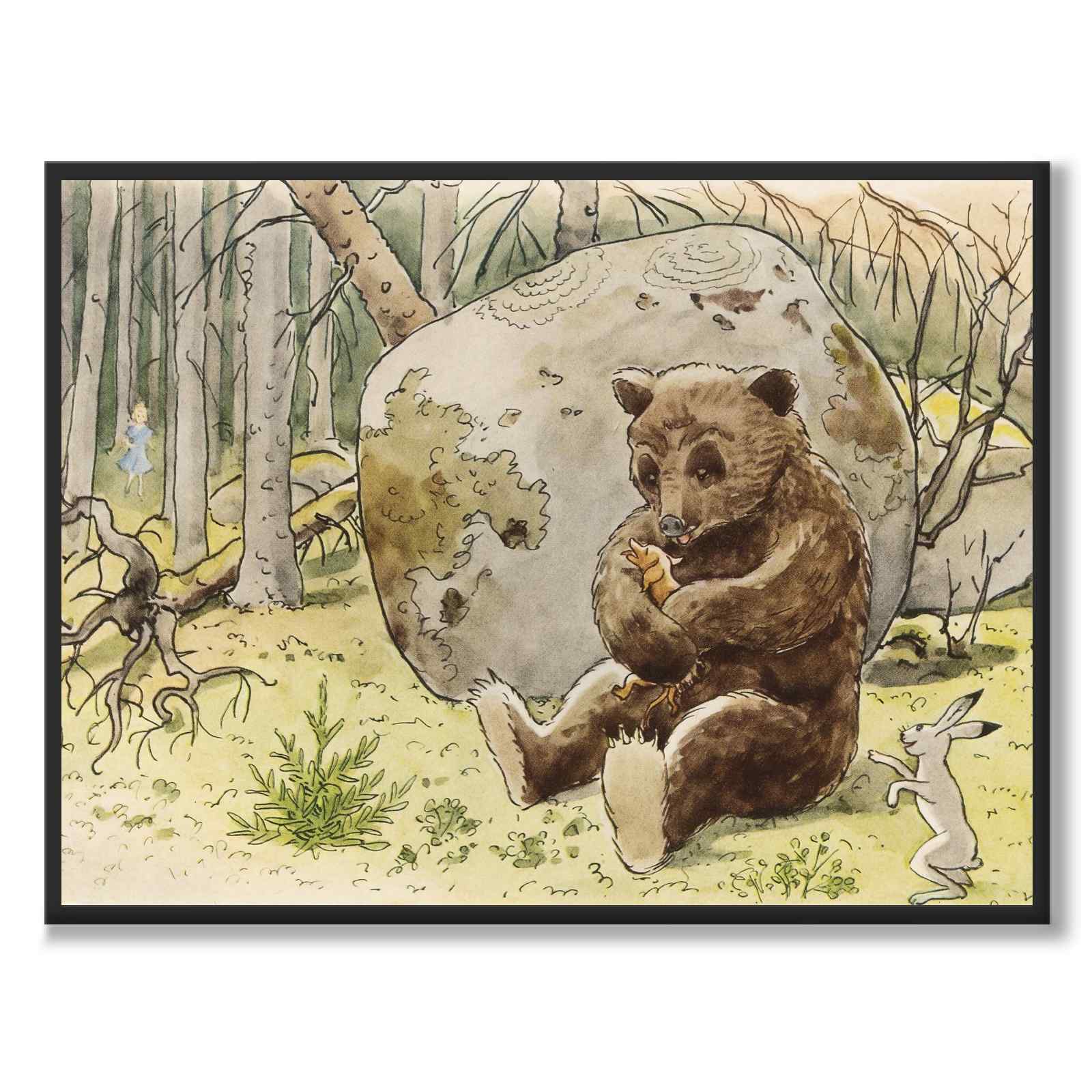 Bilden visar en scen där en björn sitter lutad mot ett stort stenblock i skogen och håller något i sina tassar. En hare står försiktigt framför honom och verkar nyfiket närma sig. I bakgrunden skymtar en liten prinsessa mellan träden.