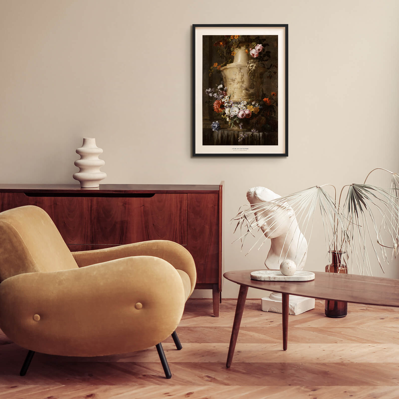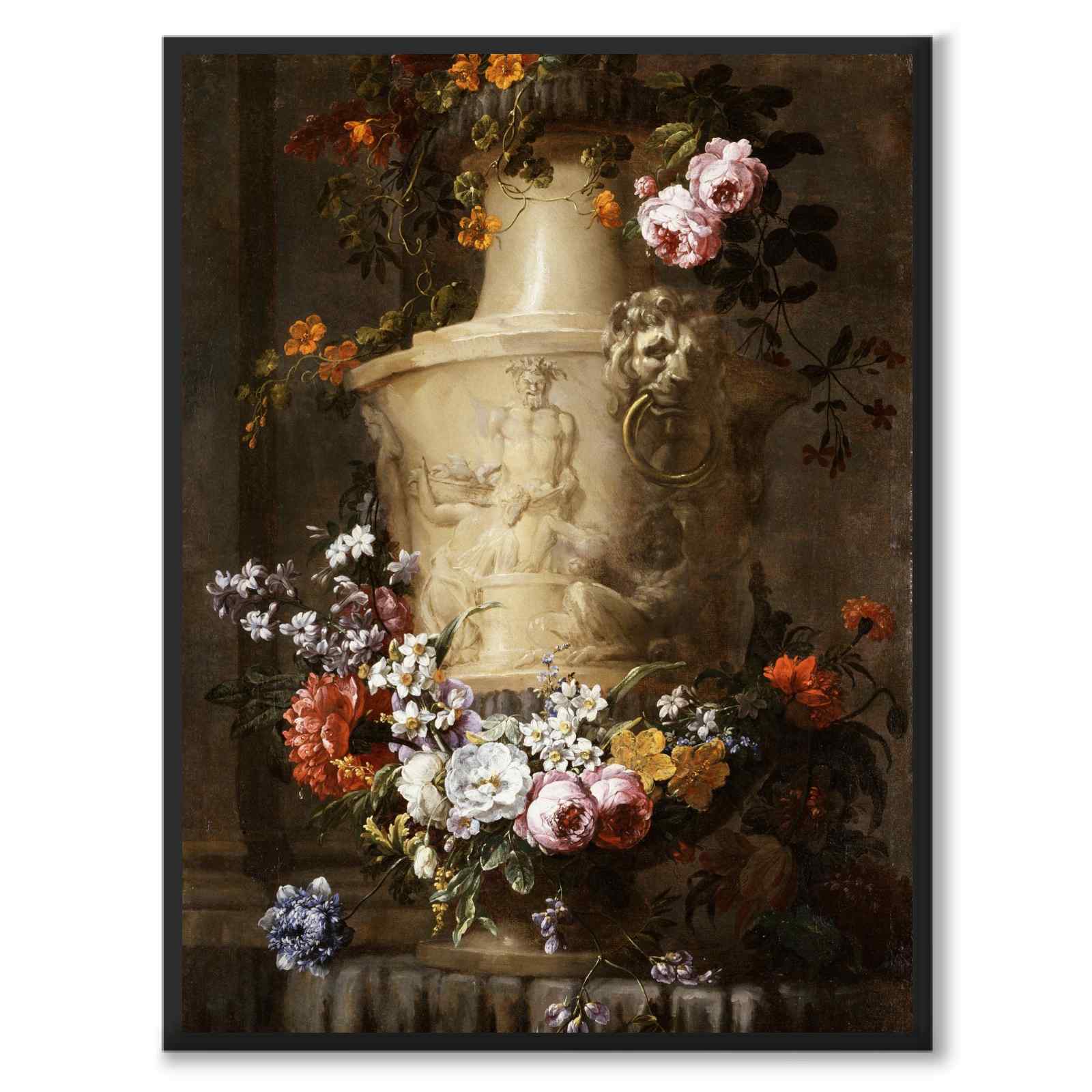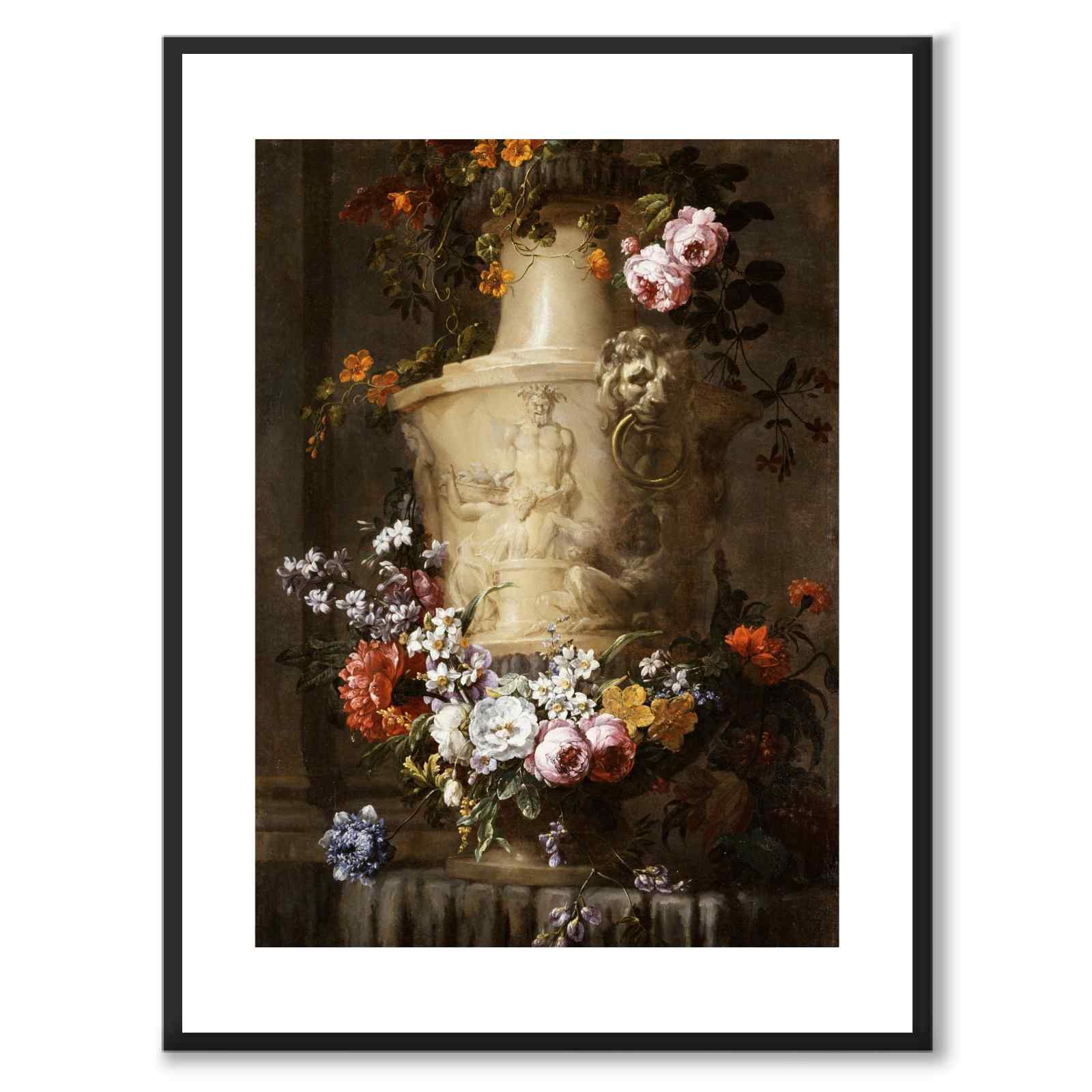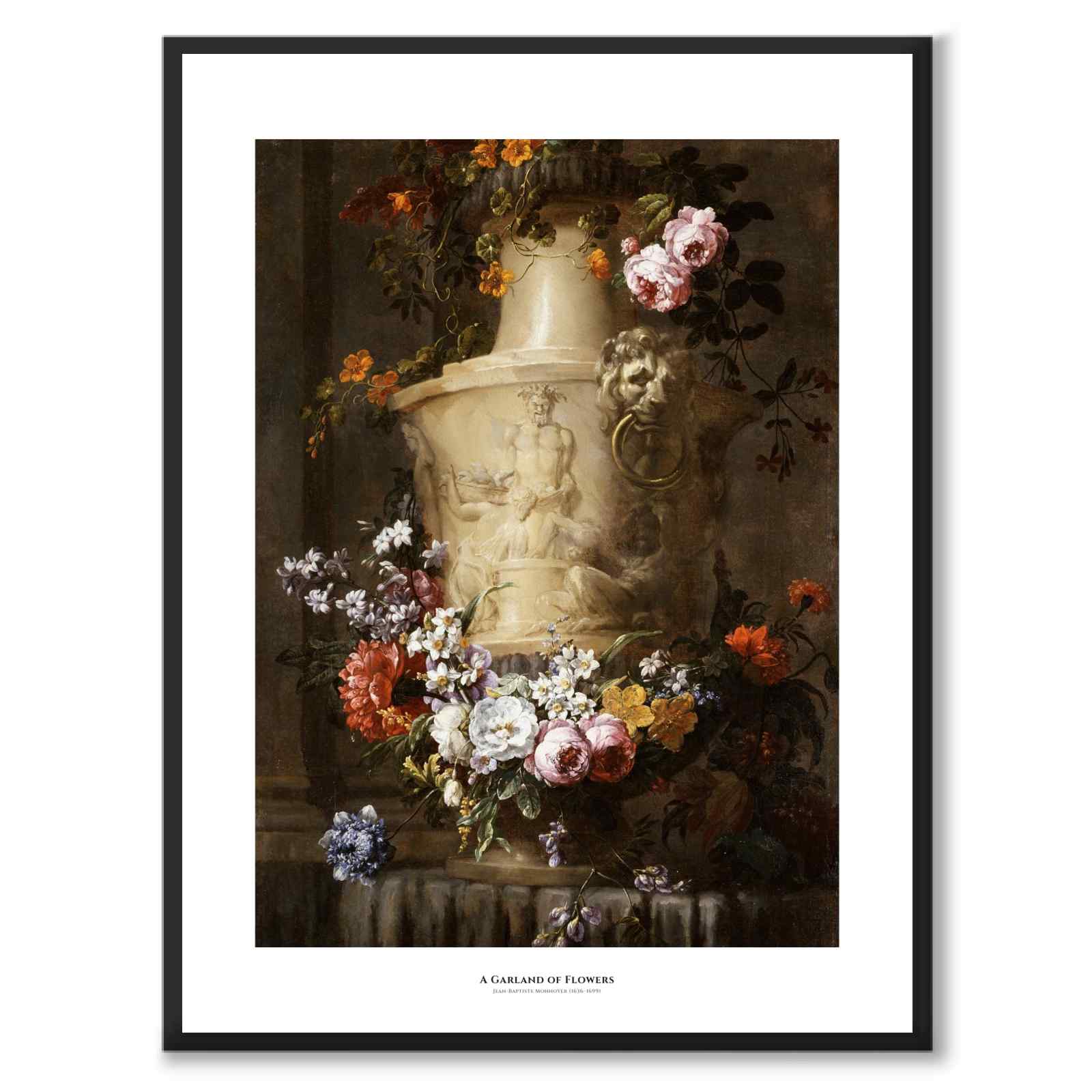 Plakat med et vakkert maleri fra 1600-tallet av den franske kunstneren Jean-Baptiste Monnoyer (1636-1699). På bildet ser vi en marmorvase med en vakker krans av blomster.