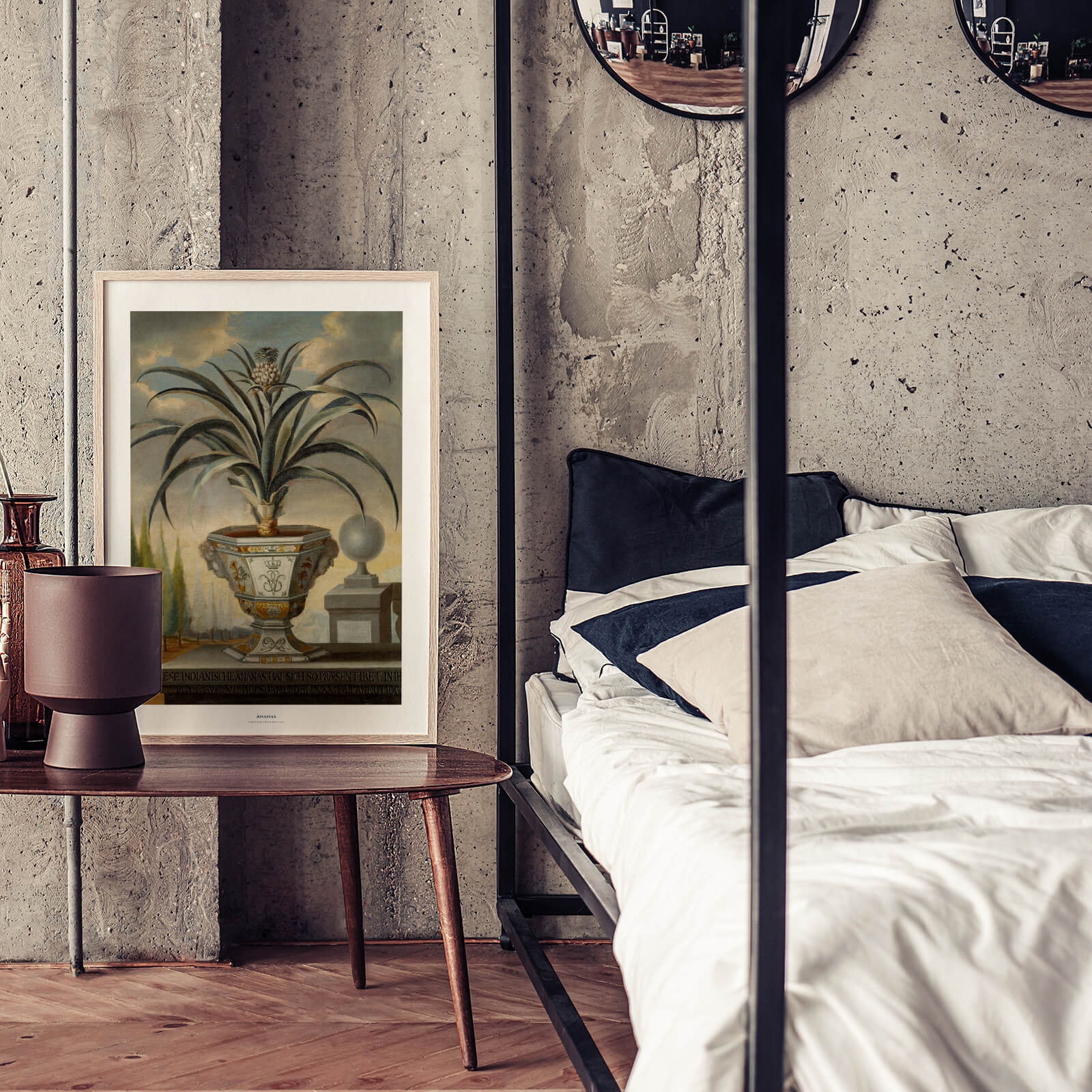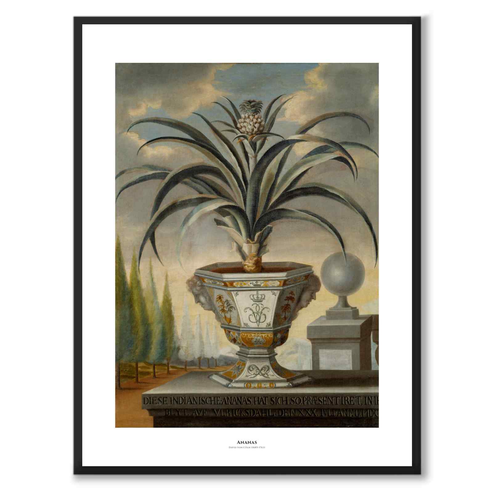 Plakat med maleri av en ananasplante fra 1729 av den svenske kunstneren David von Cöln. I dag henger maleriet på Gripsholm slott og kunstneren er representert på Nasjonalmuseet.