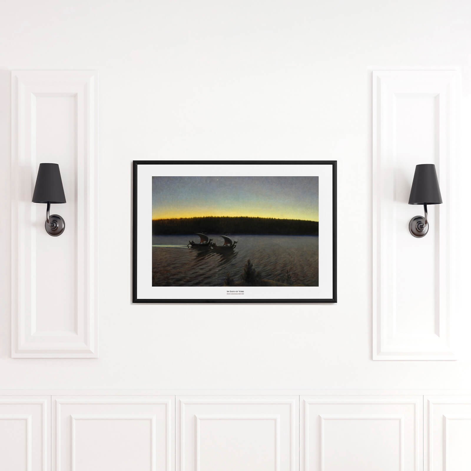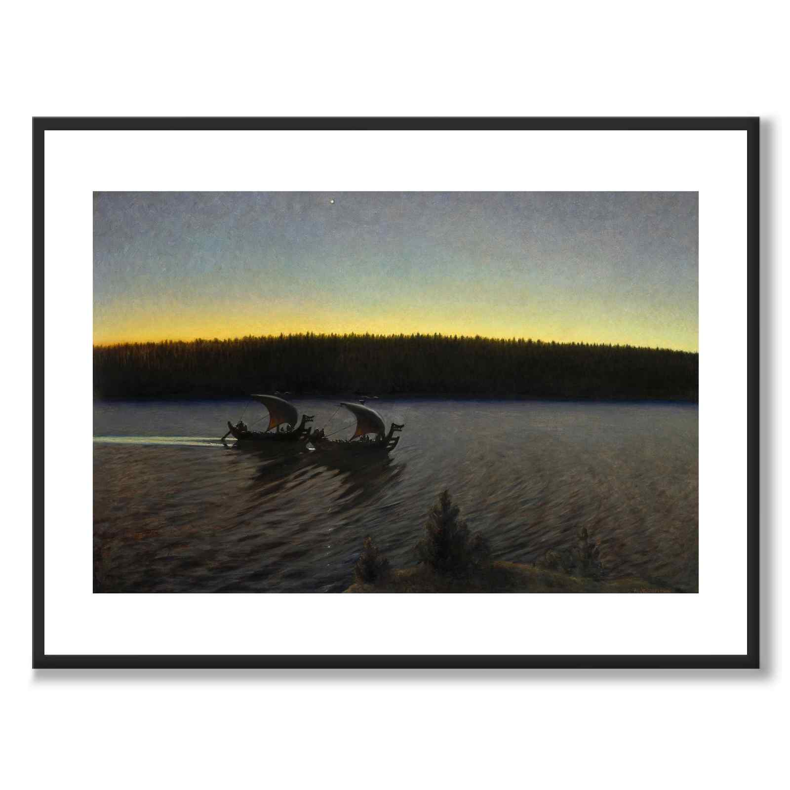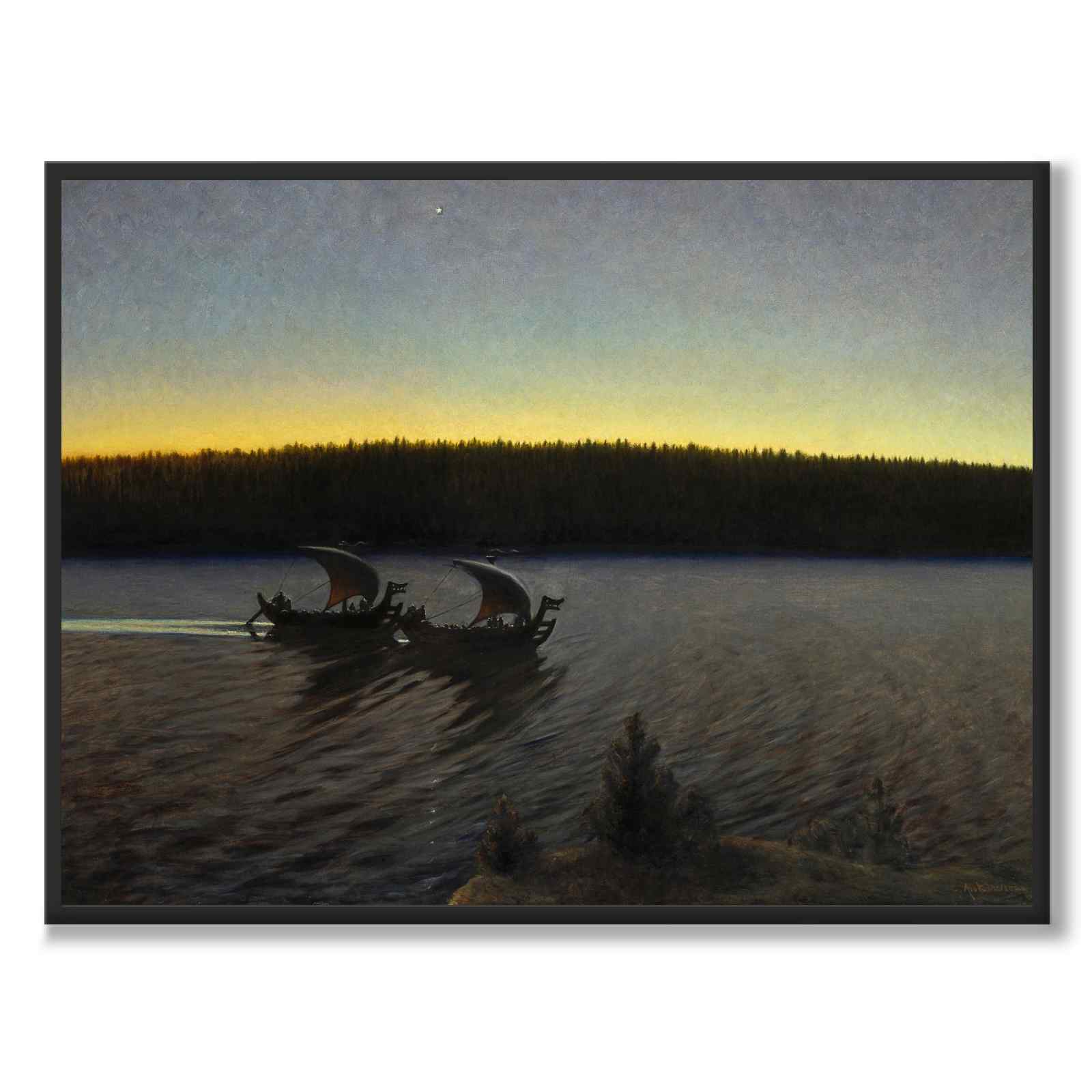 Plakat med maleriet Fordomtima malt av Gustaf Ankarcrona i 1897. Motivet viser to vikingskip som glir over det stille vannet en tidlig kveld i Sverige. Fordomtima er et eldre svensk ord og betyr Tidligere . Gustaf Ankarcrona var en svensk kunstner også kjent for sitt engasjement i tidlig gårdspleie, spesielt i Dalarna.