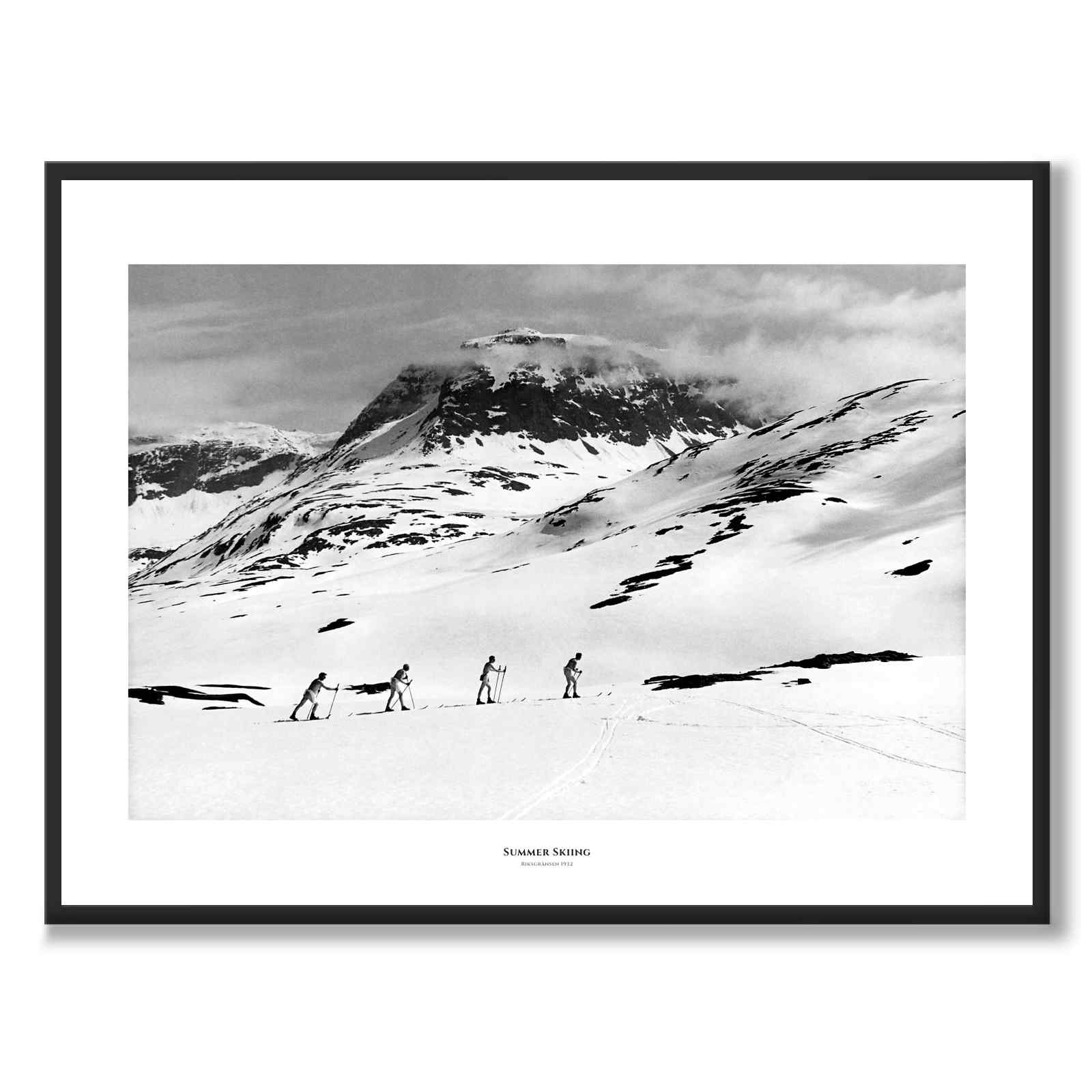 Svart-hvitt plakat med vintagefotografi fra midtsommer i Riksgränsen i 1934. Bildet viser en solrik, og trolig svært varm sommerdag da de fire turskiløperne kun har på seg en liten jakke og ellers er helt nakne.