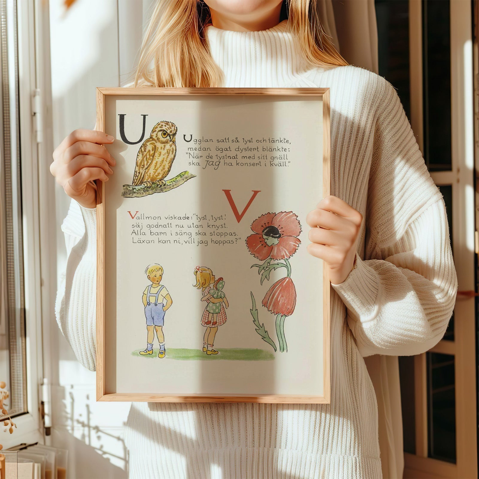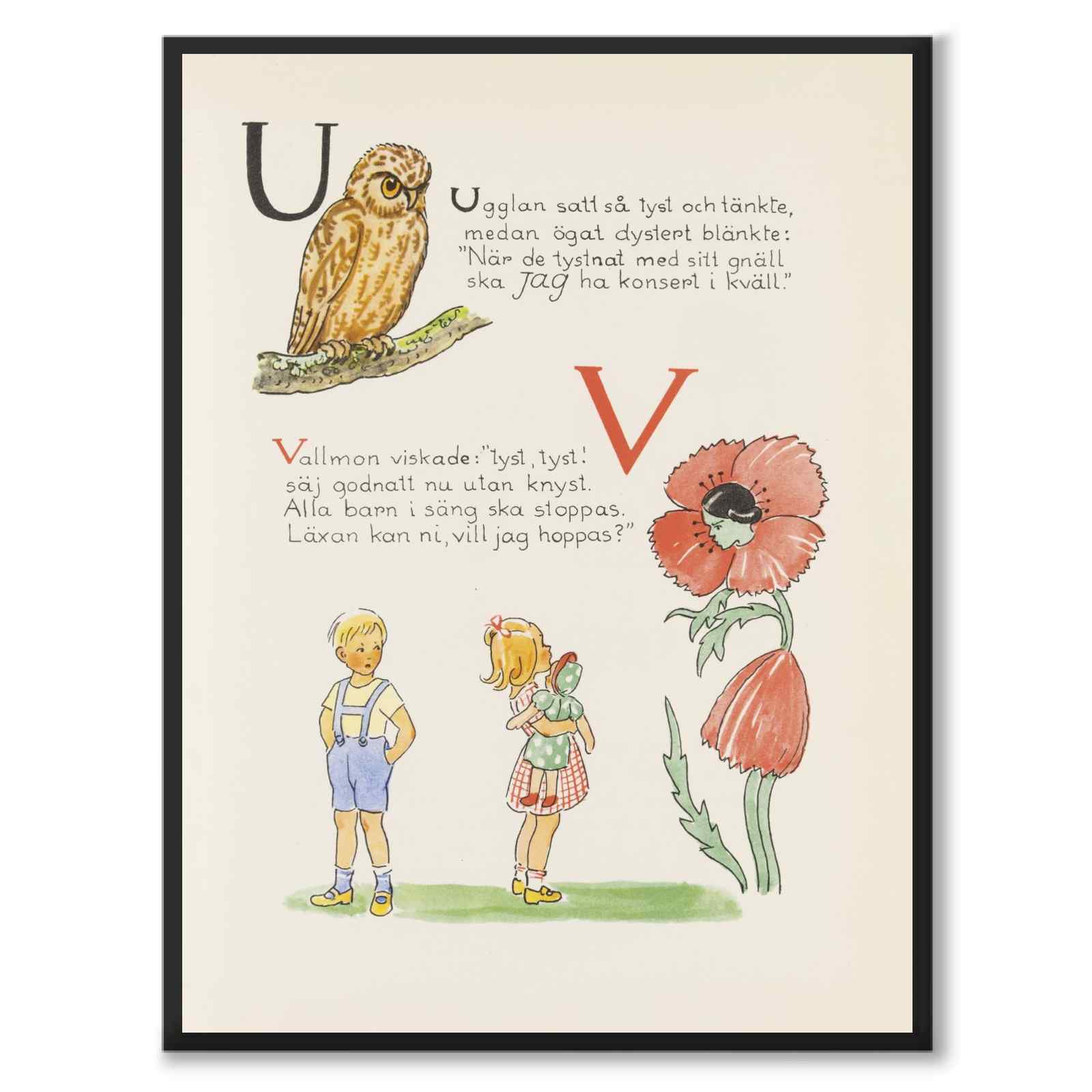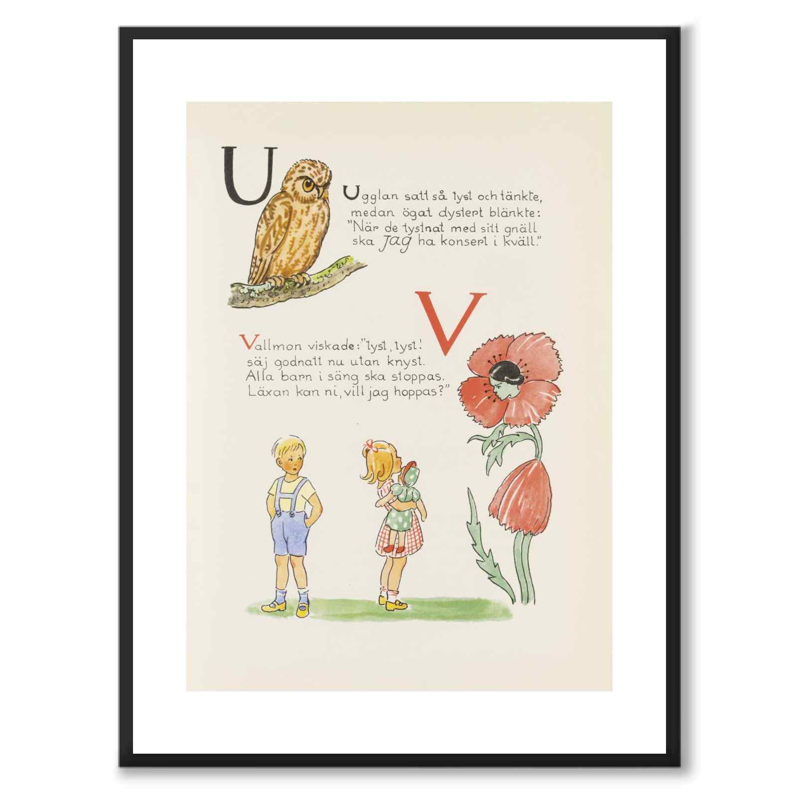 Denne illustrasjonen er fra boken «ABC Journey», skrevet av Elsa Beskow og utgitt i 1945. Boken ble brukt til å lære barna alfabetet på en underholdende og lærerik måte, da hver bokstav er knyttet til et bilde og et kort rim. På dette bildet er bokstavene U og V presentert med en ugle i øverste venstre hjørne, og en valmue i nedre høyre hjørne.