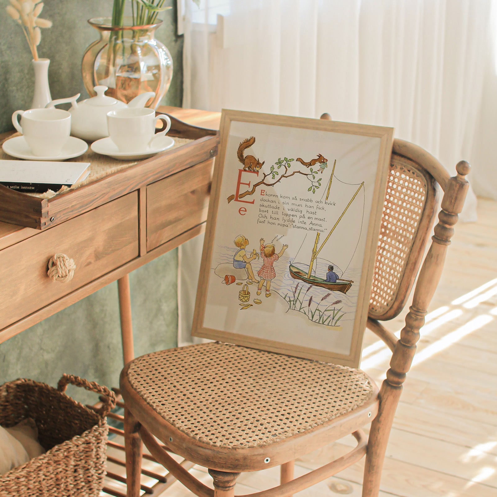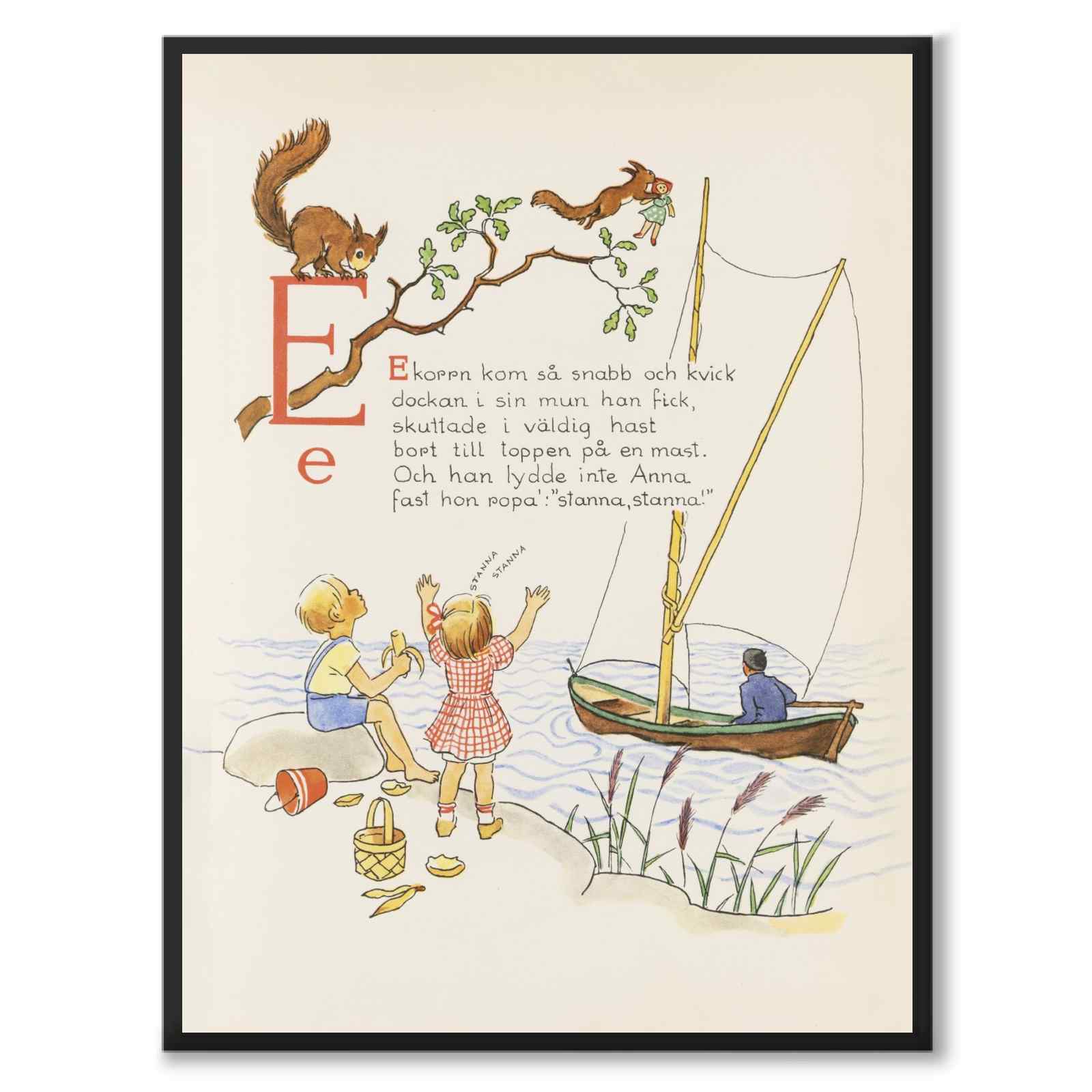 Denne illustrasjonen er fra boken «ABC Journey», skrevet av Elsa Beskow og utgitt i 1945. Boken ble brukt til å lære barna alfabetet på en underholdende og lærerik måte, da hver bokstav er knyttet til et bilde og et kort rim. I denne illustrasjonen er bokstaven E presentert med et bilde av et ekorn som hopper fremover.
