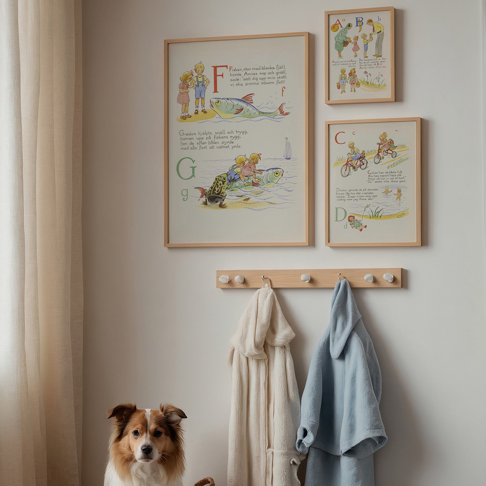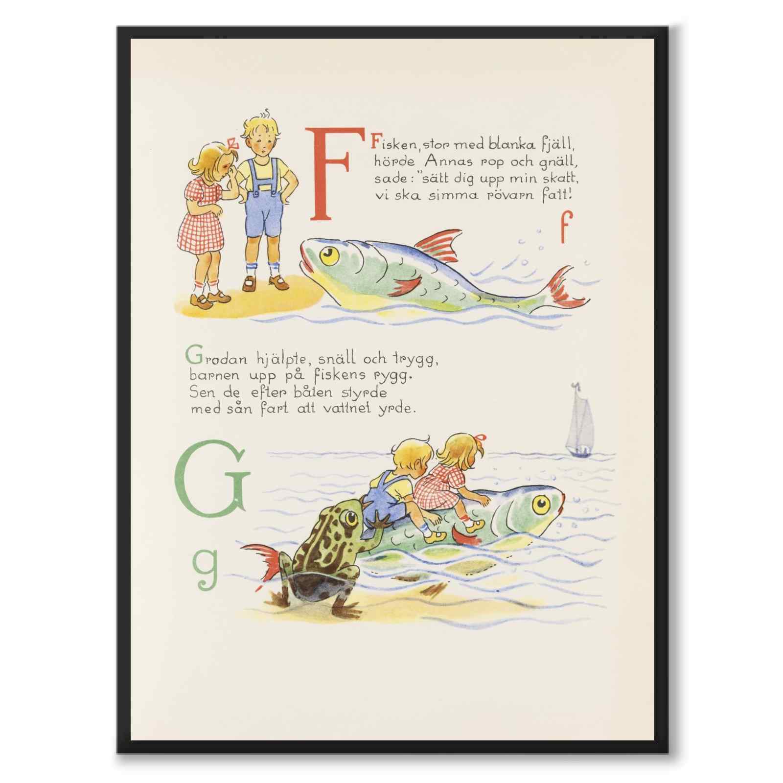 Denne illustrasjonen er fra boken «ABC Journey», skrevet av Elsa Beskow og utgitt i 1945. Boken ble brukt til å lære barna alfabetet på en underholdende og lærerik måte, da hver bokstav er knyttet til et bilde og et kort rim. Dette bildet viser bokstavene F & G, med illustrasjoner av en fisk og en frosk.