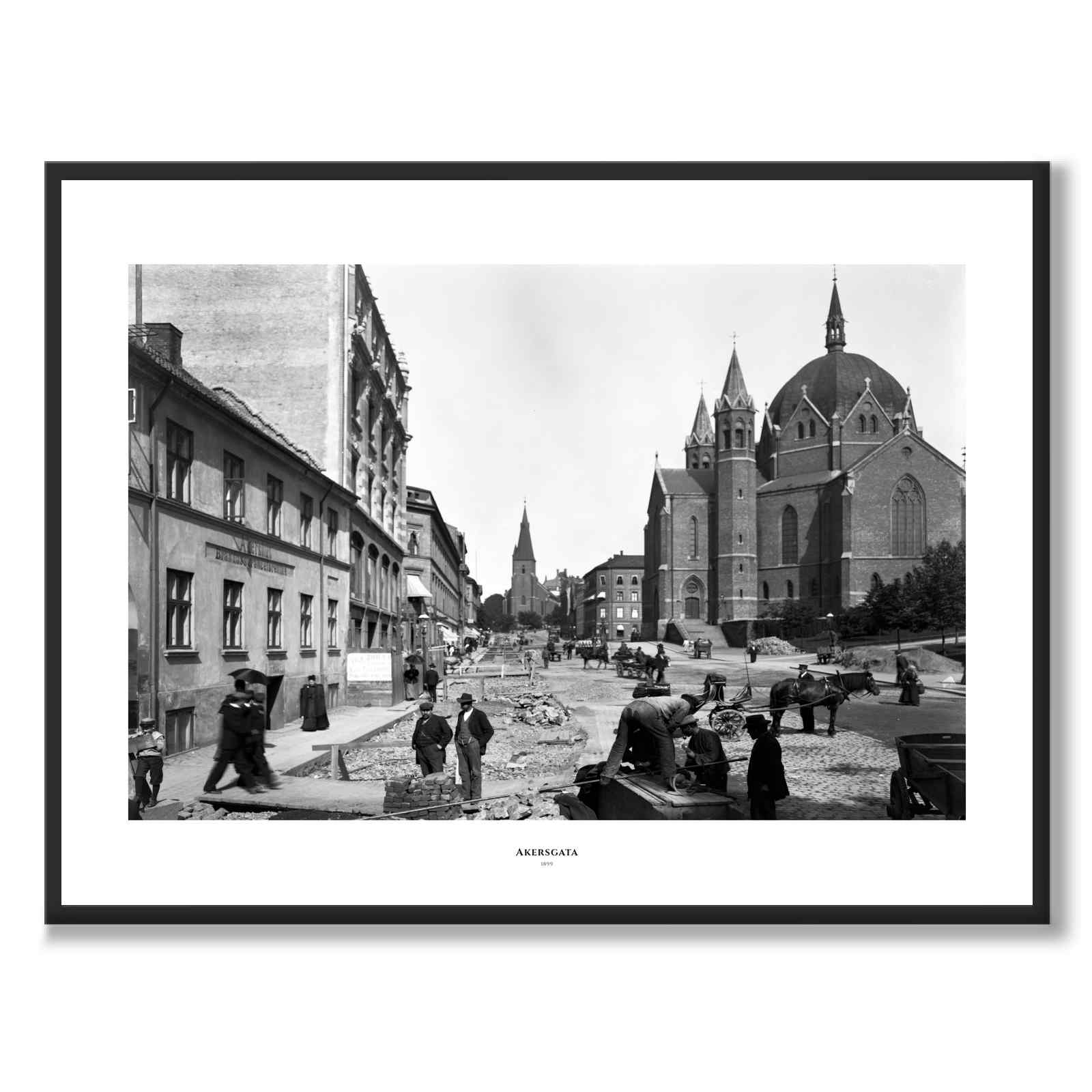 Plakat med fotografi av Akersgata i Oslo i 1899.