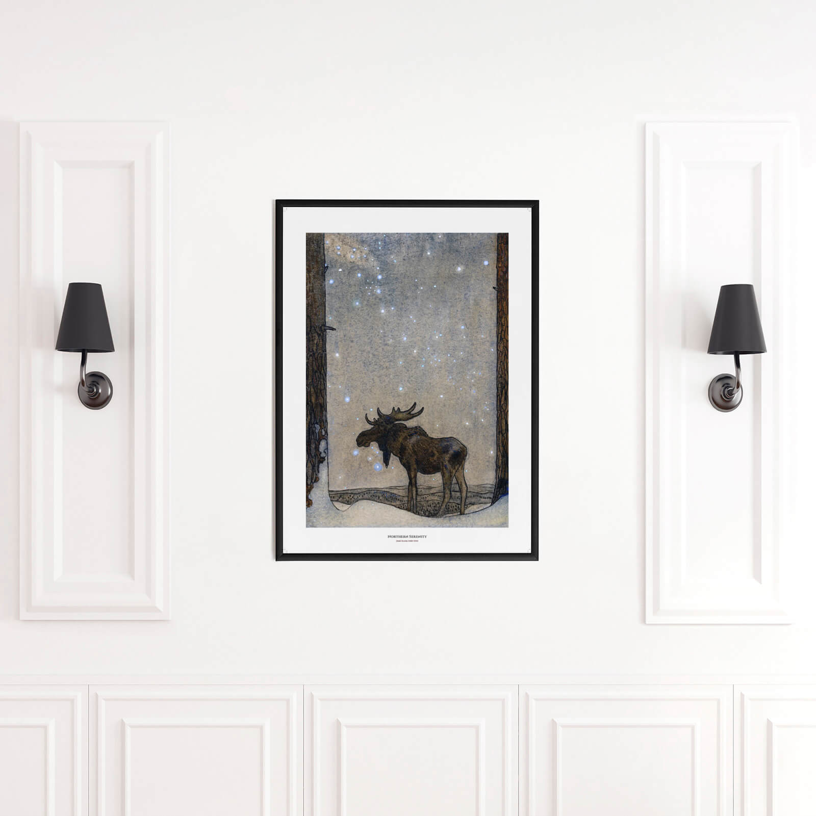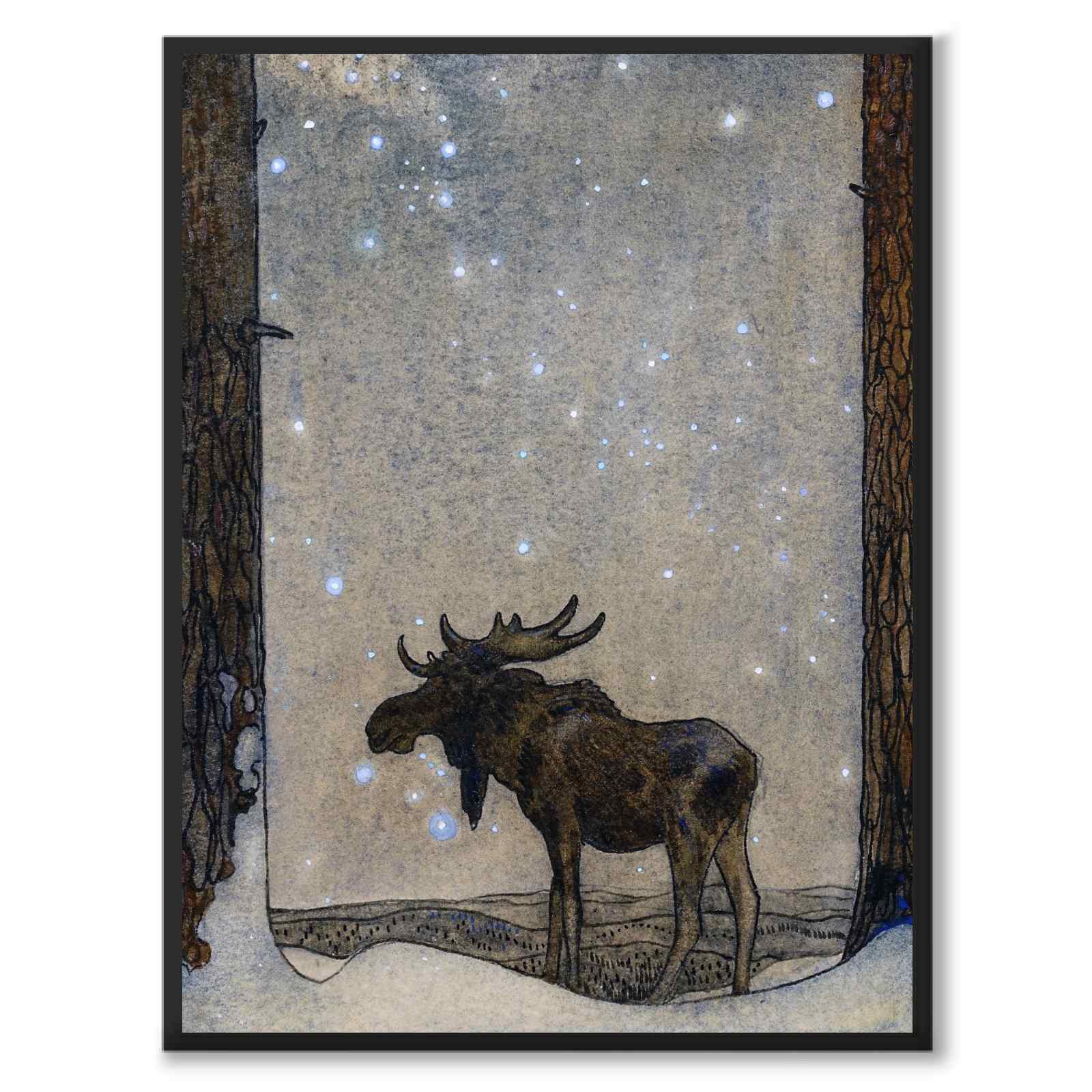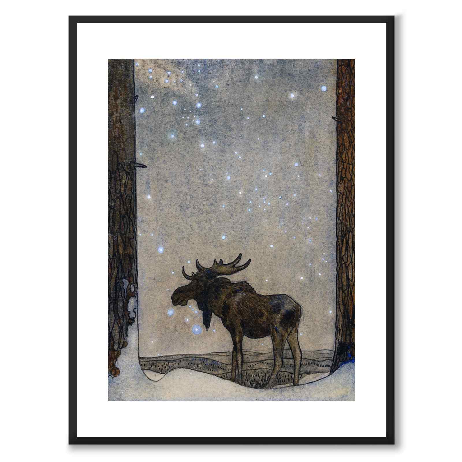Plakat med maleriet Elgskytterne av John Bauer fra 1912. Motivet viser en stor elgokse i et vidstrakt skoglandskap mot en magisk stjernehimmel. John Bauer er kjent for sine eventyrmotiver med troll og prinsesser og han har hatt stor innflytelse på svensk folklore og historiefortelling.