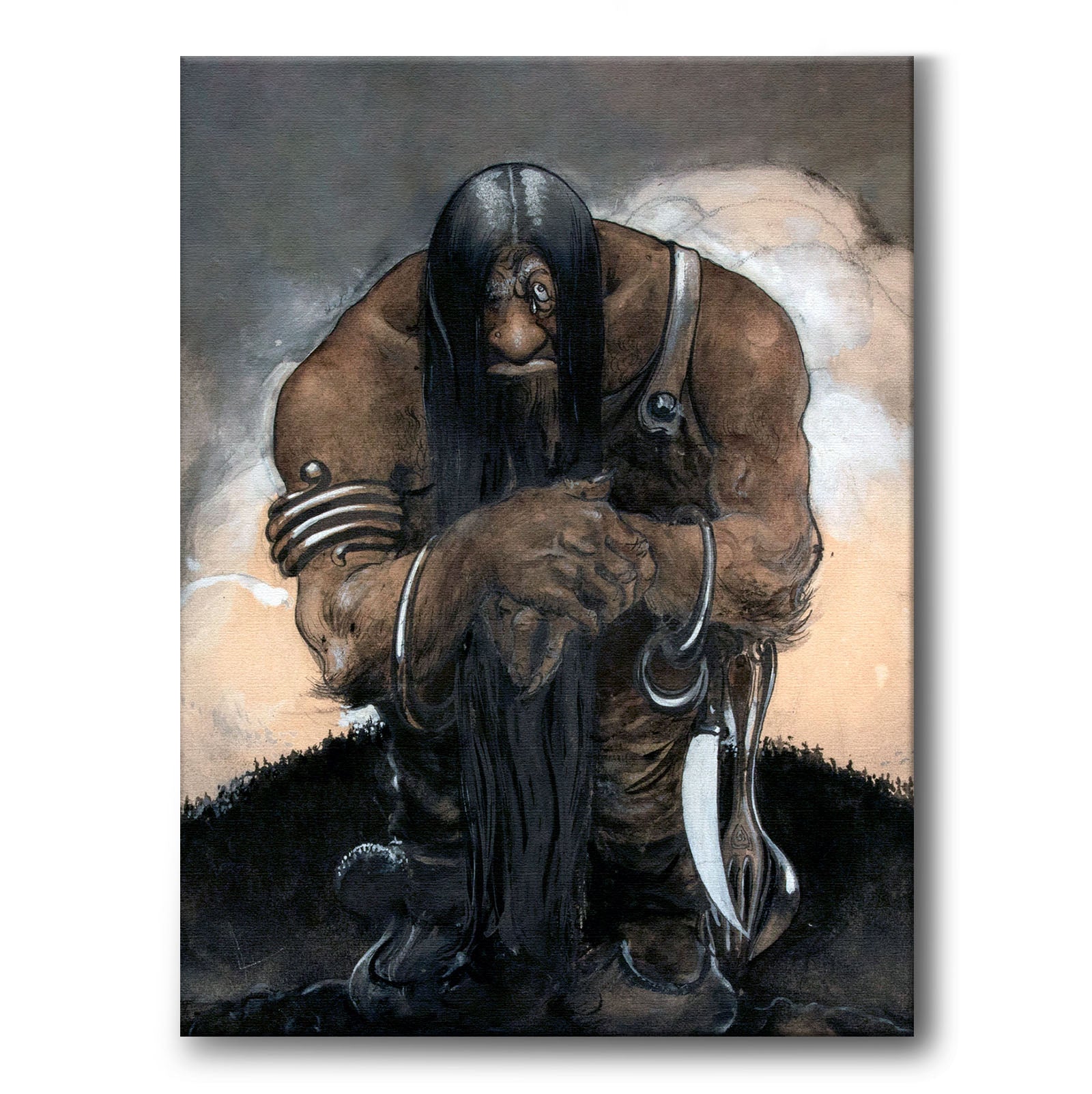 Lerret med maleriet An Old Mountain Goblin av John Bauer fra 1904. En t rolle fra fjellet med langt mørkt hår står på et skogkledd fjell. På armene henger armringer samt kniv, gaffel og skje. Maleriet var en illustrasjon til Gustaf Frödings dikt Ett gammelt fjelltroll i Snöflingan: barnejulemagasin .