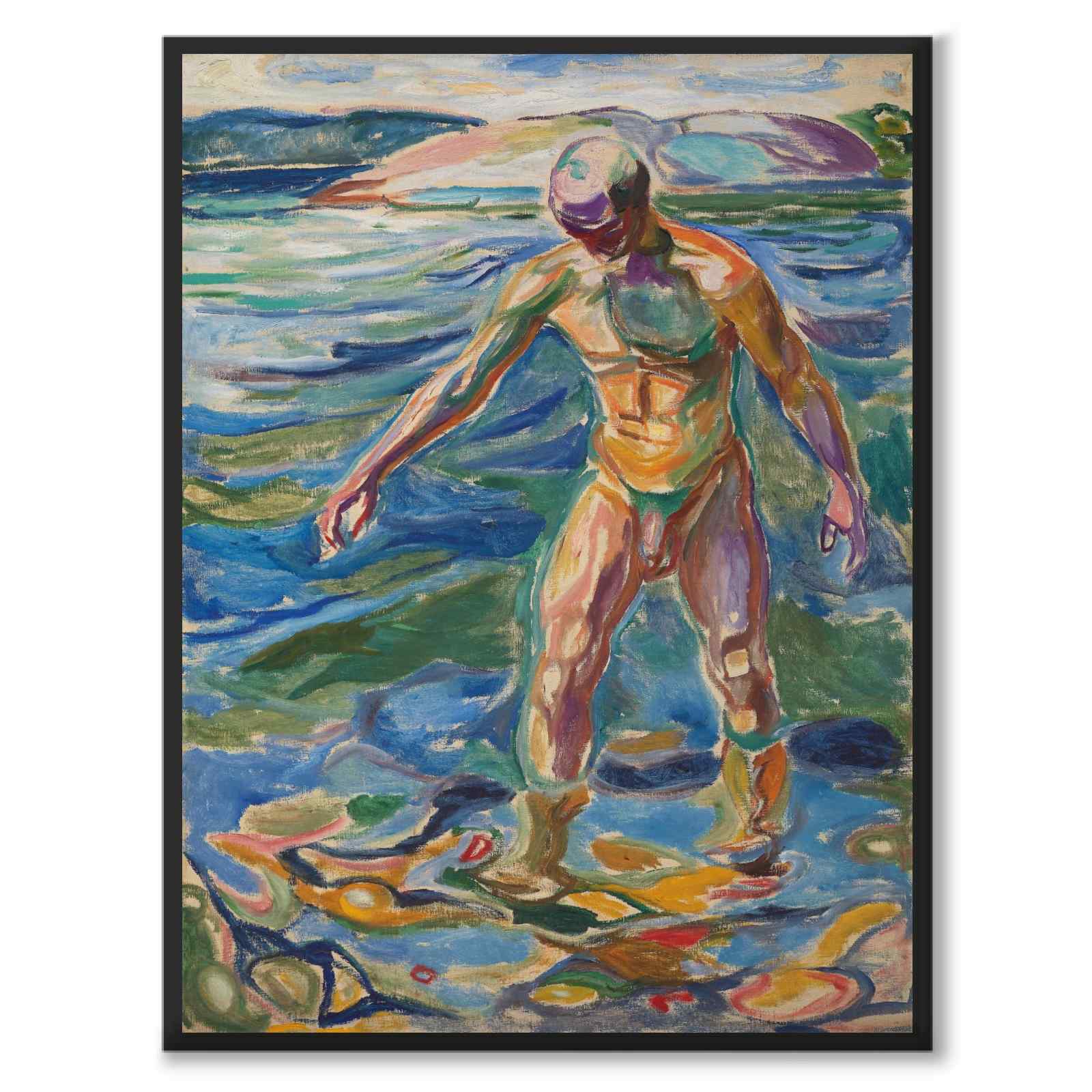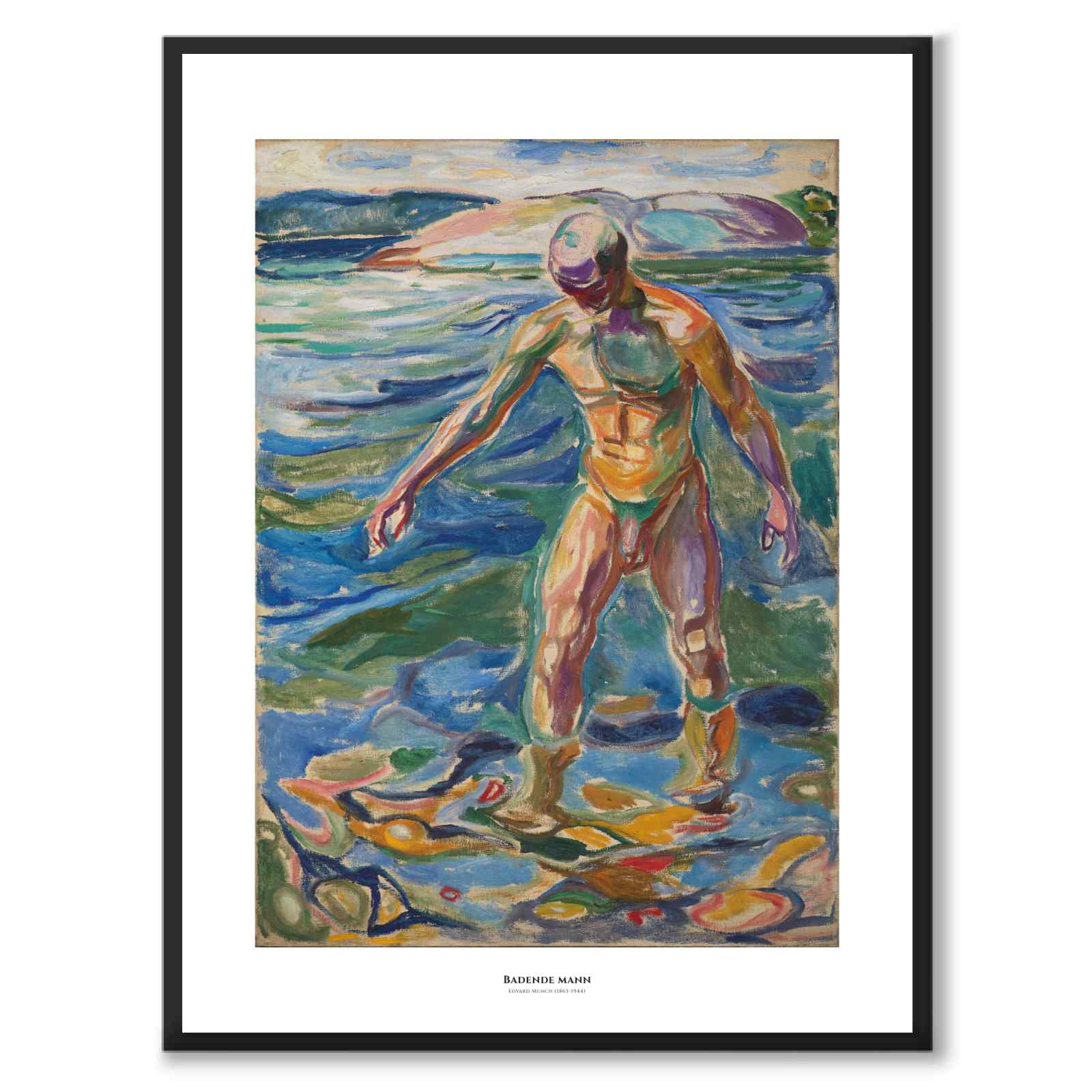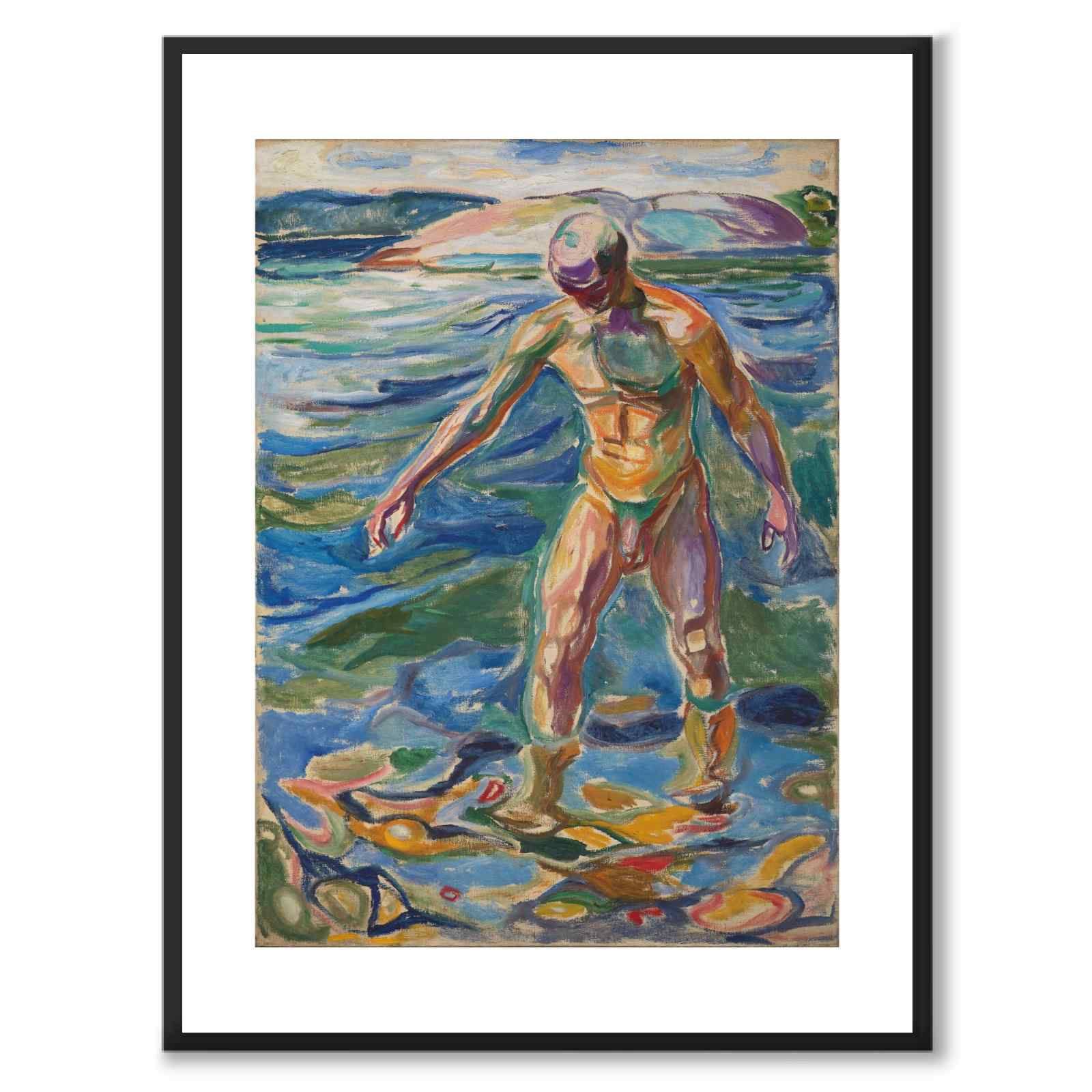 Maleriet forestiller en mann som bader i vann og er et eksempel på Munchs senere verk der han eksperimenterer med farge og form for å uttrykke følelser og eksistensielle temaer. Mannen som står i vannet kan sees på som et uttrykk for renselse, men også som en måte å utforske emosjonelle og psykologiske tilstander på.