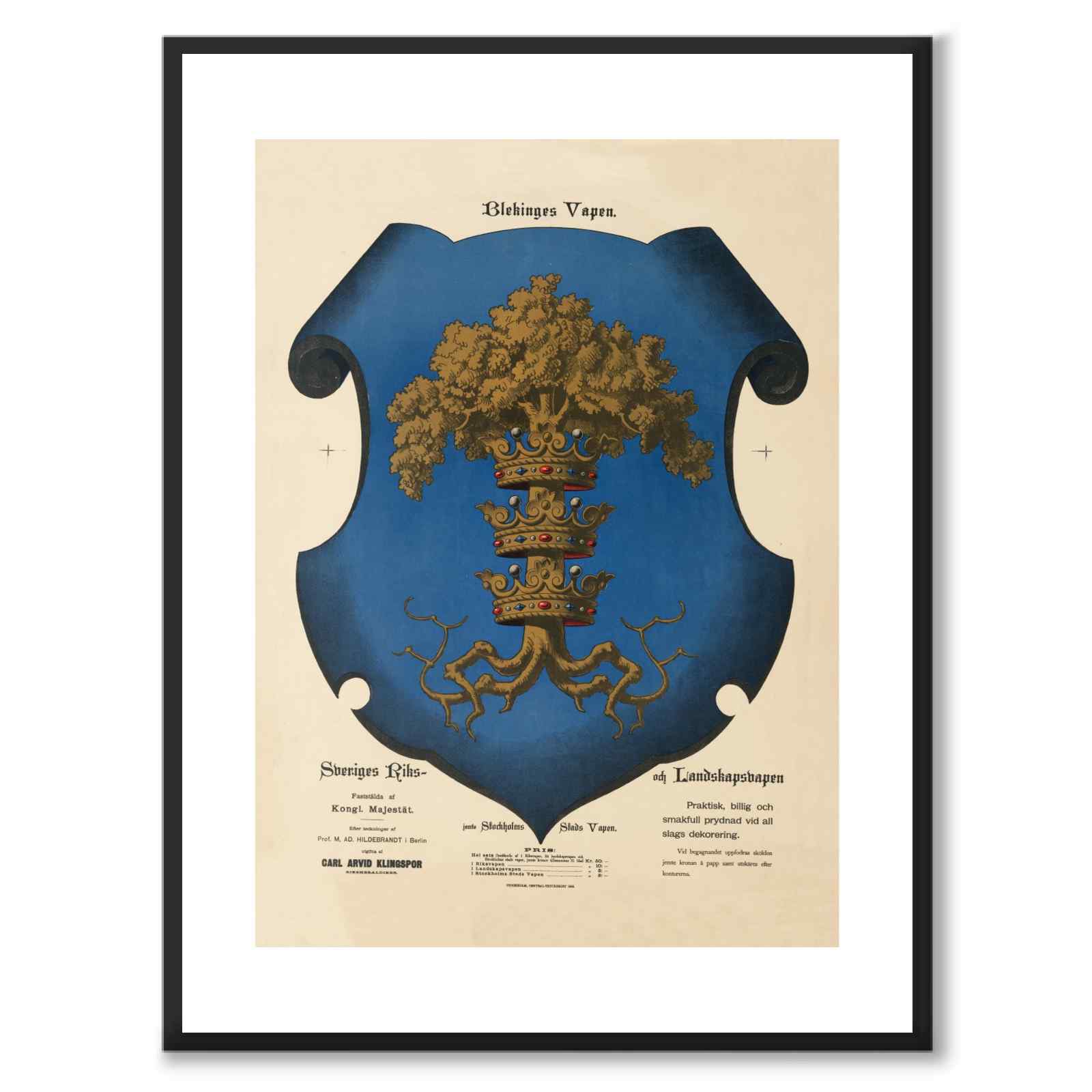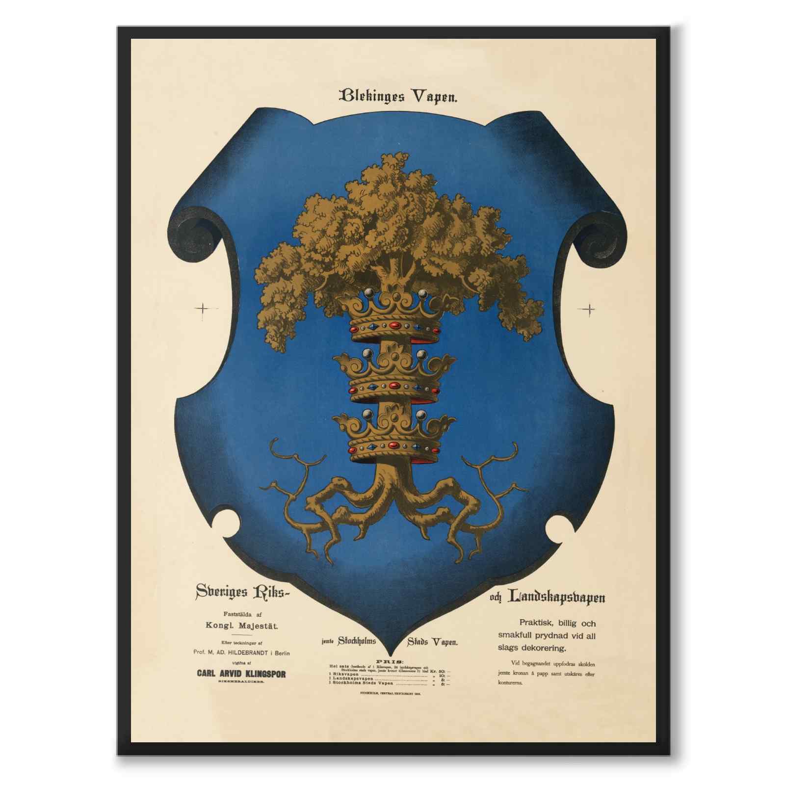 Teksten over våpenskjoldet lyder: Blekinges Vapen . Nederst til venstre står det: "Sveriges Riks- och Landshapensvapen. Fastställda af Kongl. Majestät. Efter teckningar af Prof. M. AD. Hildebrandt i Berlin. Utgifna af Carl Arvid Klingspor."