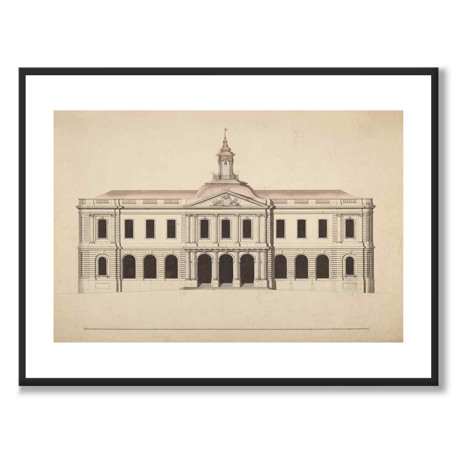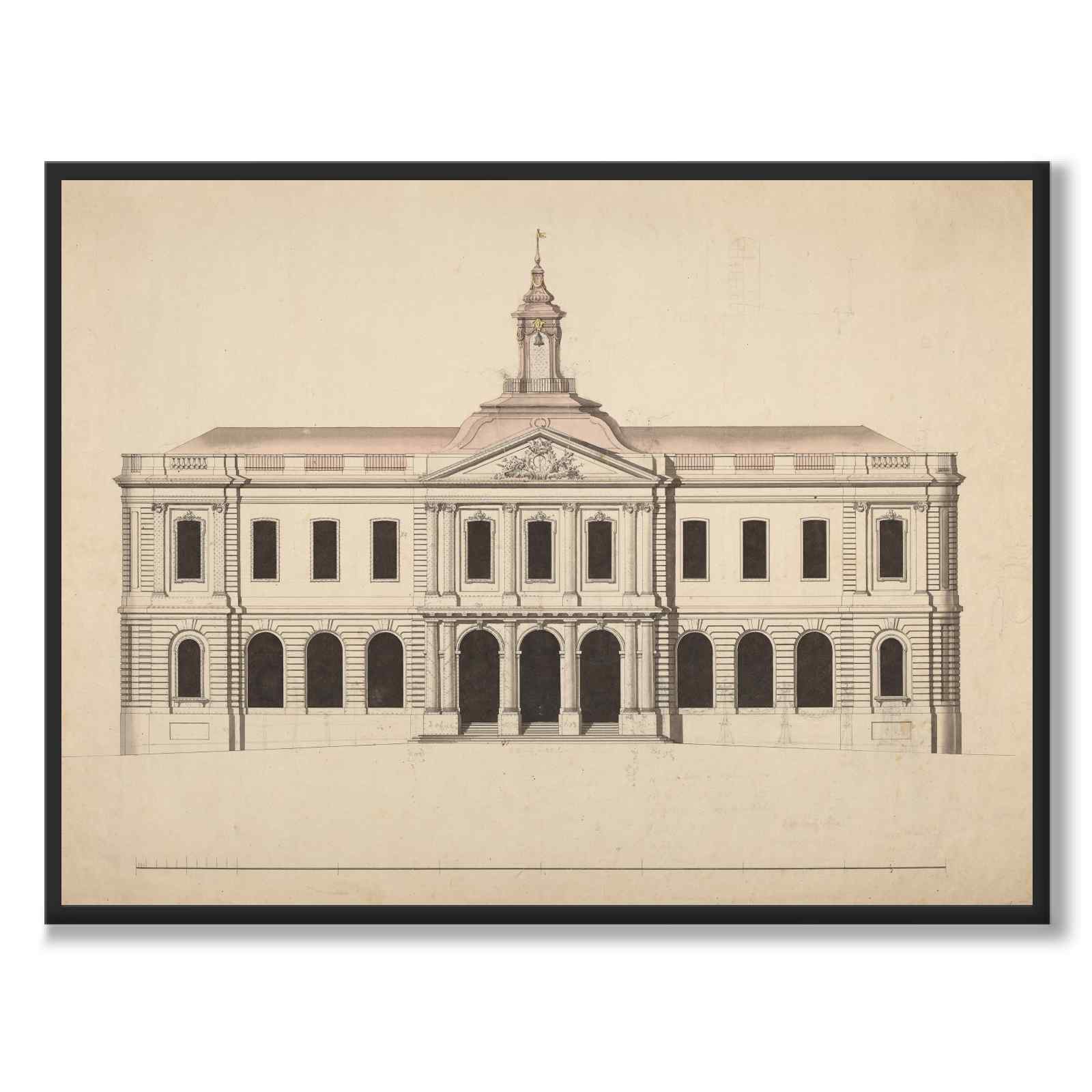 Plakaten viser en tegning av Børsbygningen på Stortorget i Gamla Stan, Stockholm, som ble innviet i 1776 og ferdigstilt i 1778. Bygget var et av de viktigste offentlige prosjektene for byen på den tiden, og etter mange forslag fikk dette endelige forslaget borgerskapets tilslutning. Børsen var et viktig senter for handel og finans og reflekterte tidens arkitektoniske idealer med en klassisistisk utforming.