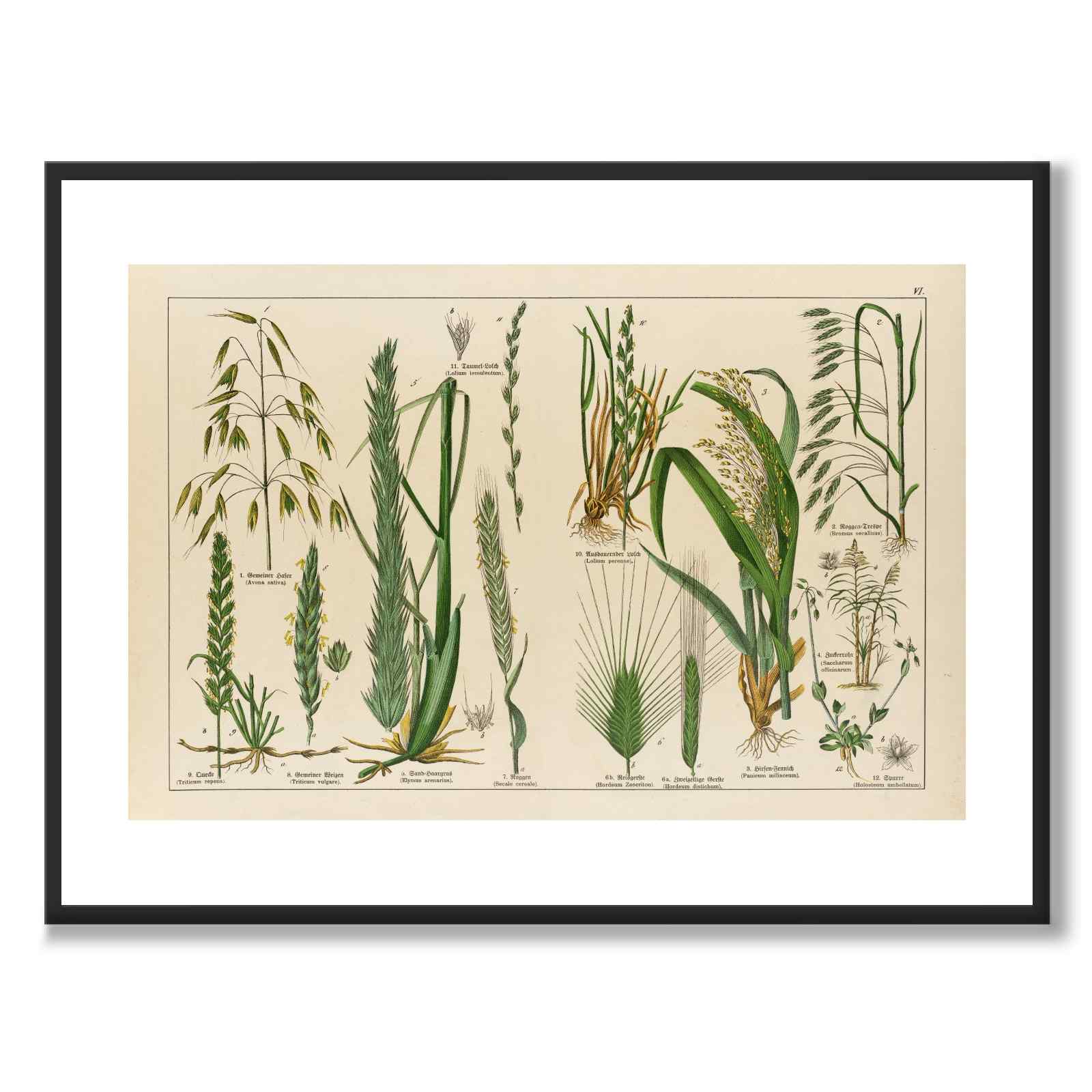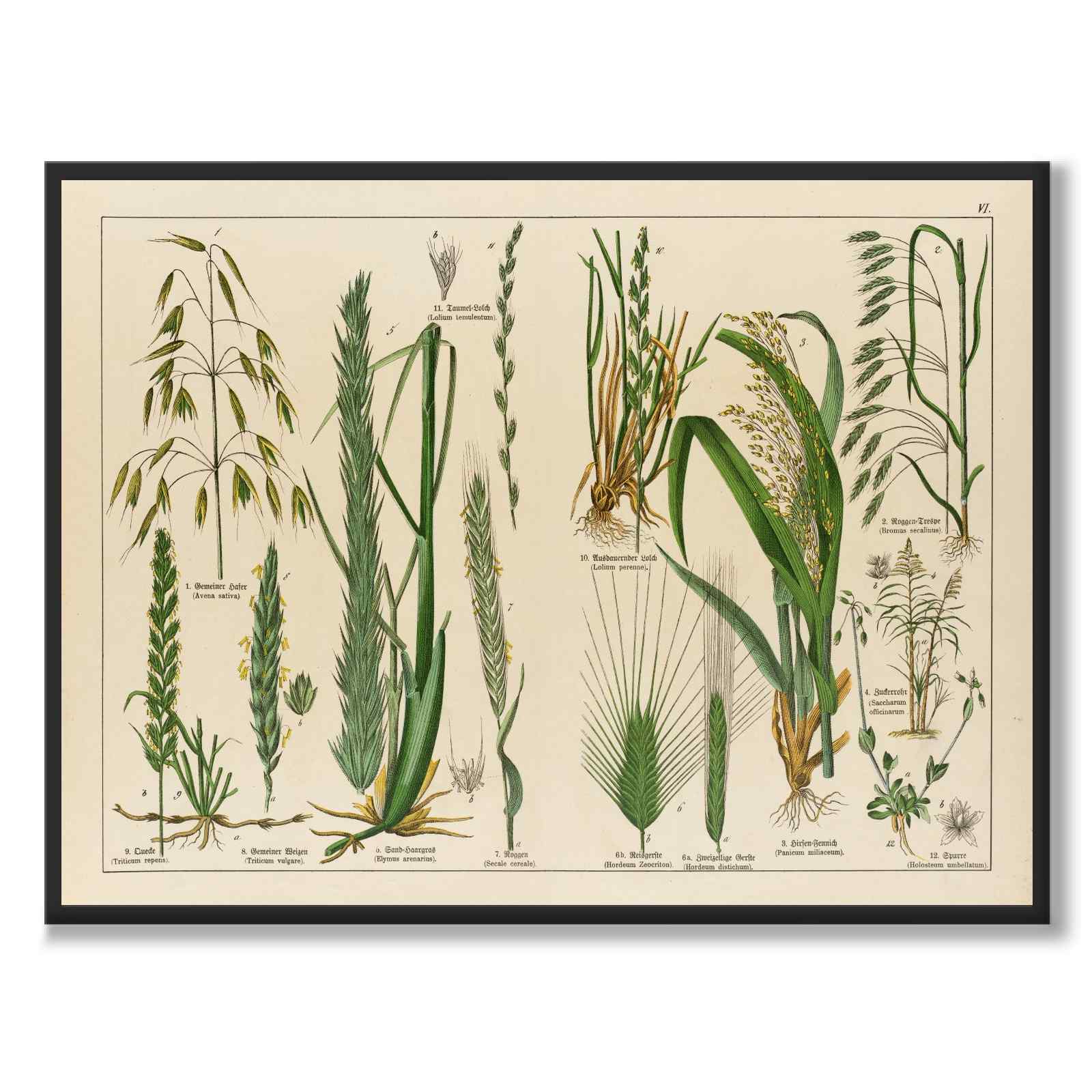 En botanisk, vintage plakat med forskjellige typer korn, merket med deres vitenskapelige og latinske navn.