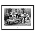 Plakat med en gruppe unge menn som så på når to slåss på 1930-tallet. De er trolig klassekamerater og står utenfor en skole, steinbygningen ser vi i bakgrunnen.