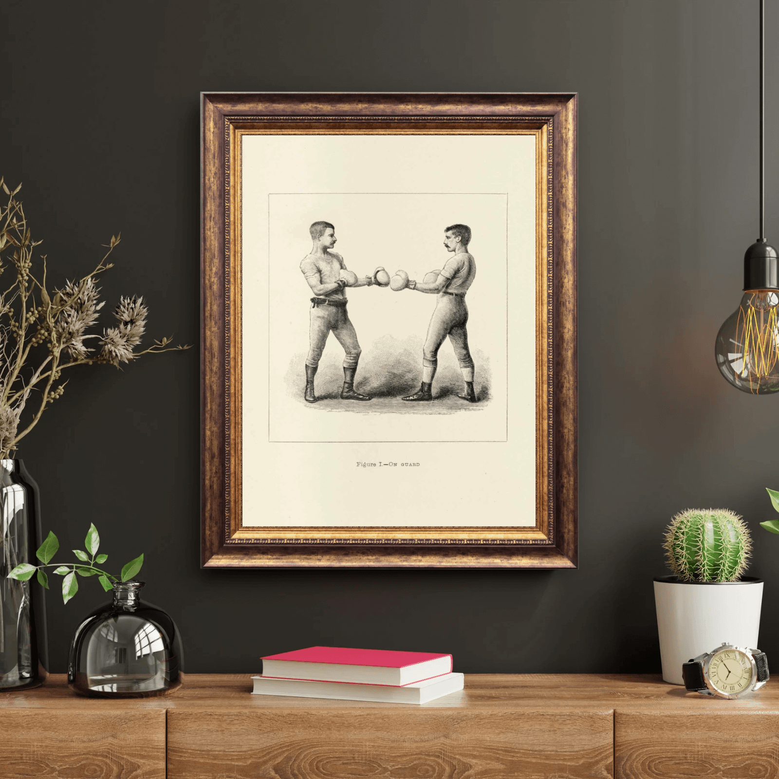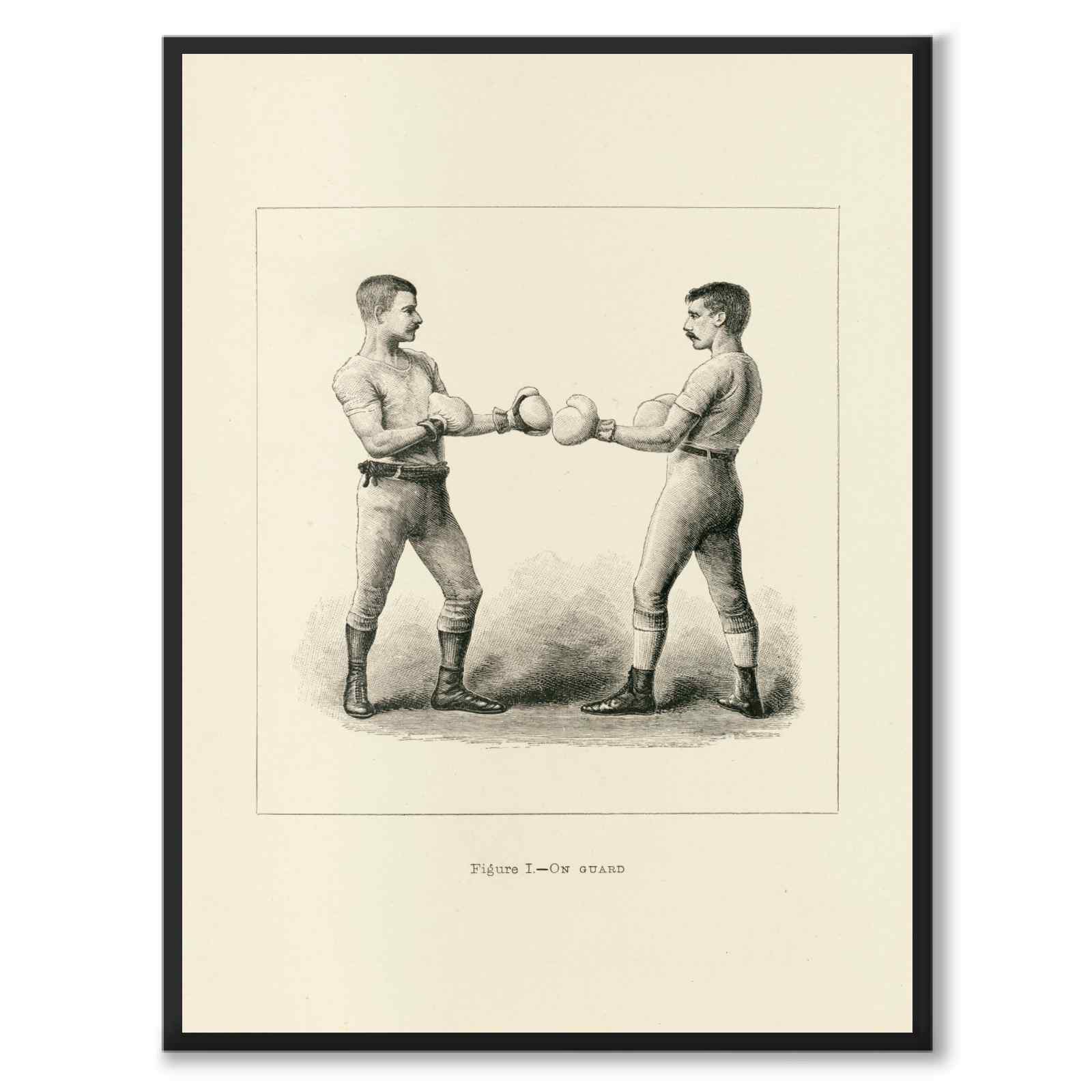 Bokseillustrasjonsplakat fra den litterære serien The Badminton Library of Sports and Pastimes . På bildet ser vi to menn klare til å bokse med knyttnevene opp foran kroppen. Under dem ser vi tittelteksten Figur 1 - På vakt .