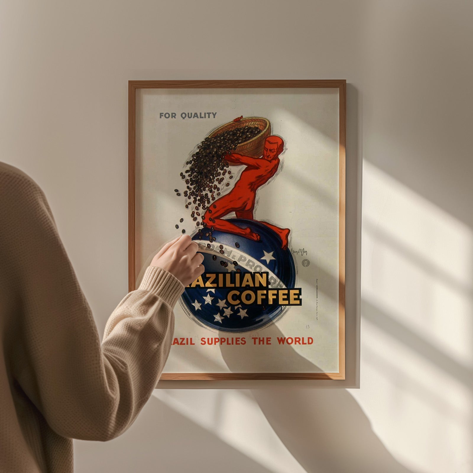 Illustrasjonen promoterer en brasiliansk kaffe og er et klassisk eksempel på reklameplakater fra tidlig på 1900-tallet. Bildet består av en iøynefallende illustrasjon av en rød figur som bærer en sekk kaffe og står på en jordklode. Kaffebønner renner fra sekken, og understreker at Brasil er en dominerende aktør innen kaffeproduksjon i verden.