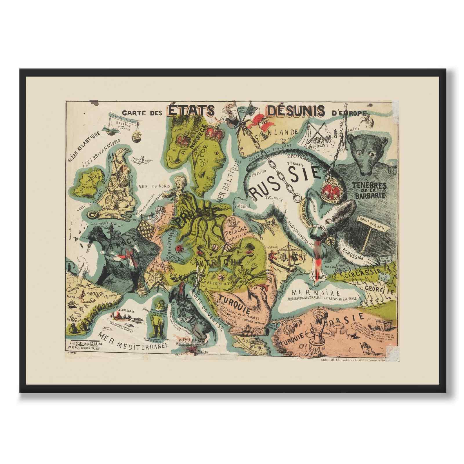 På bildet ser vi en oversikt over Europa, illustrert på en kreativ måte. Vi ser blant annet Norge som inneholder et ansikt med kongekrone, samt Sverige med, det som kan tolkes som, en fisk med kongekrone.