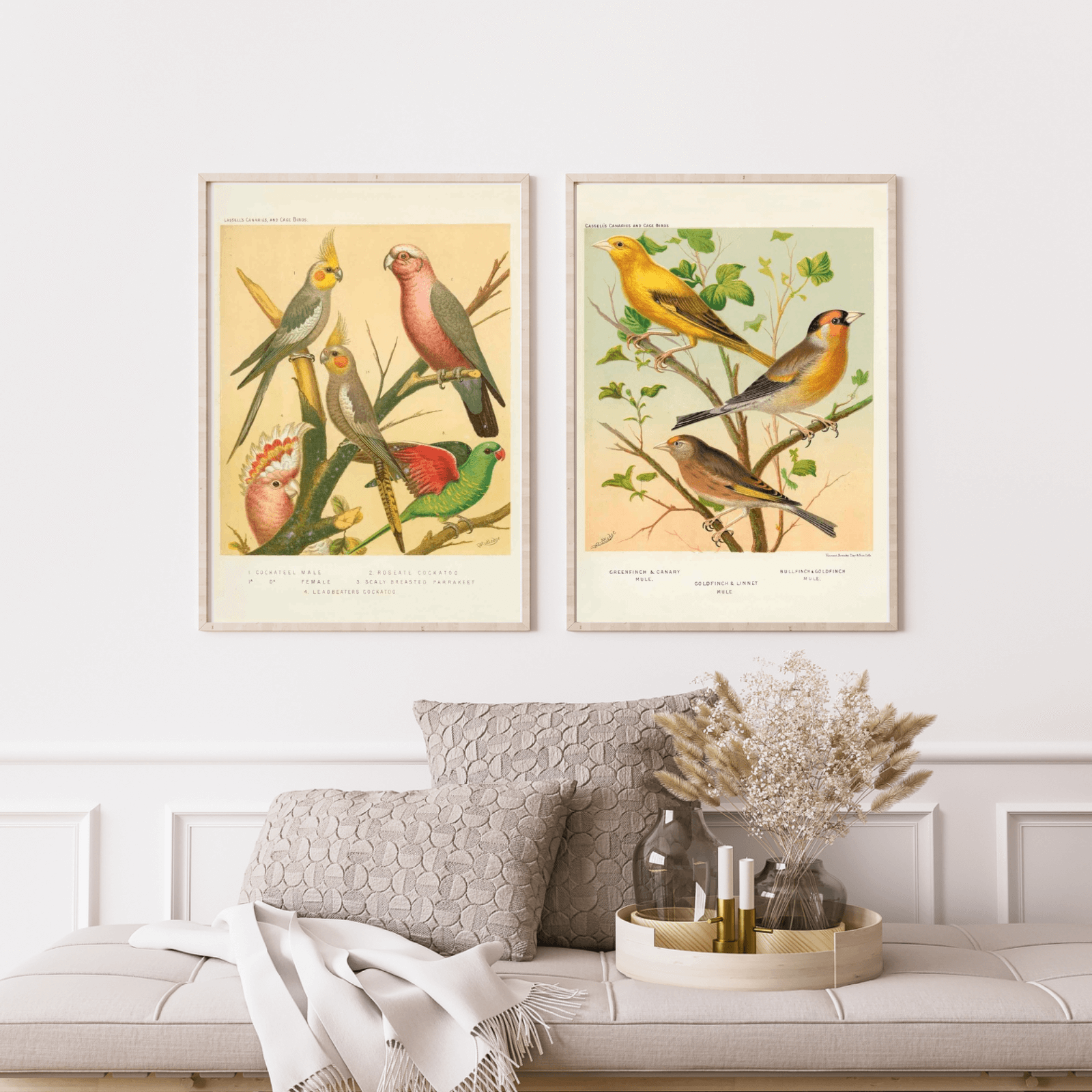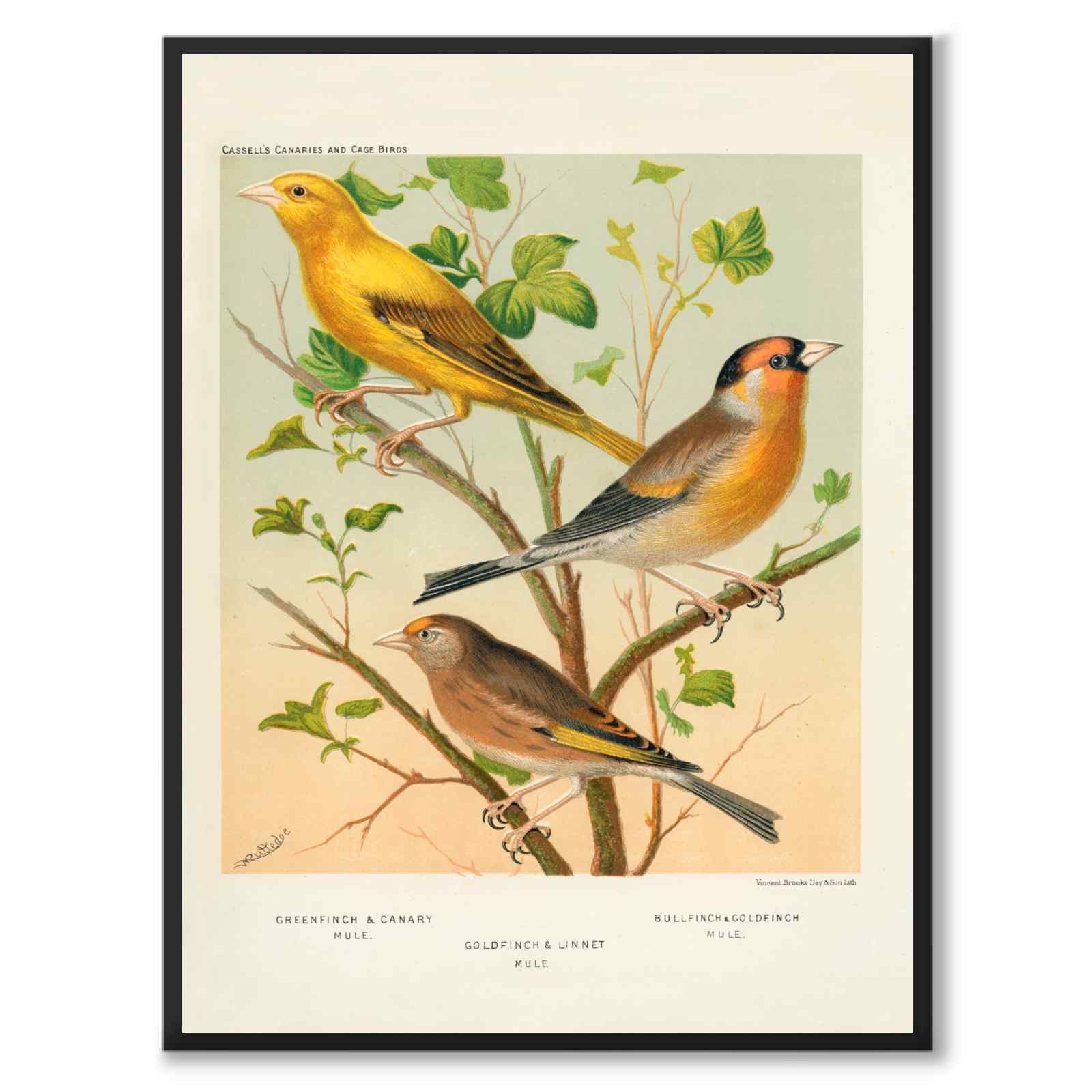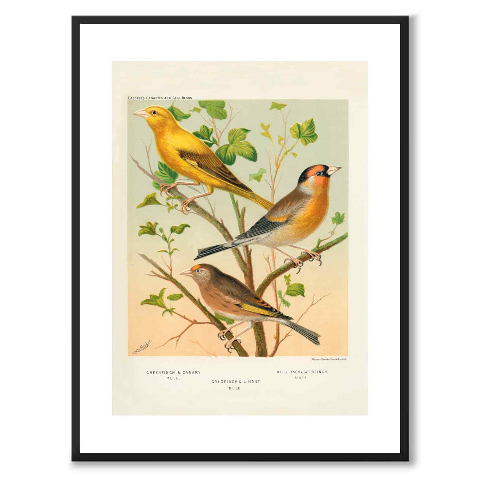 Plakat med illustrasjonen Cassel fra boken The Illustrated Book of Canaries and Cage-Birds . I denne illustrasjonen ser vi artene Gullfink og Linnet Mule.