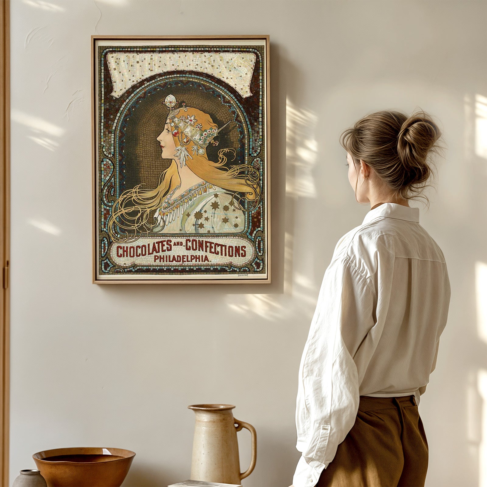 Plakat med plakaten «Sjokolade og konfekt» av Alphonse Mucha (1860–1939) ble skapt i 1897. Plakaten reklamerer for sjokolade og konfekt, spesielt for et selskap i Philadelphia, og viser en kvinne i profil med langt gyllent hår og et forseggjort hodeplagg. Rundt henne er det dekorative detaljer som blomster og linjer, typisk for jugendstilen.