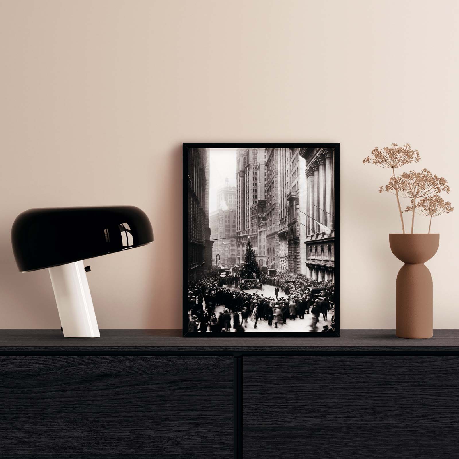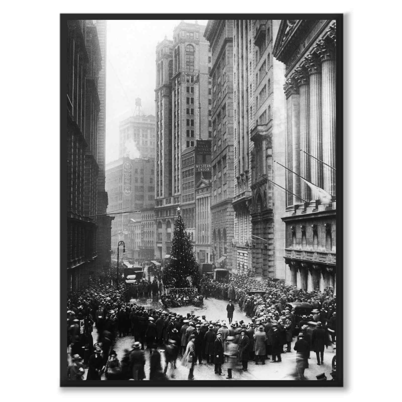 Plakat med bilde fra New York 26. desember 1925. Et stort juletre står midt i finansgaten Wall Street i New York og folk har samlet seg for å lytte til bandet som sitter ved treet. Bygningen til høyre huser New York Stock Exchange.