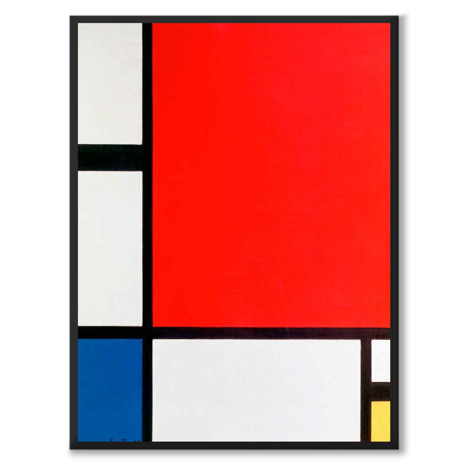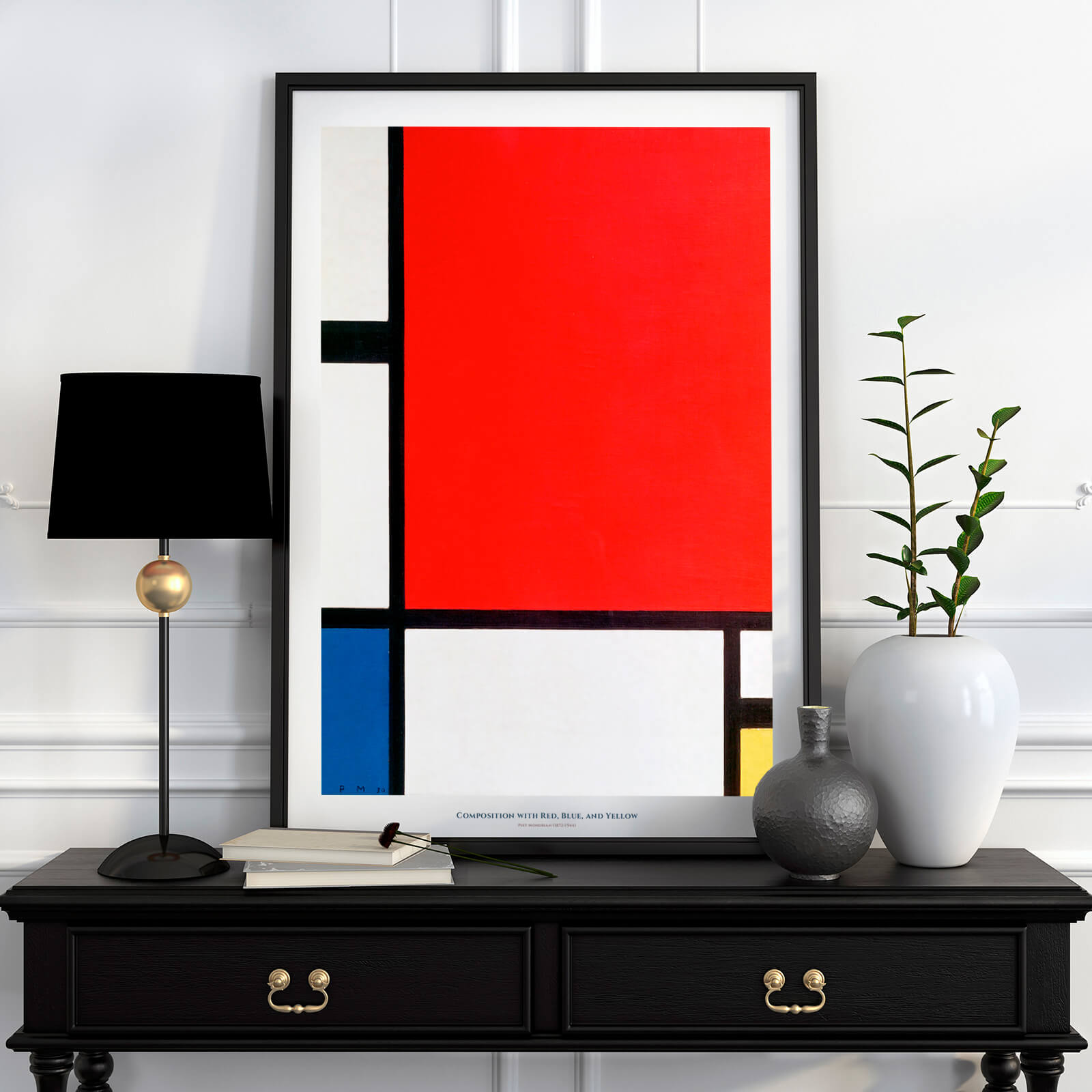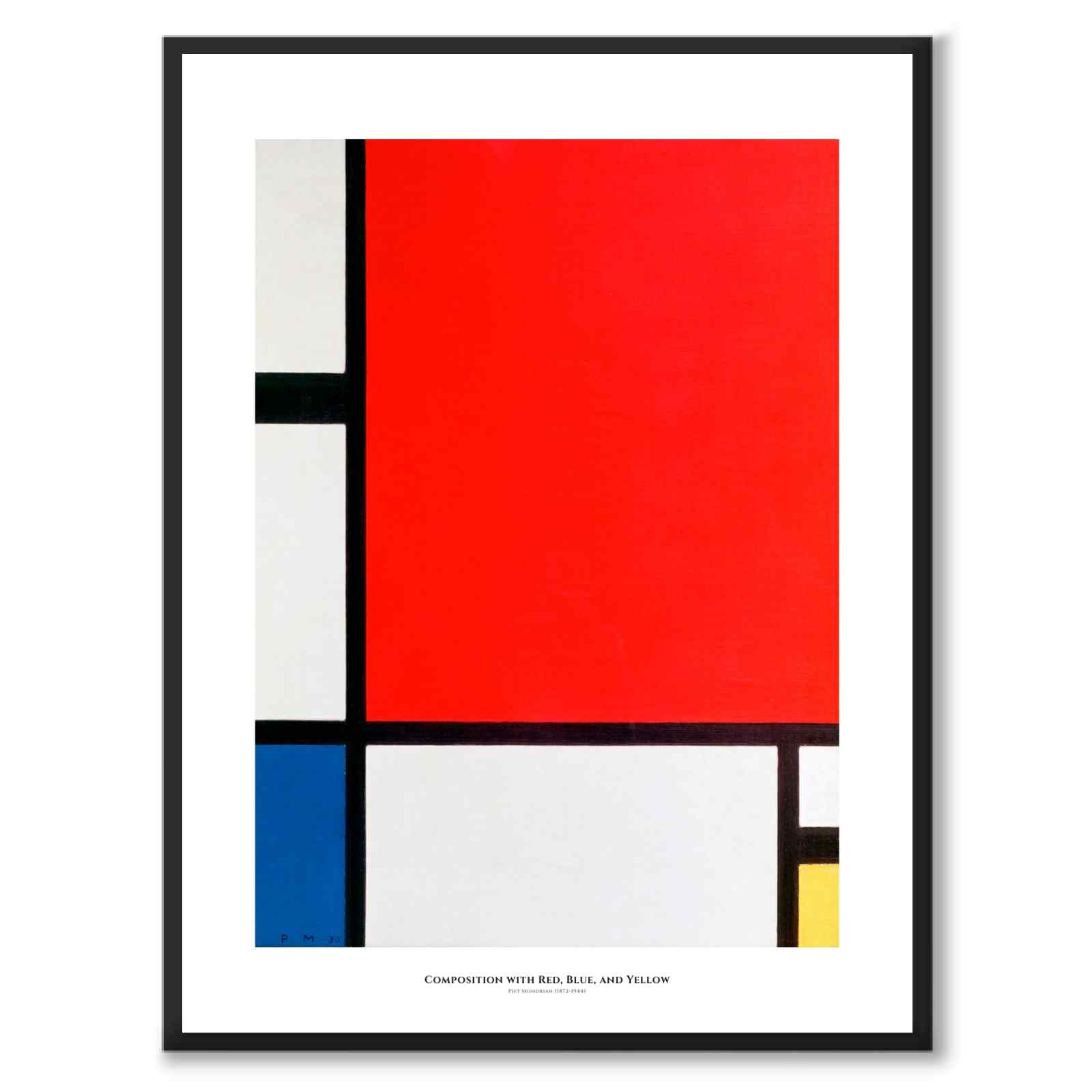 Plakat med Piet Mondrians kanskje mest kjente verk, Komposisjon med rødt, blått og gult . Original malt i olje på lerret. Piet Mondrian var en nederlandsk kunstner som levde mellom 1872 og 1944 og regnes som en av de største kunstnerne på 1900-tallet. Han var en betydelig pioner innen abstrakt kunst og veldig kjent for sine komposisjoner med geometriske former og grunnleggende farger .