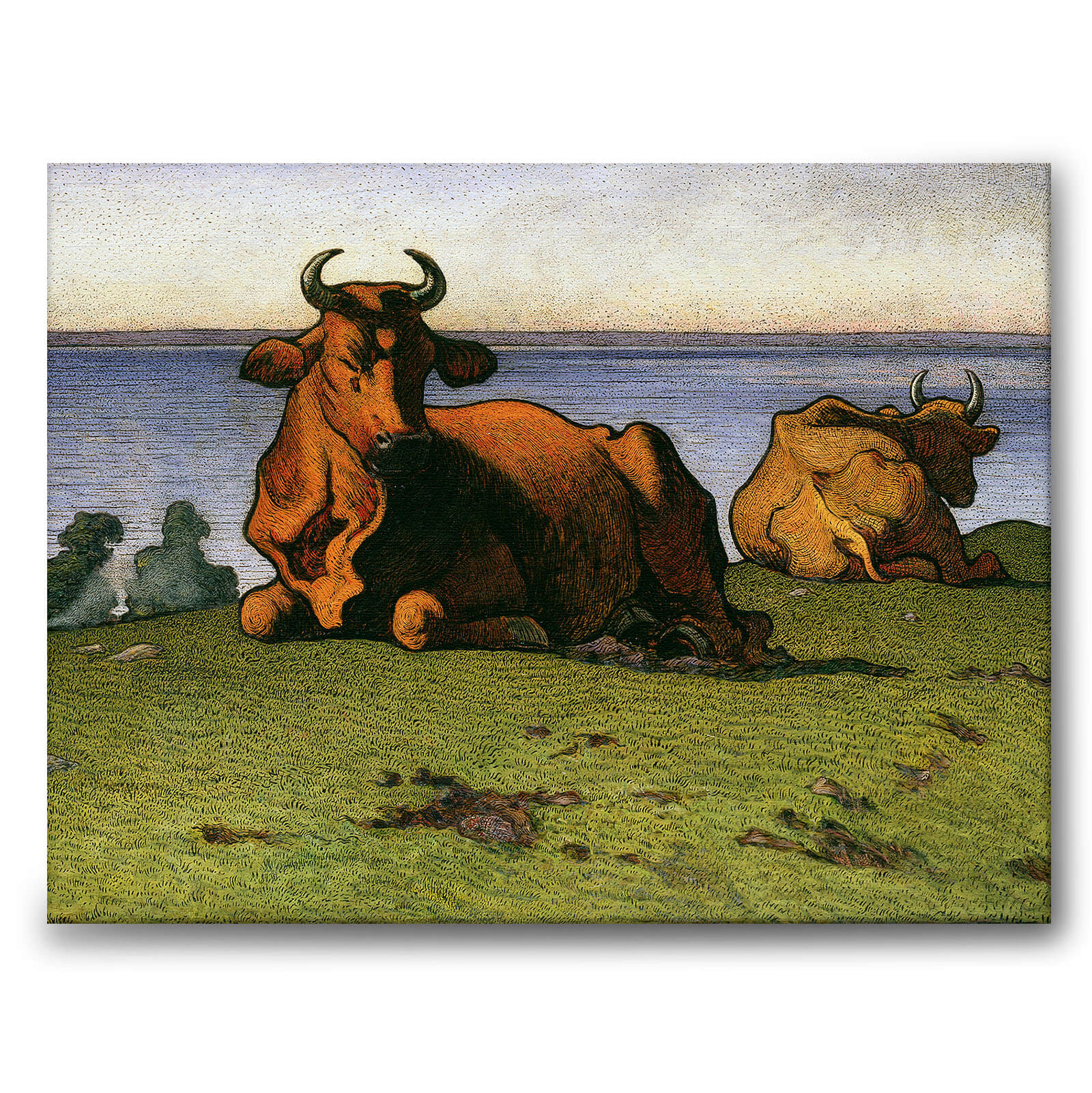 Lerret med maleriet Kuer av Nils Kreuger (1858-1930). Nils Kreuger var en kjent svensk landskapsmaler med bakgrunn fra Royal Academy of Arts og fra en privat kunstskole i Paris. Kreuger tilbrakte somrene på Öland hvor han ofte malte landskap, hester og kyr.