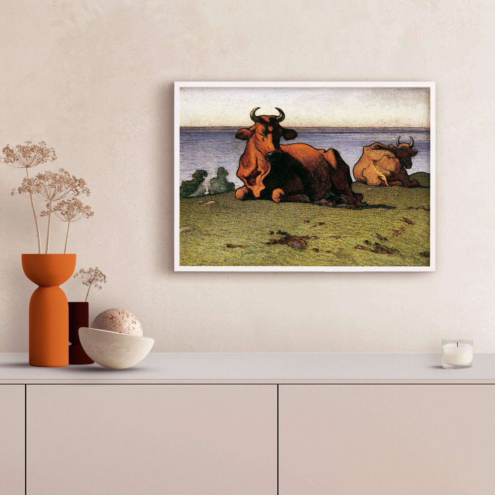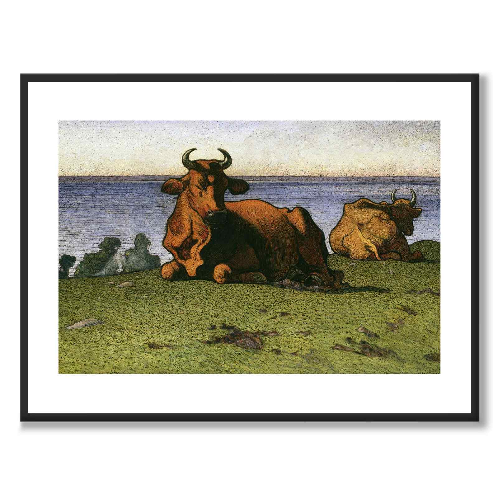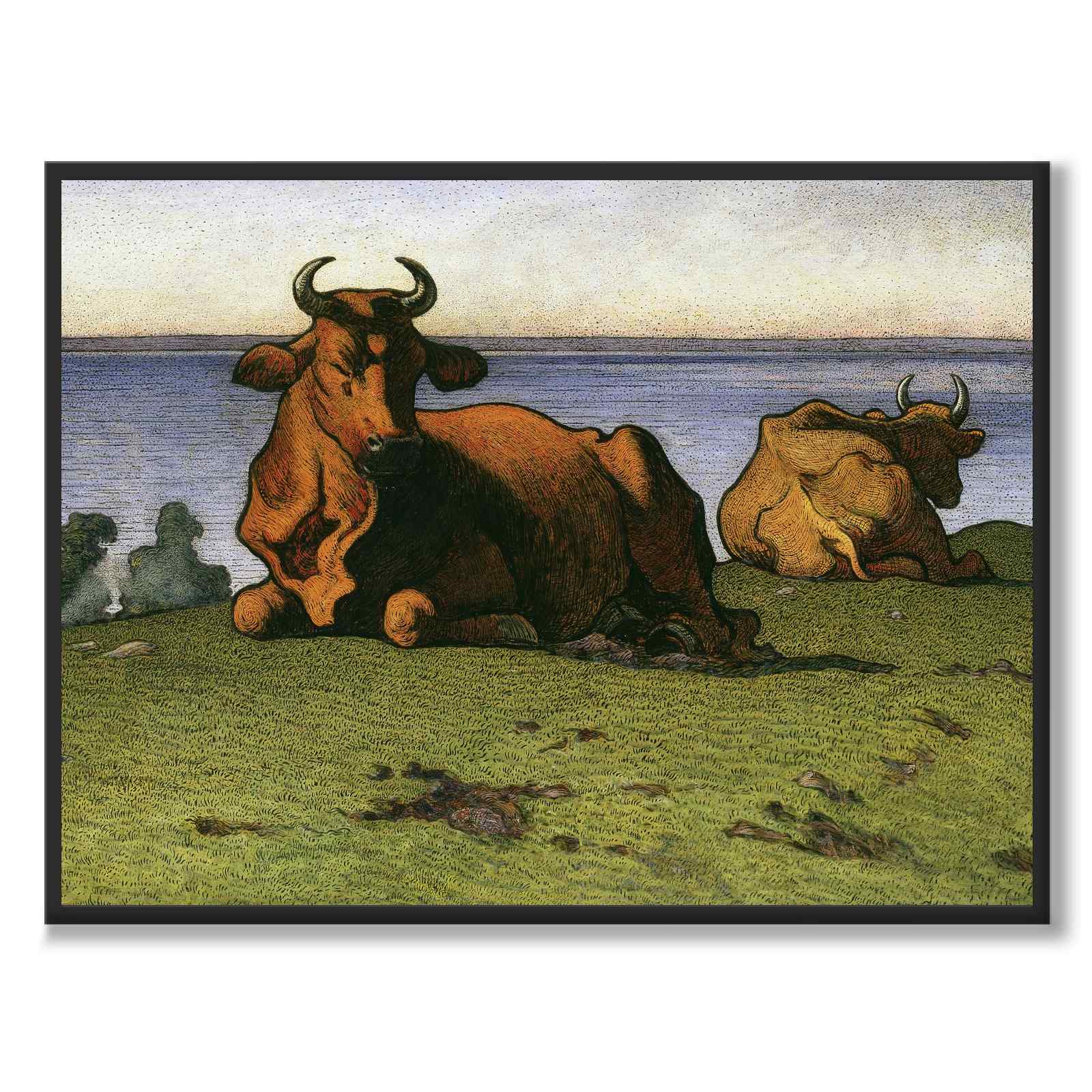 Plakat med maleriet Kuer av Nils Kreuger (1858-1930). Nils Kreuger var en kjent svensk landskapsmaler med bakgrunn fra Royal Academy of Arts og fra en privat kunstskole i Paris. Kreuger tilbrakte somrene på Öland hvor han ofte malte landskap, hester og kyr.