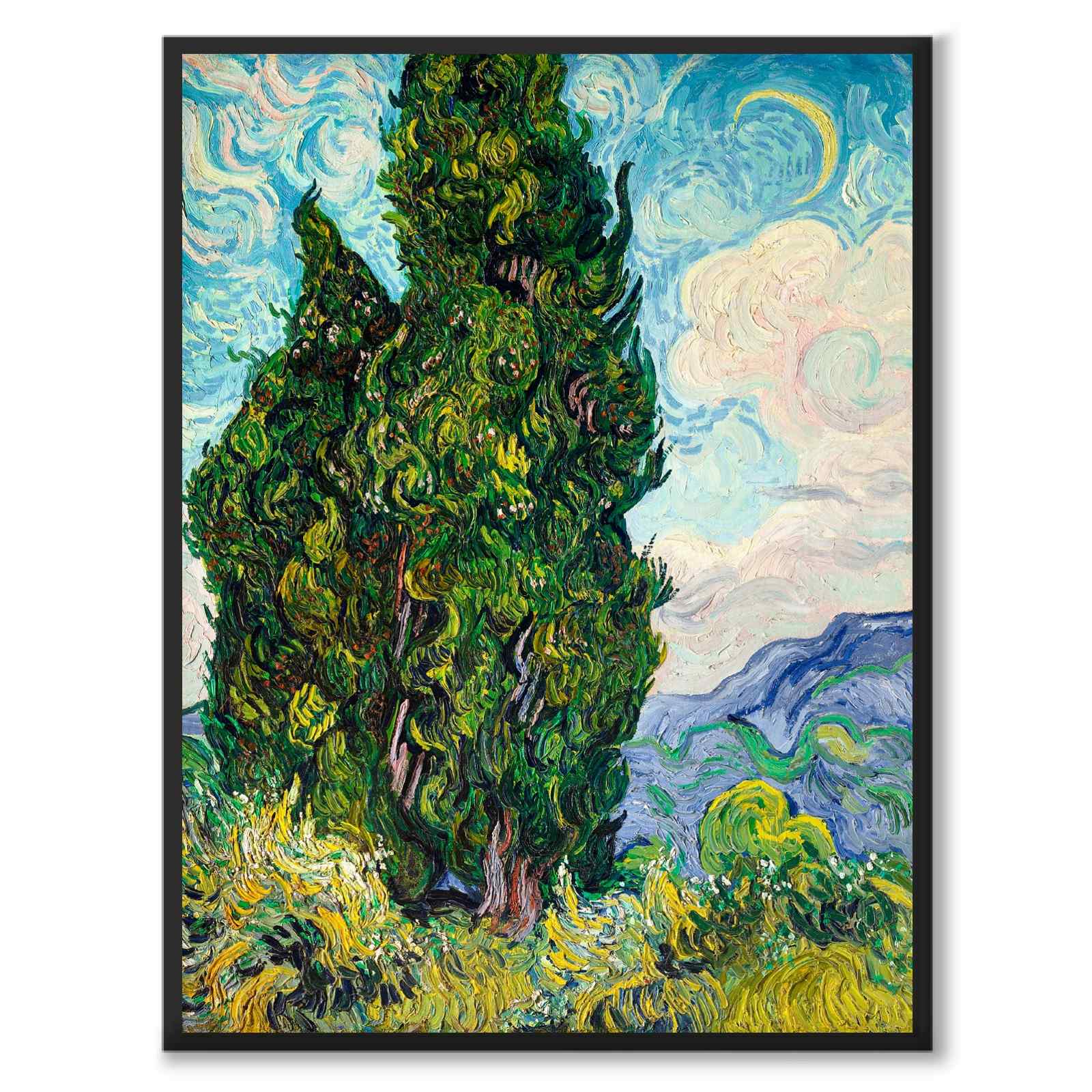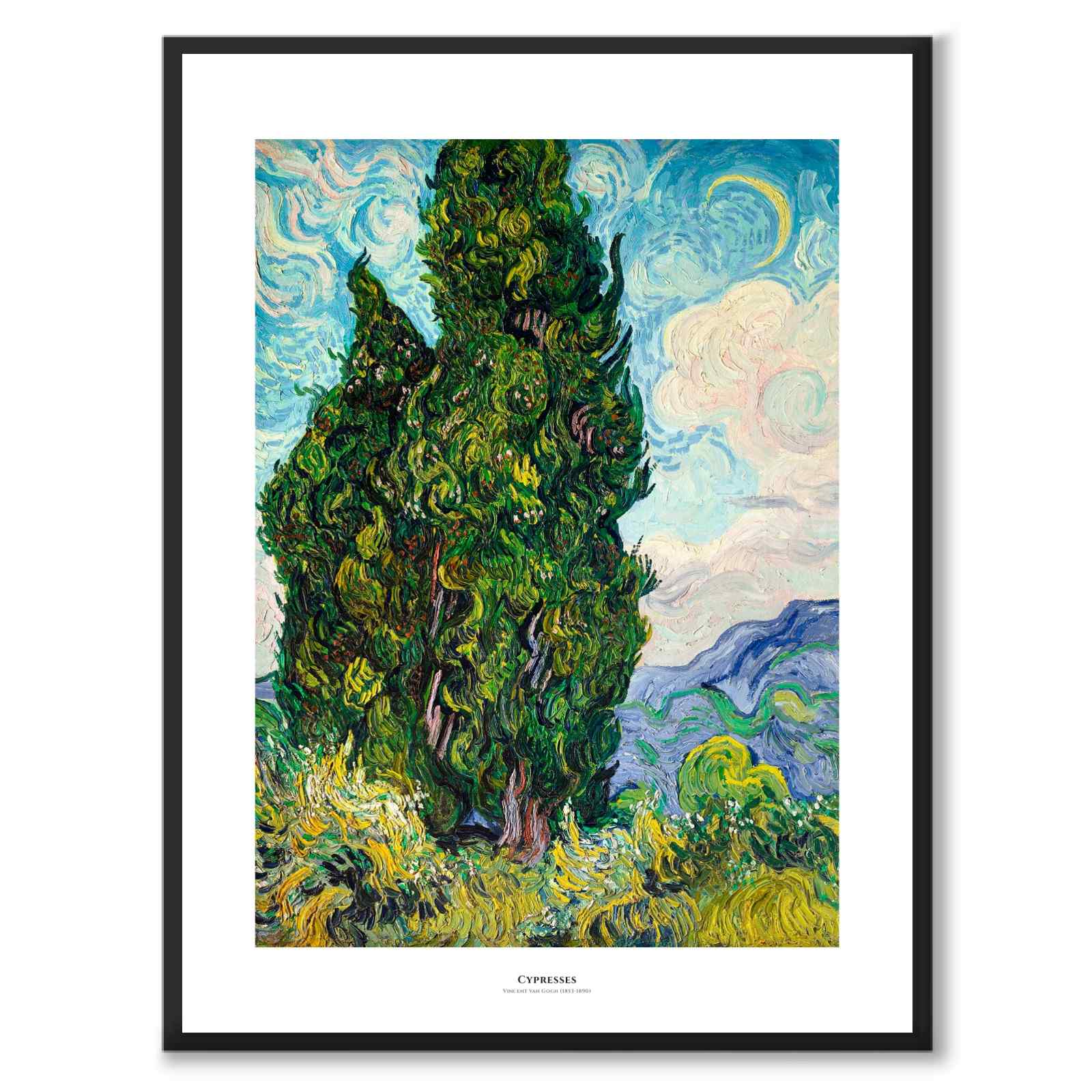 Plakat med motivet Cypressesfra 1889 av impresjonistkunstneren Vincent van Gogh. Motivet viser en vakker sommerdag i Frankrike med et stort sypresstre i fokus.