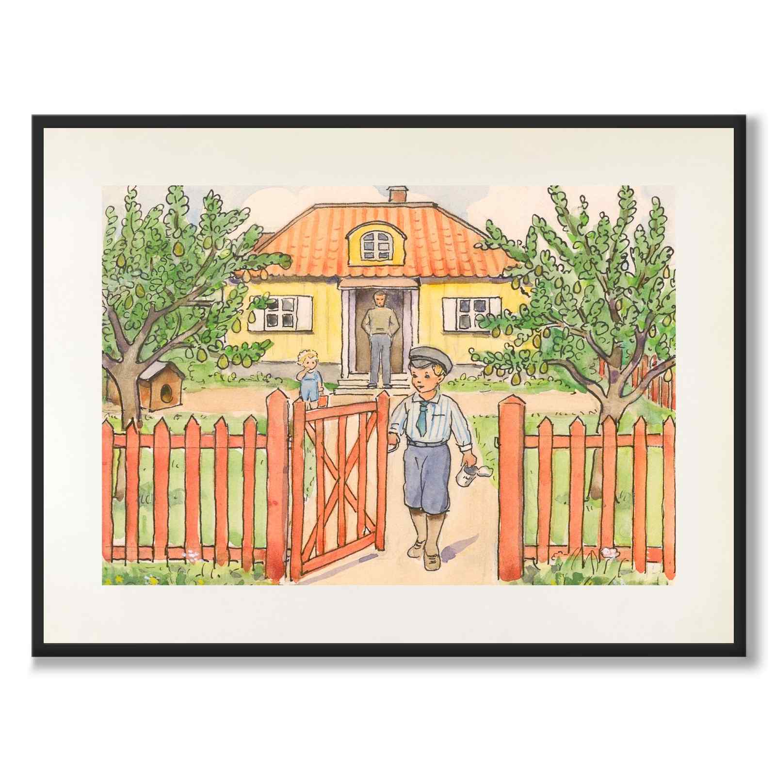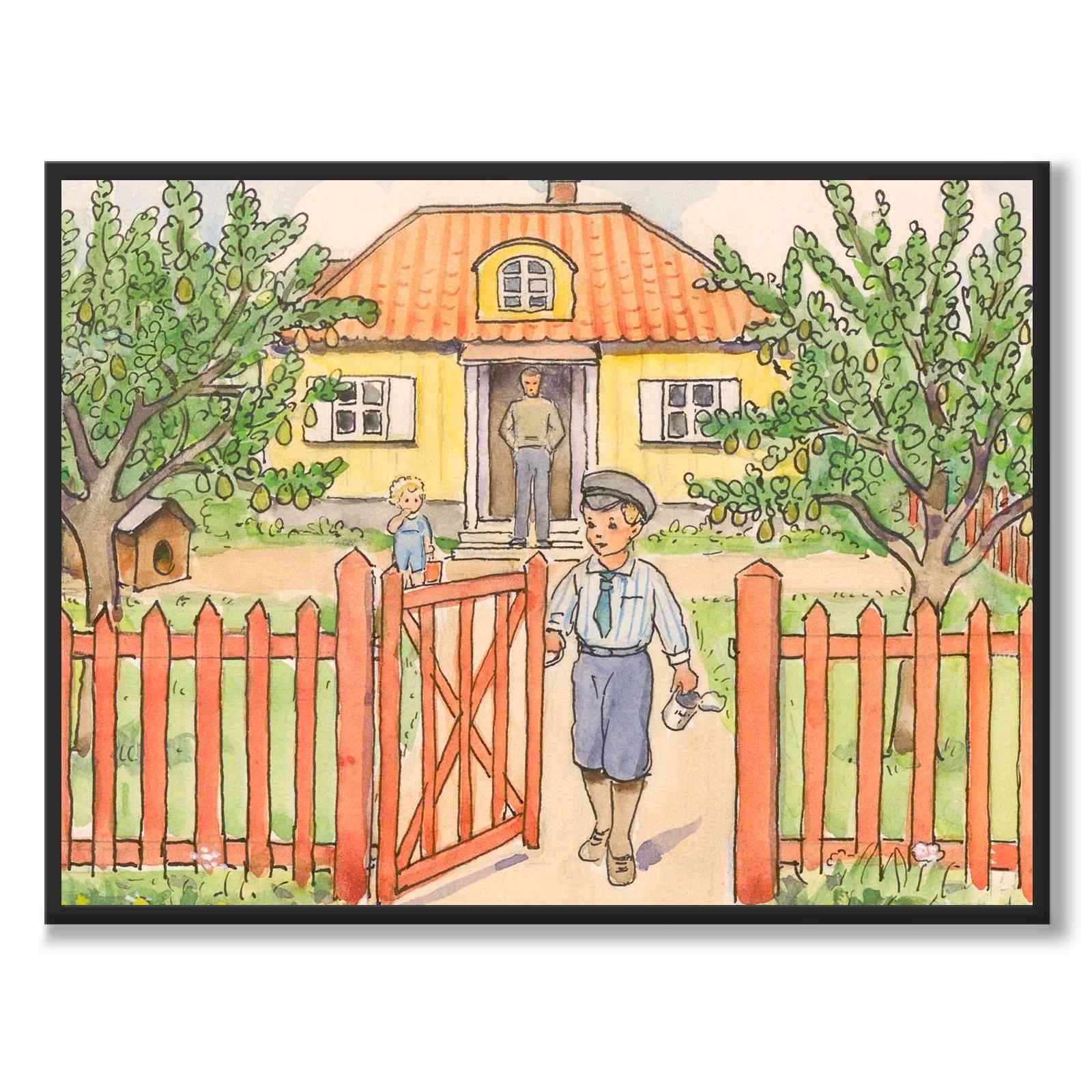 Bildet viser et gult hus omgitt av et rødt gjerde. En gutt med lue går ut gjennom den åpne porten, med en liten mugge i hånden. I bakgrunnen ses en voksen person i døråpningen og et mindre barn på gårdsplassen. Det er to store trær på tomten og til venstre kan du også se et lite hundehus.