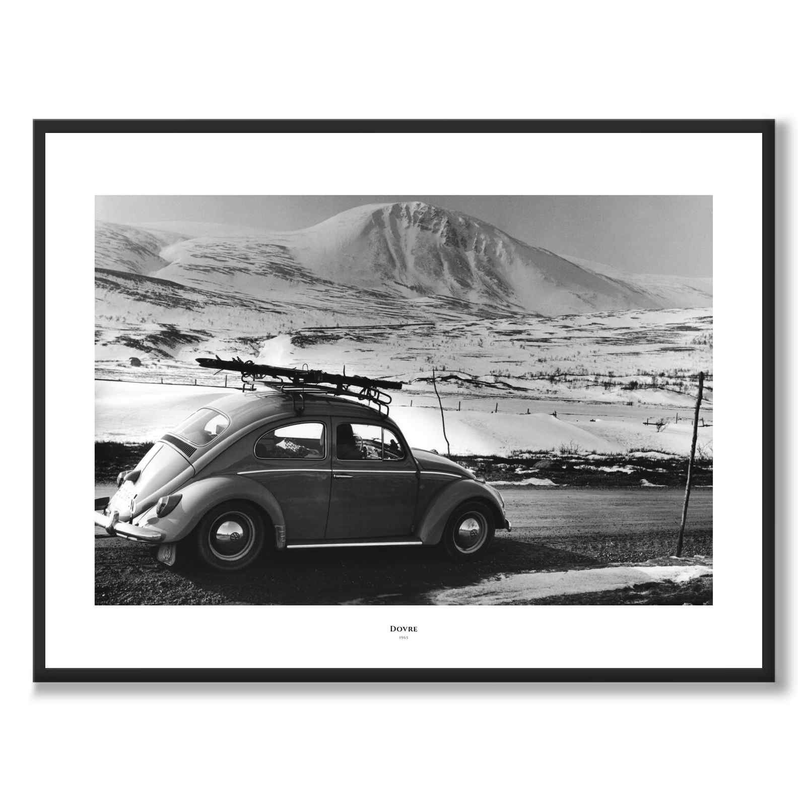Plakat med et vintage fotografi av en bil som kjøres på Dovre. Dovres høyeste punkt er Snøhetta, 2.286 meter over havet. Dovrebanan går fra Oslo til Trondheim over Dovres fjellkjeder, det samme gjør Europavei 6 mellom Trelleborg og Kirkenes.