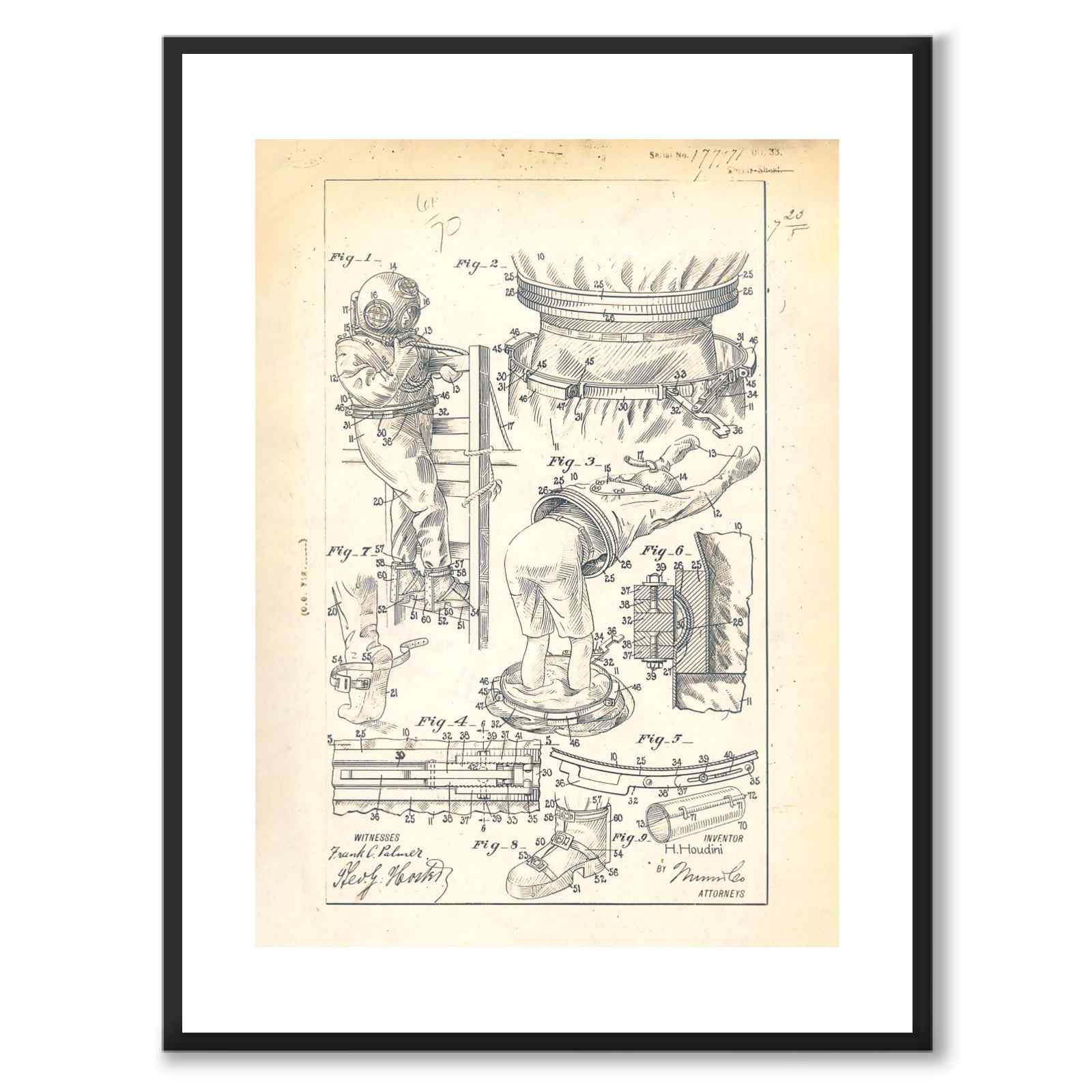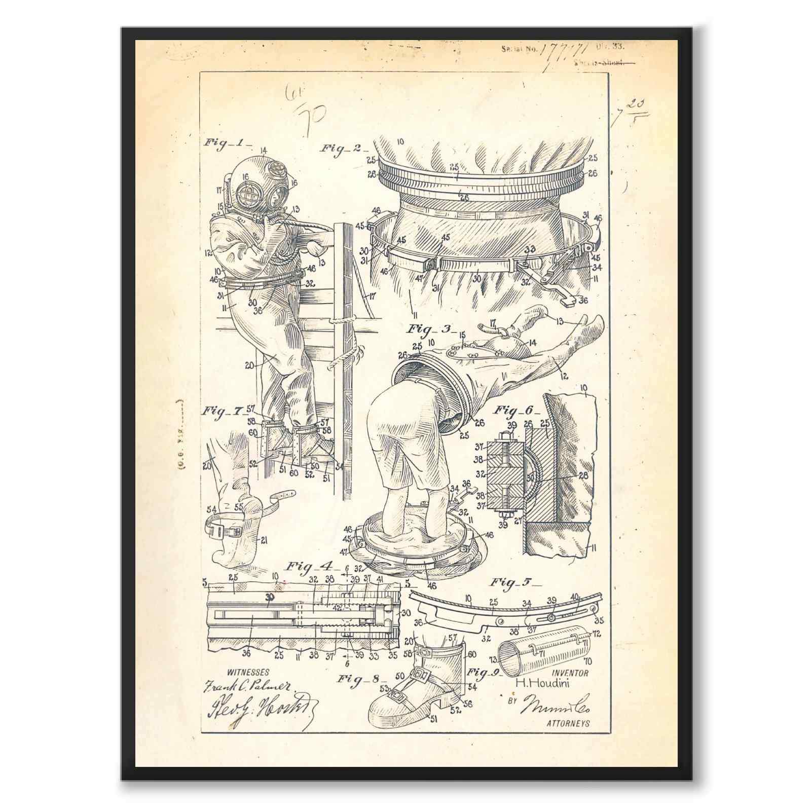 Plakat med en gammel patenttegning av en oppfinnelse og dykkerdrakt av den kjente magikeren og oppfinneren Harry Houdini (1874-1926).