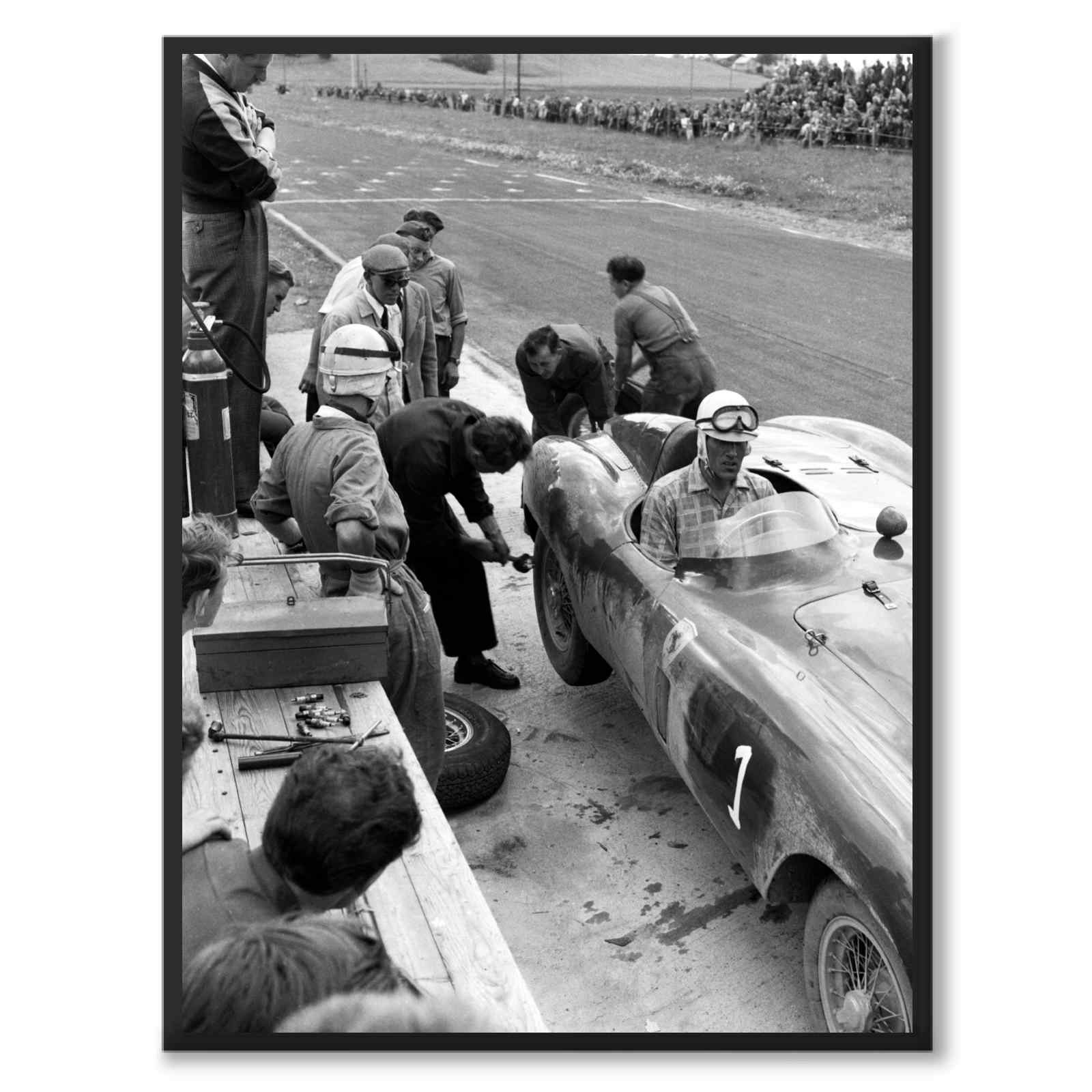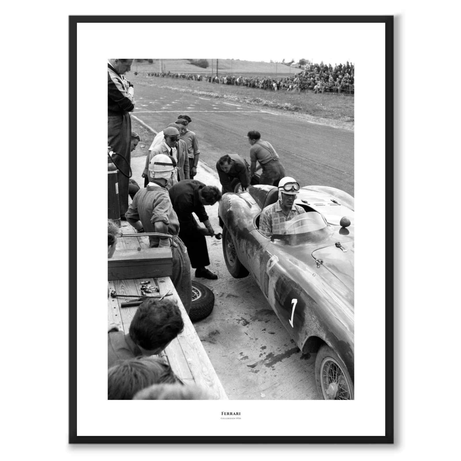 Et gammelt fotografi tatt under en Ferrari-trening i 1956. På bildet ser vi et hjul skiftes under treningsøkten på Gelleråsen, Karlskoga.