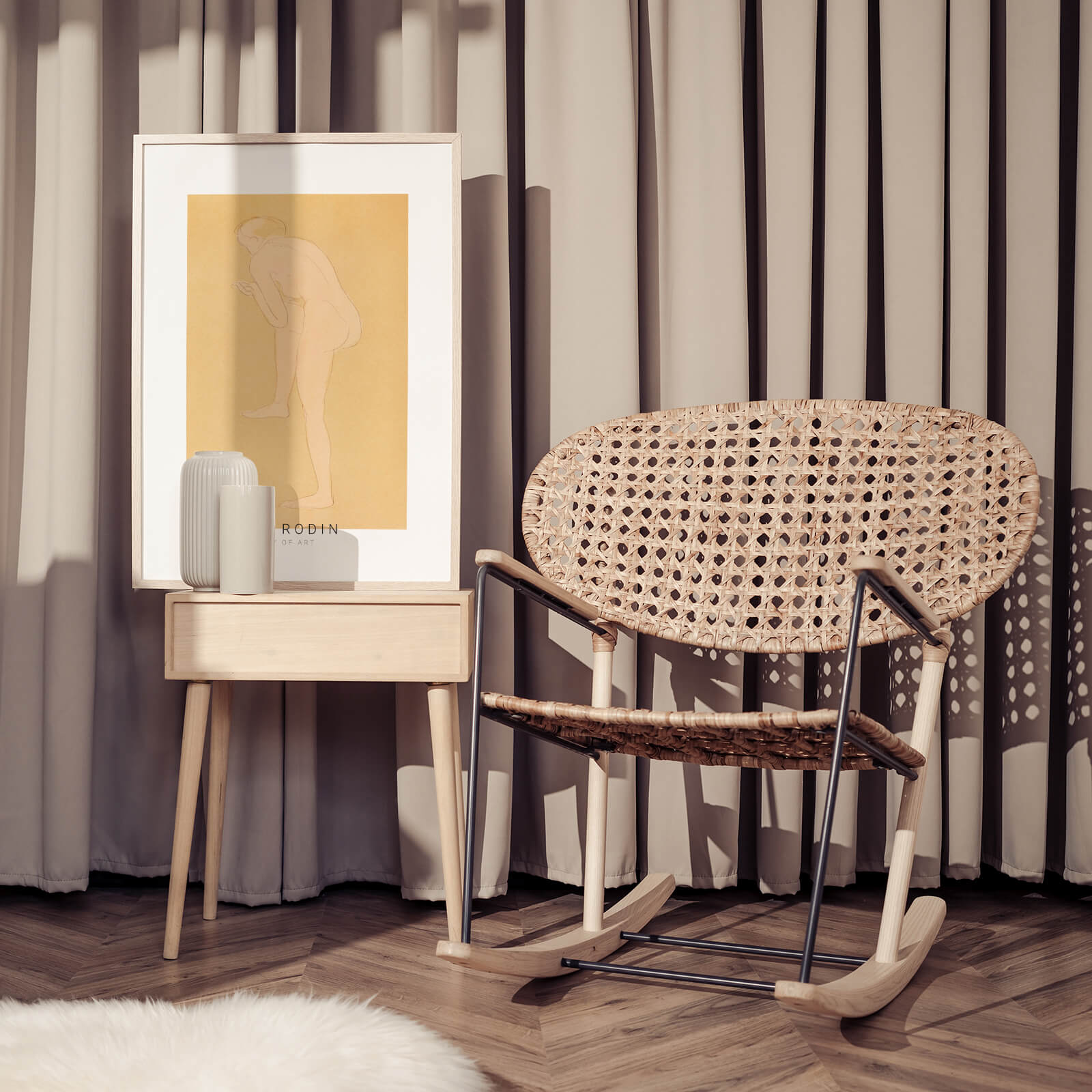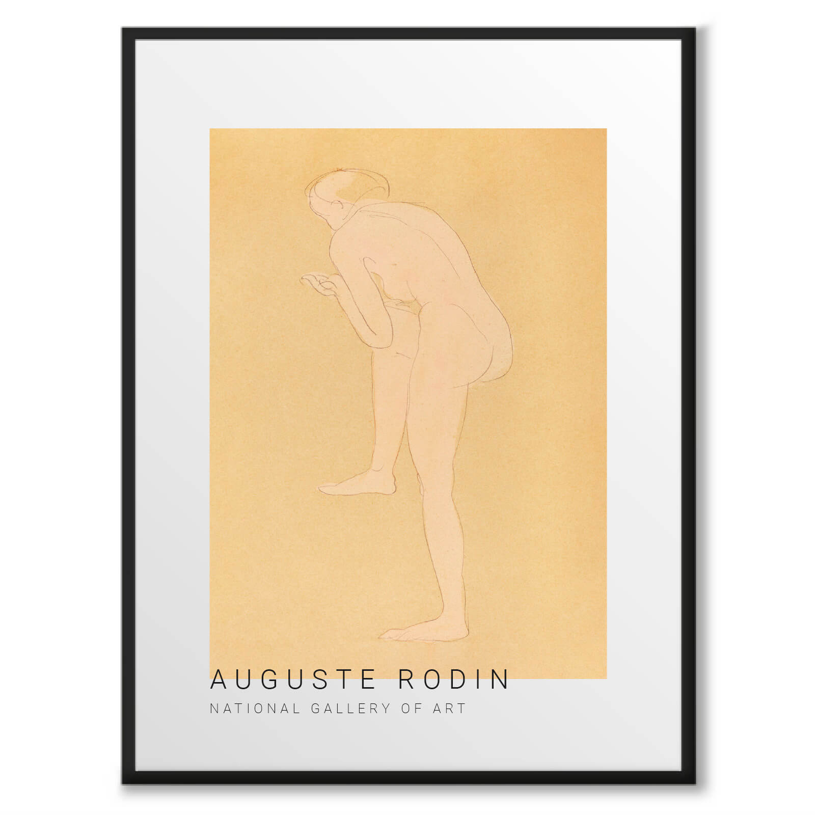 Plakat med en vintage nakenillustrasjon av ingen ringere enn den berømte billedhuggeren Auguste Rodin (1840-1917). Motivet heter Figure Bending Forward with Right Knee Raised . Originalen er på National Gallery of Art.