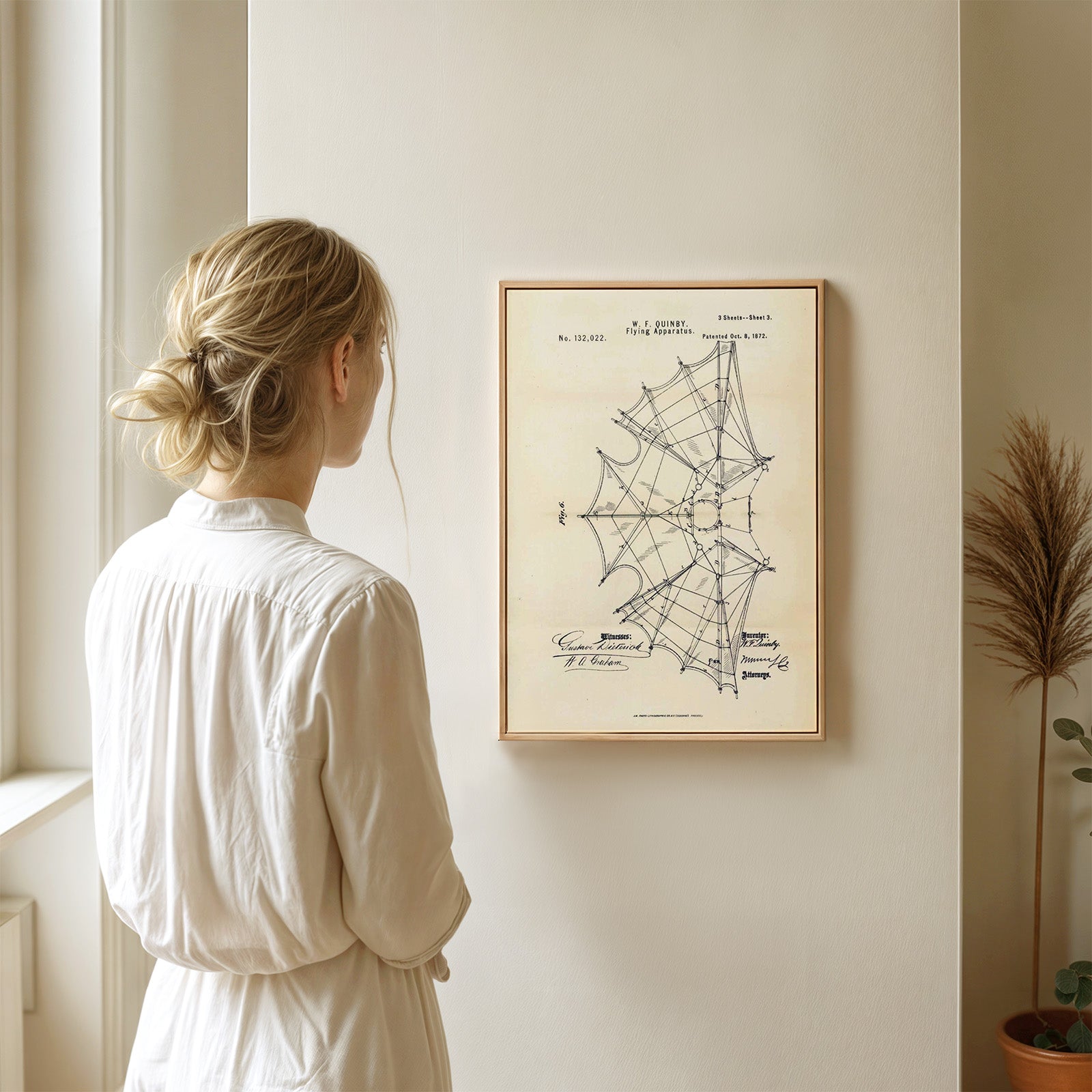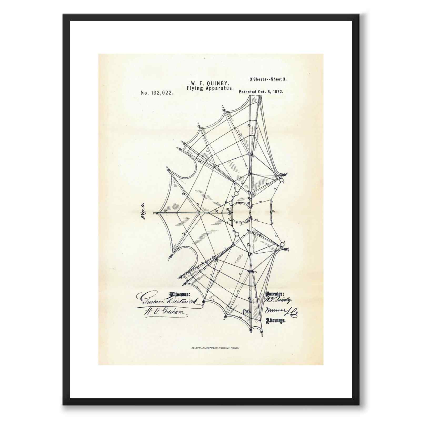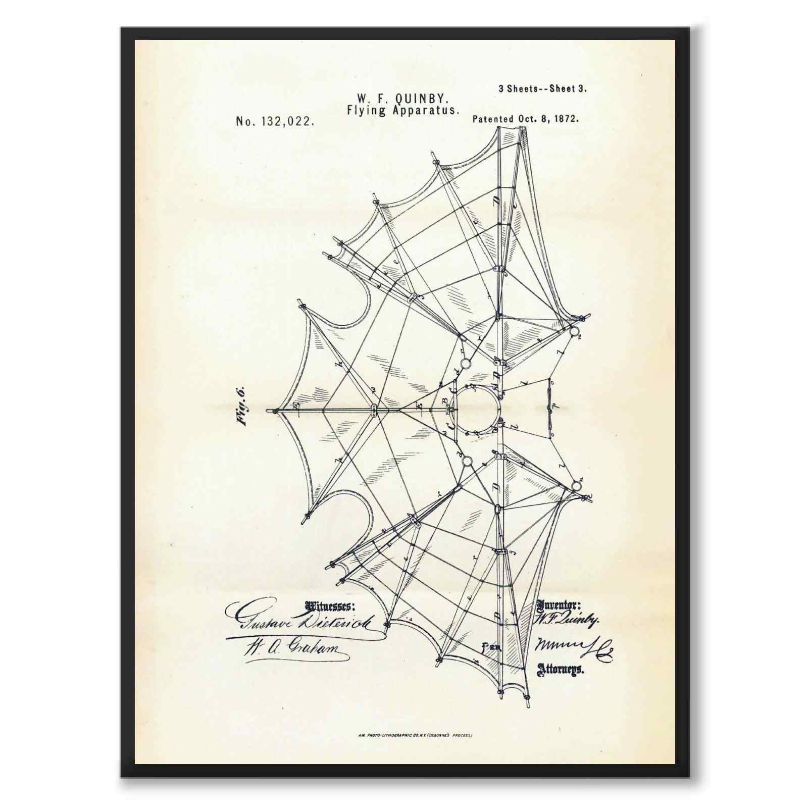 Plakat av en patenttegning datert 8 oktober 1872 for et "Flying Apparatus" designet av WF Quinby.