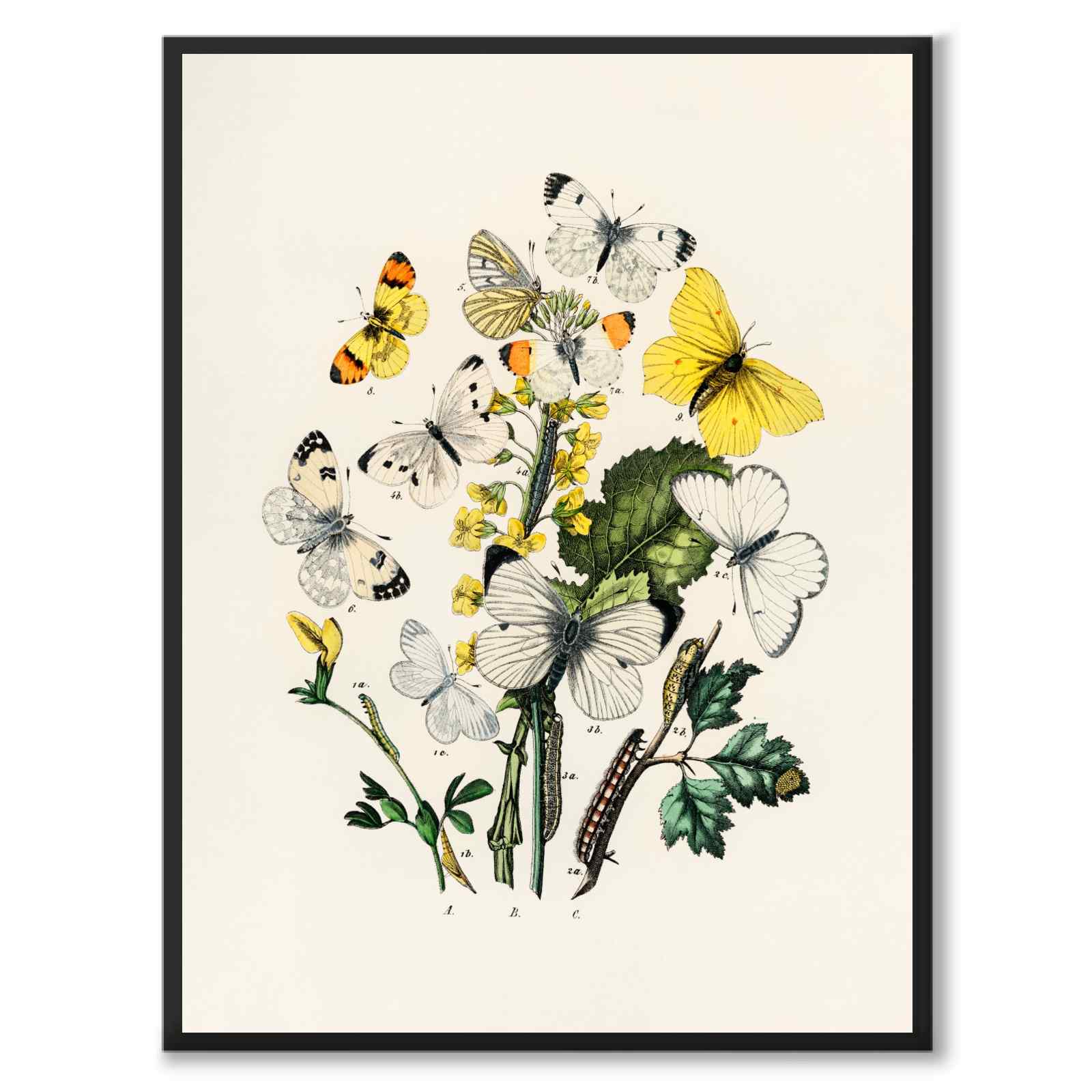 Dette bildet viser en gruppe hvite og gule sommerfugler og deres larver. Illustrasjonen skildrer økosystemet der sommerfugler og larver samhandler med planter.