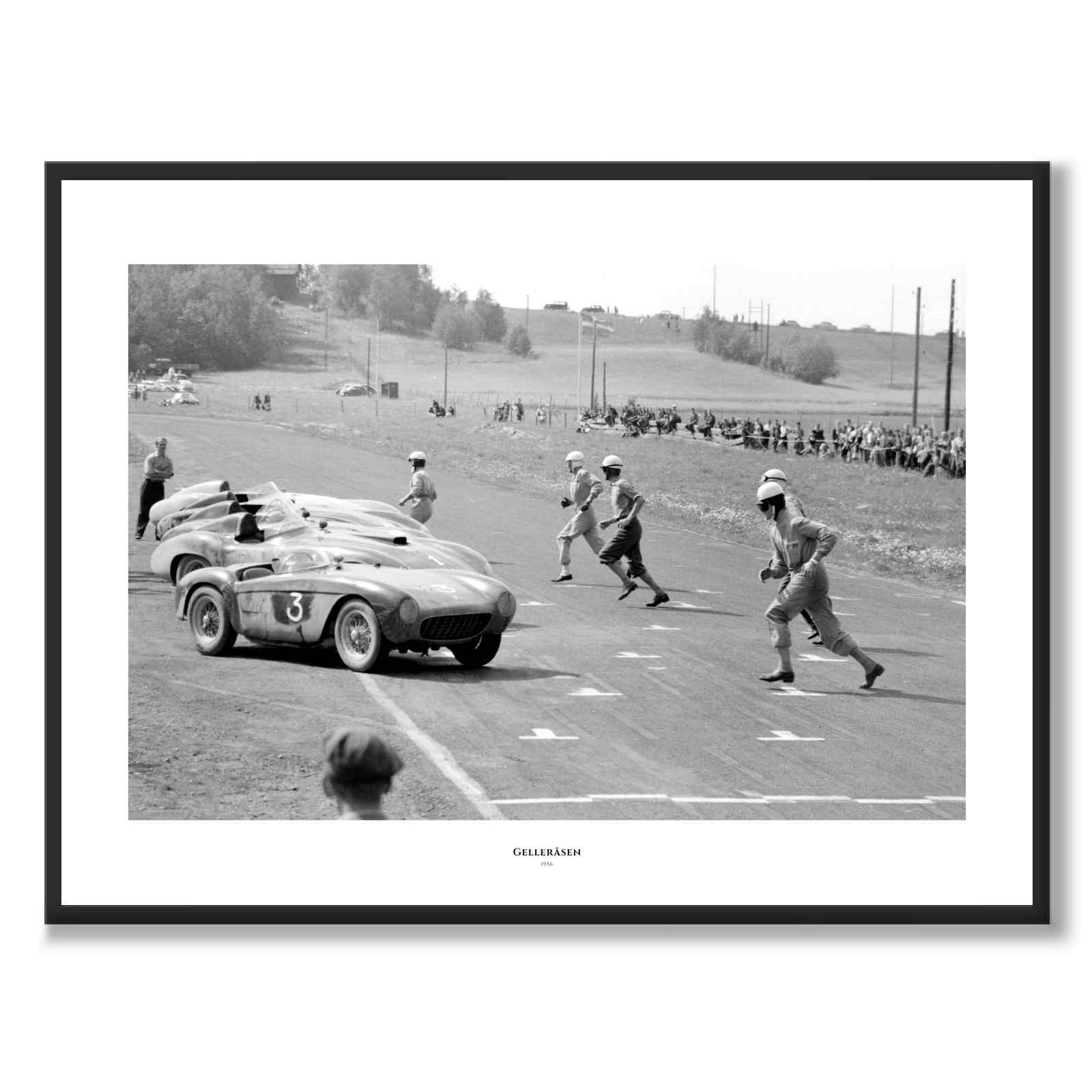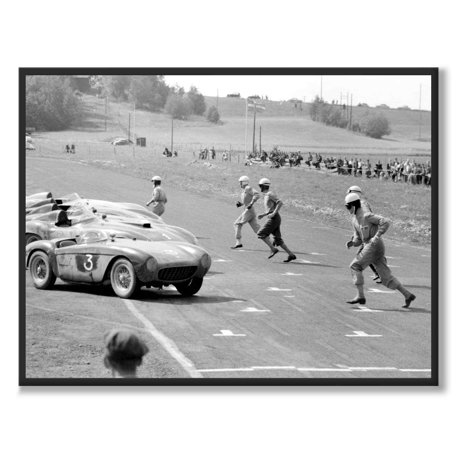 Et unikt fotografi fra 1956 hvor Ferrari-sjåfører øver på Le Mans-starten på Gelleråsen.