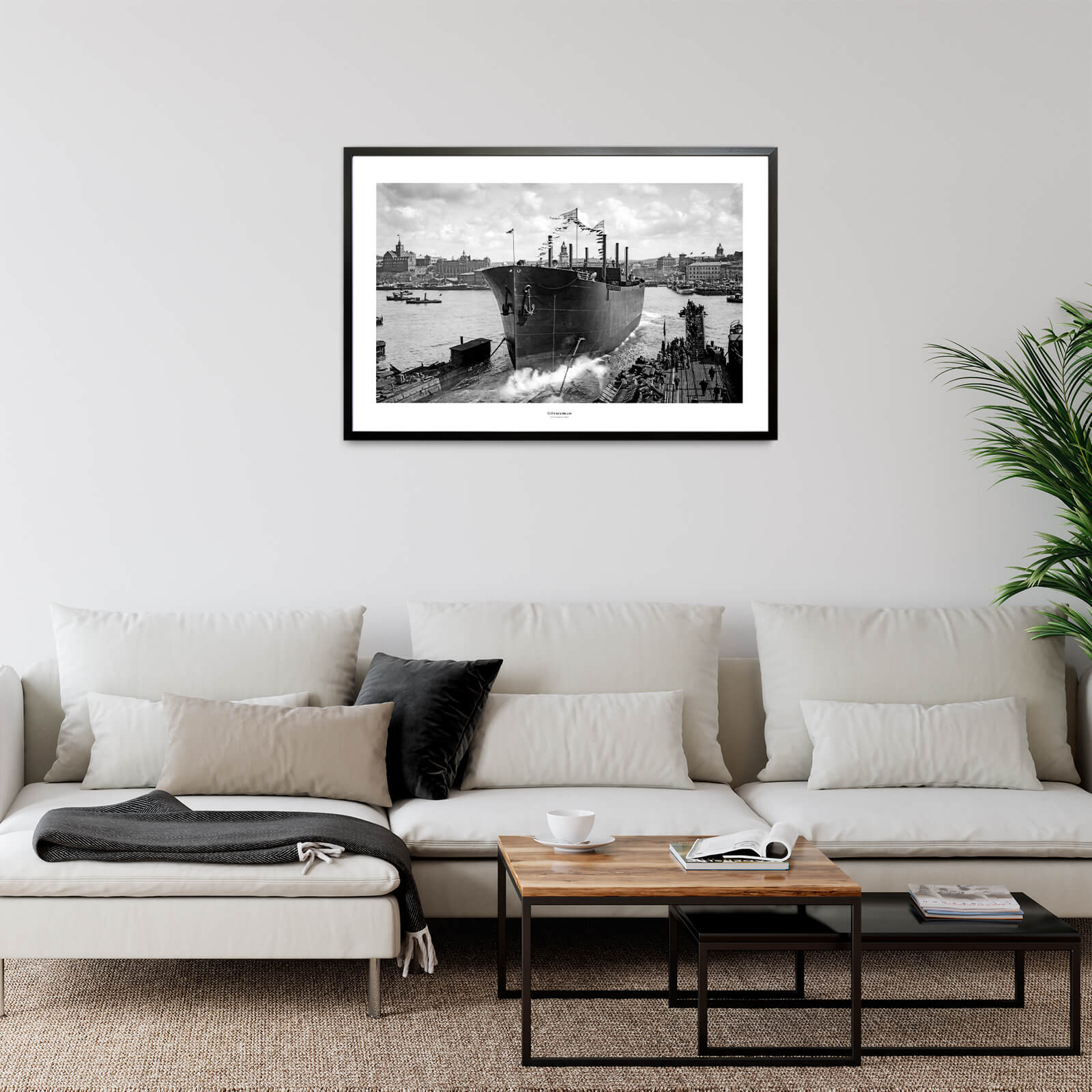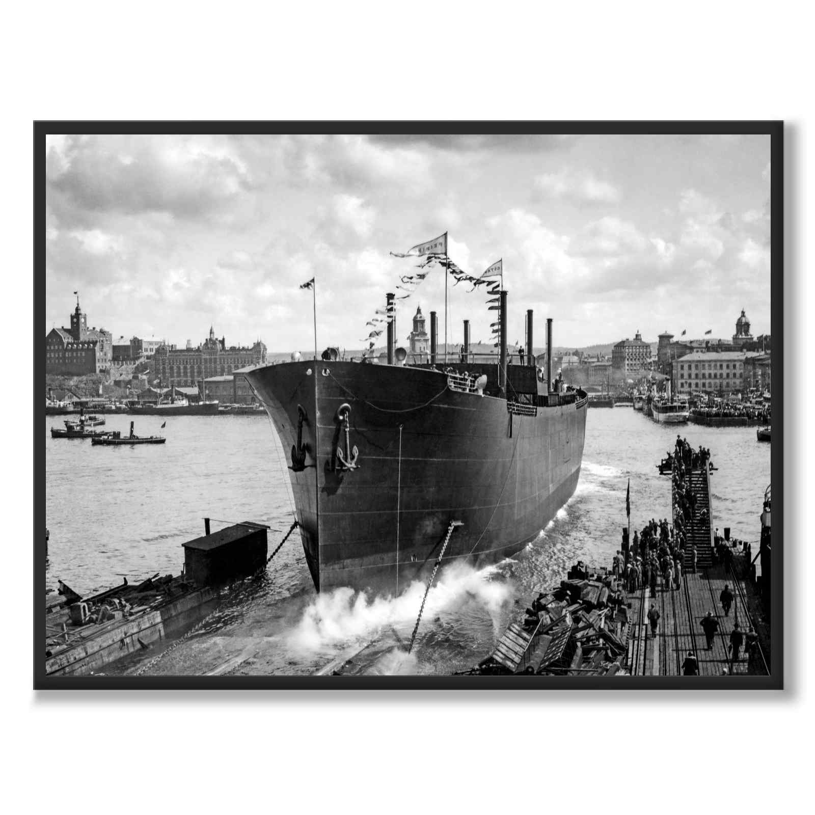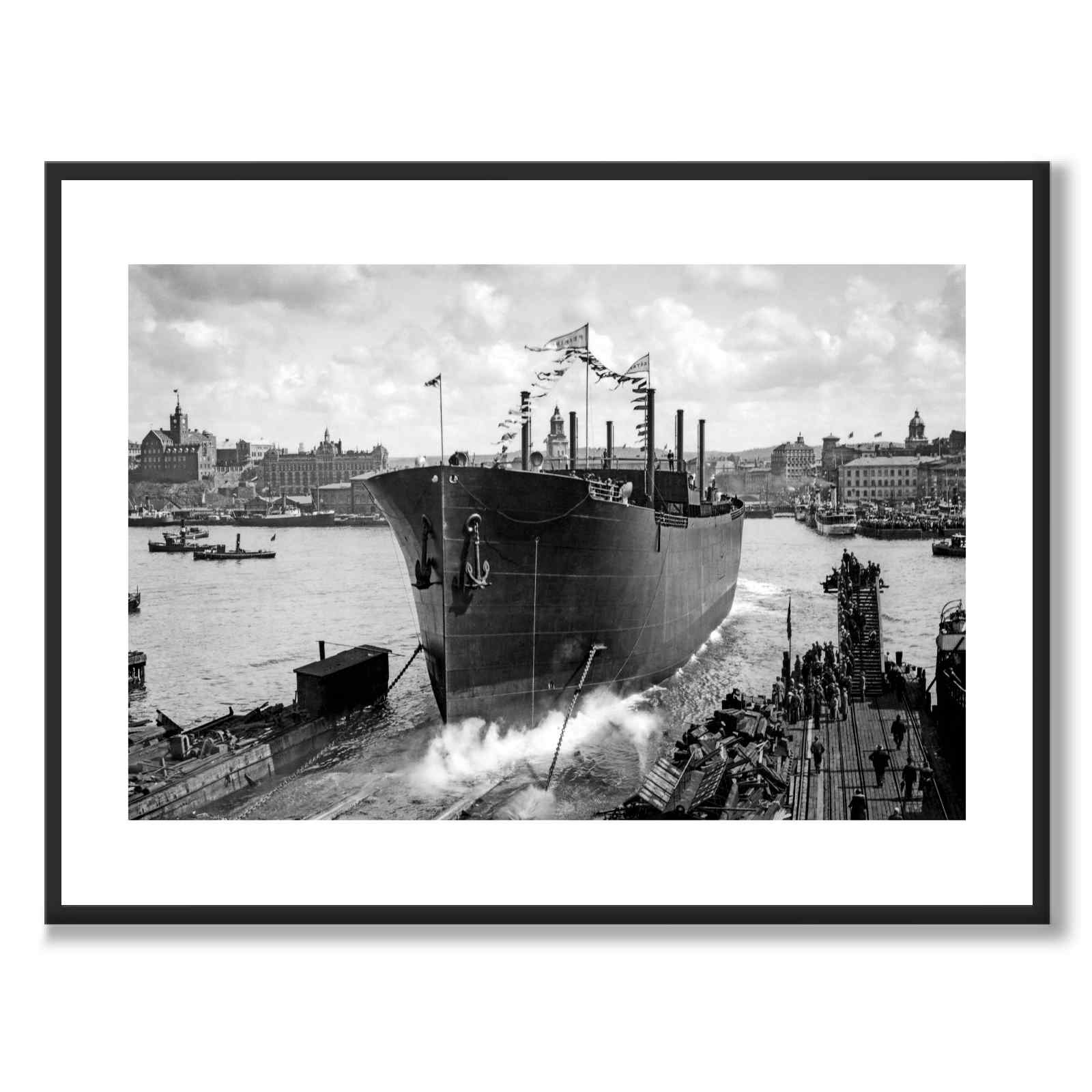 Et kult bilde av en seremoniell sjøsetting av et skip ved Götaverken i Gøteborg på 1930-tallet. Arrangementet har tiltrukket seg store folkemengder på begge sider av elva som har samlet seg for å se skipet gli i sjøen for første gang.