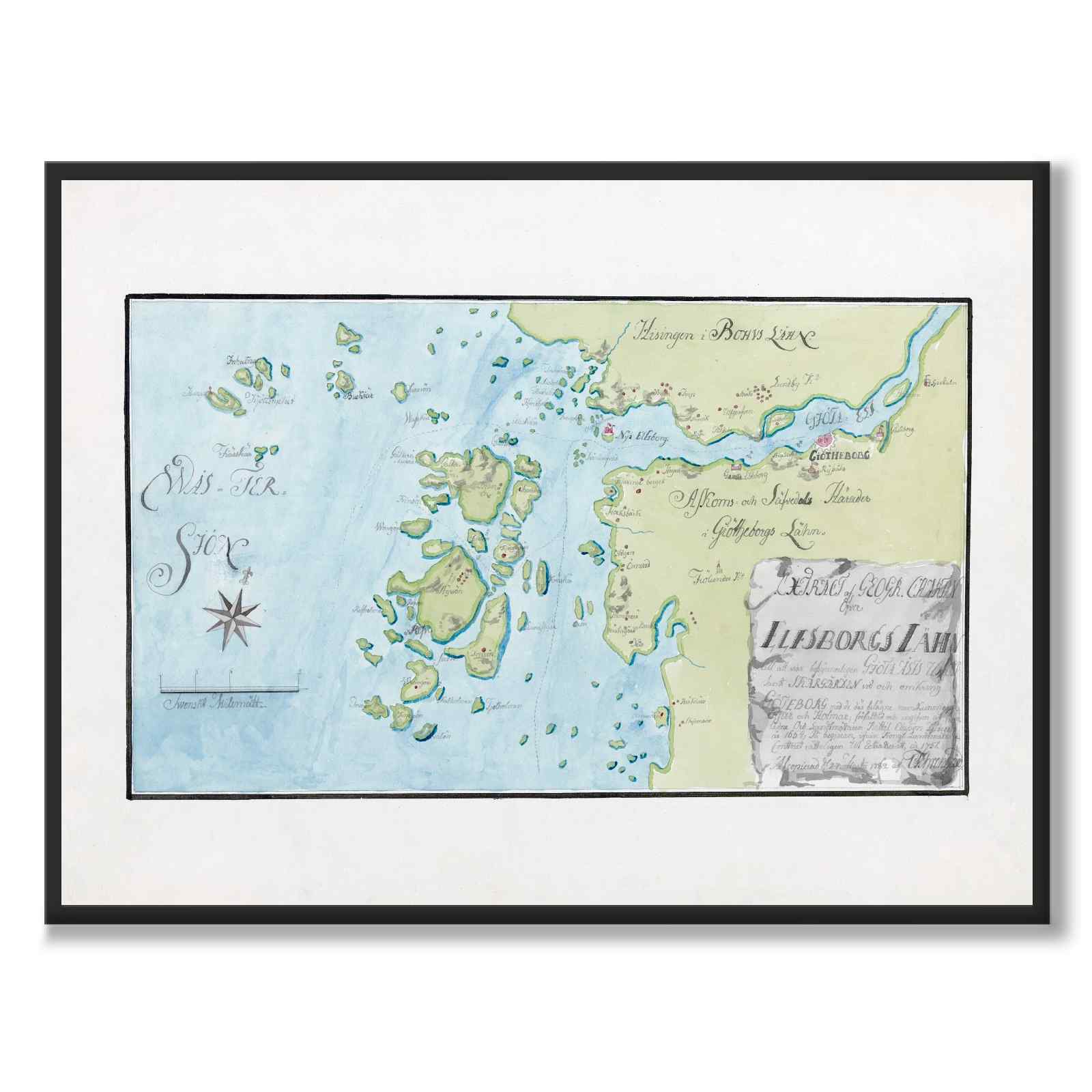 Et gammelt kart over Gøteborgs sydlige skjærgård og Göta Älv og omegn. Kartet ble opprinnelig tegnet i 1654 av Kettil Classon Felterus. Den ble senere kopiert av CF Ehrensvärd 1782.