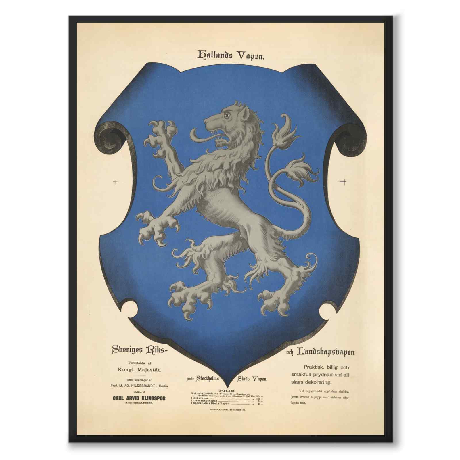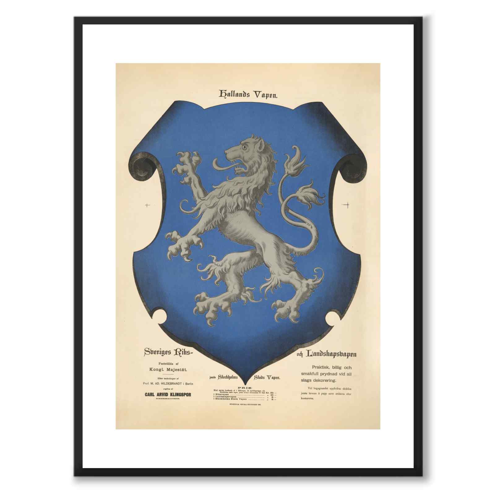 Teksten over våpenet lyder: Dalarnes Vapen. Nederst til venstre står det: "Sveriges Riks- och Landshapensvapen. Fastställda af Kongl. Majestät. Efter teckningar af Prof. M. AD. Hildebrandt i Berlin. Utgifna af Carl Arvid Klingspor."