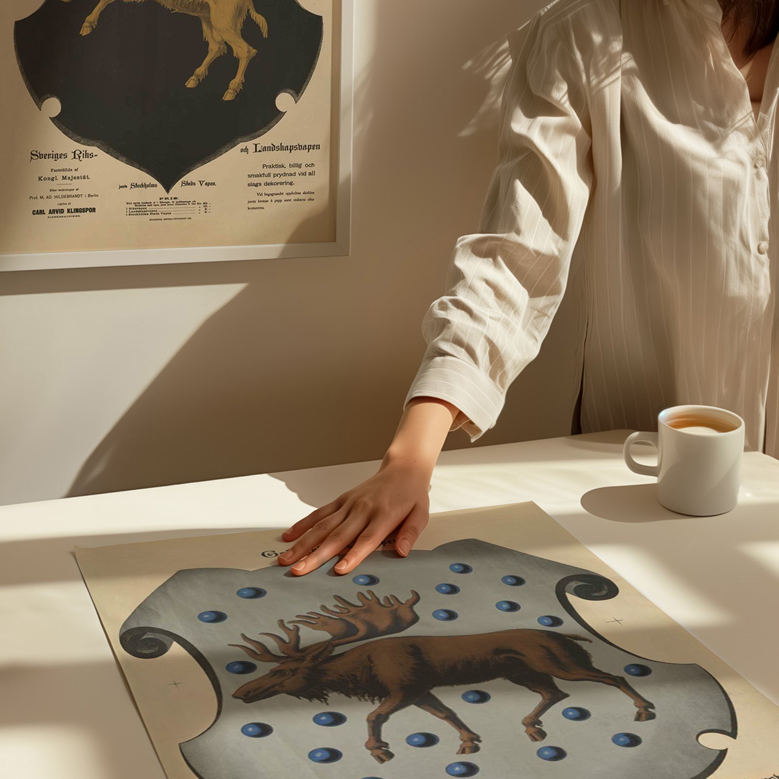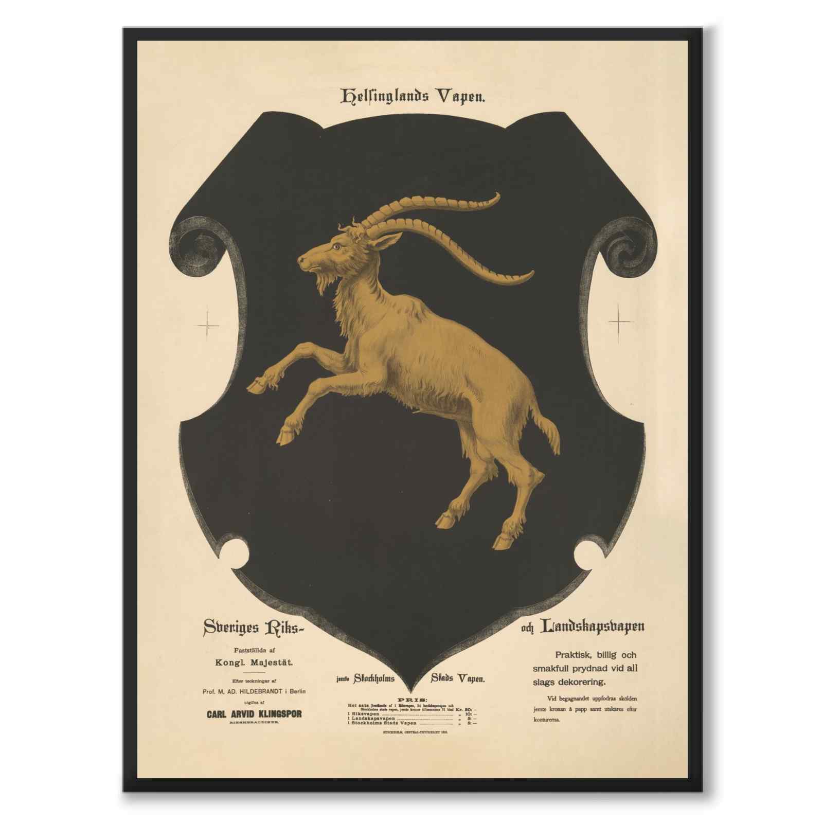 Teksten over våpenet lyder: Dalarnes Vapen. Nederst til venstre står det: "Sveriges Riks- och Landshapensvapen. Fastställda af Kongl. Majestät. Efter teckningar af Prof. M. AD. Hildebrandt i Berlin. Utgifna af Carl Arvid Klingspor."