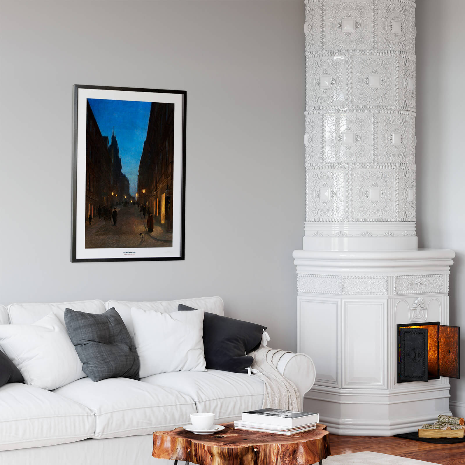 Hamngatan, som fikk sitt nåværende navn i 1857, ligger ved siden av Kungsträdgården og Norrmalmstorg og har lenge vært et senter for handel og underholdning. Et stemningsfullt kveldsbilde av et tidstypisk liv i Sverige ved århundreskiftet.