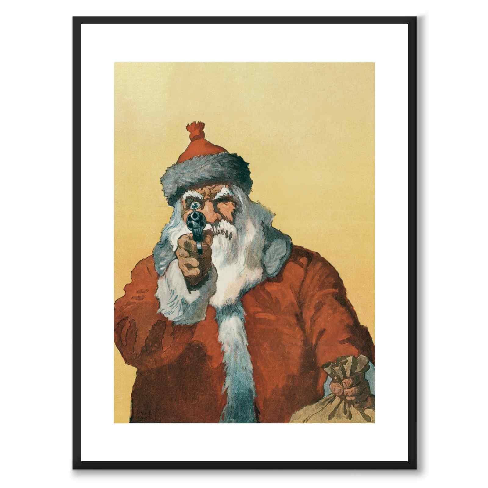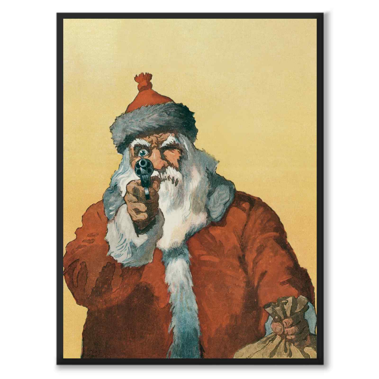 Bildet viser en nisse som ser ut til å ha ranet en butikk av noe slag for verdisaker som han holder i en pose i venstre hånd, og i den andre retter han en pistol mot betrakteren.