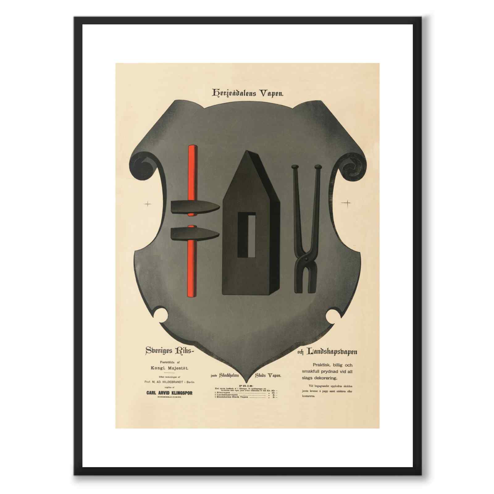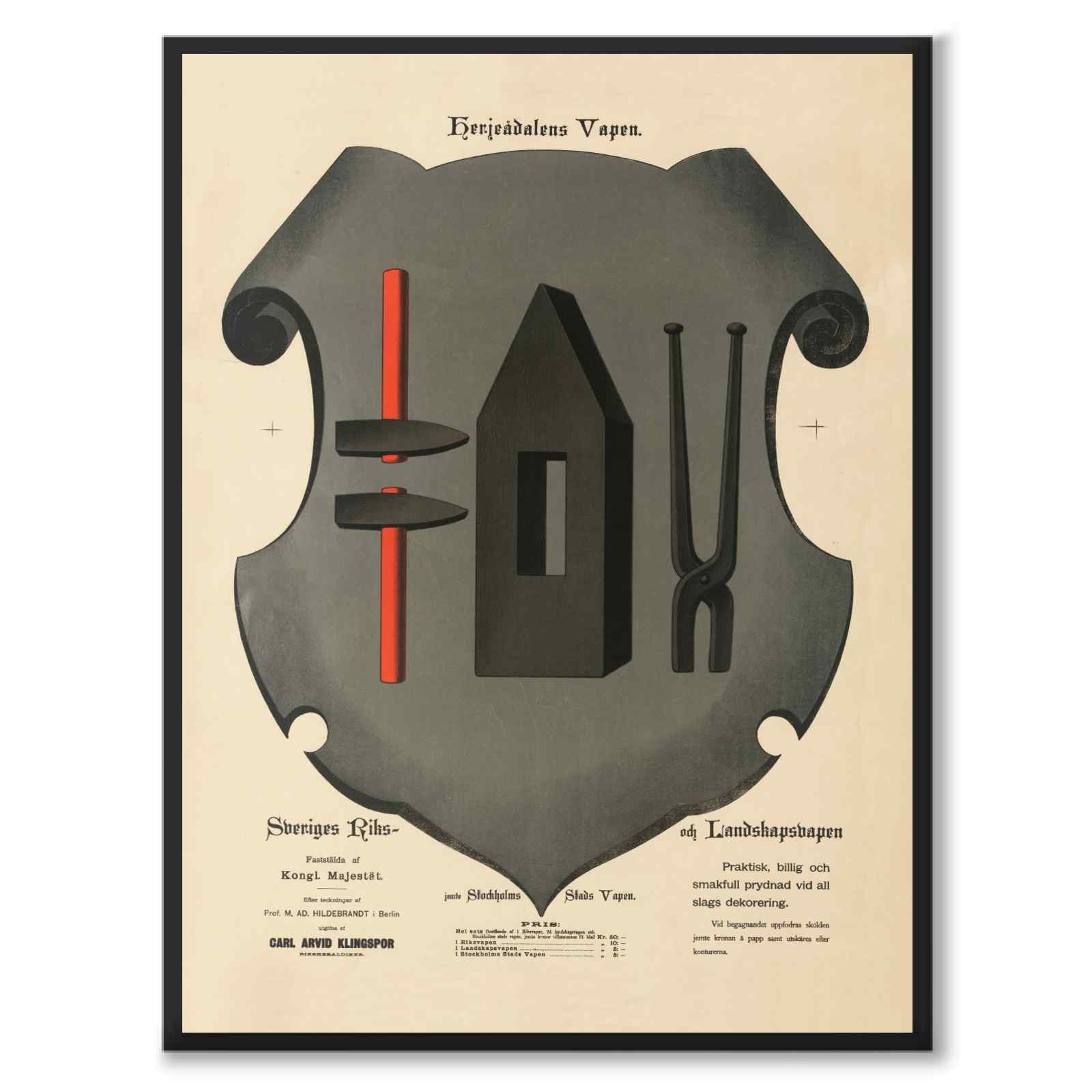 Teksten over våpenskjoldet lyder: Herjeådalens Vapen. Nederst til venstre står det: "Sveriges Riks- och Landshapensvapen. Fastställda af Kongl. Majestät. Efter teckningar af Prof. M. AD. Hildebrandt i Berlin. Utgifna af Carl Arvid Klingspor."