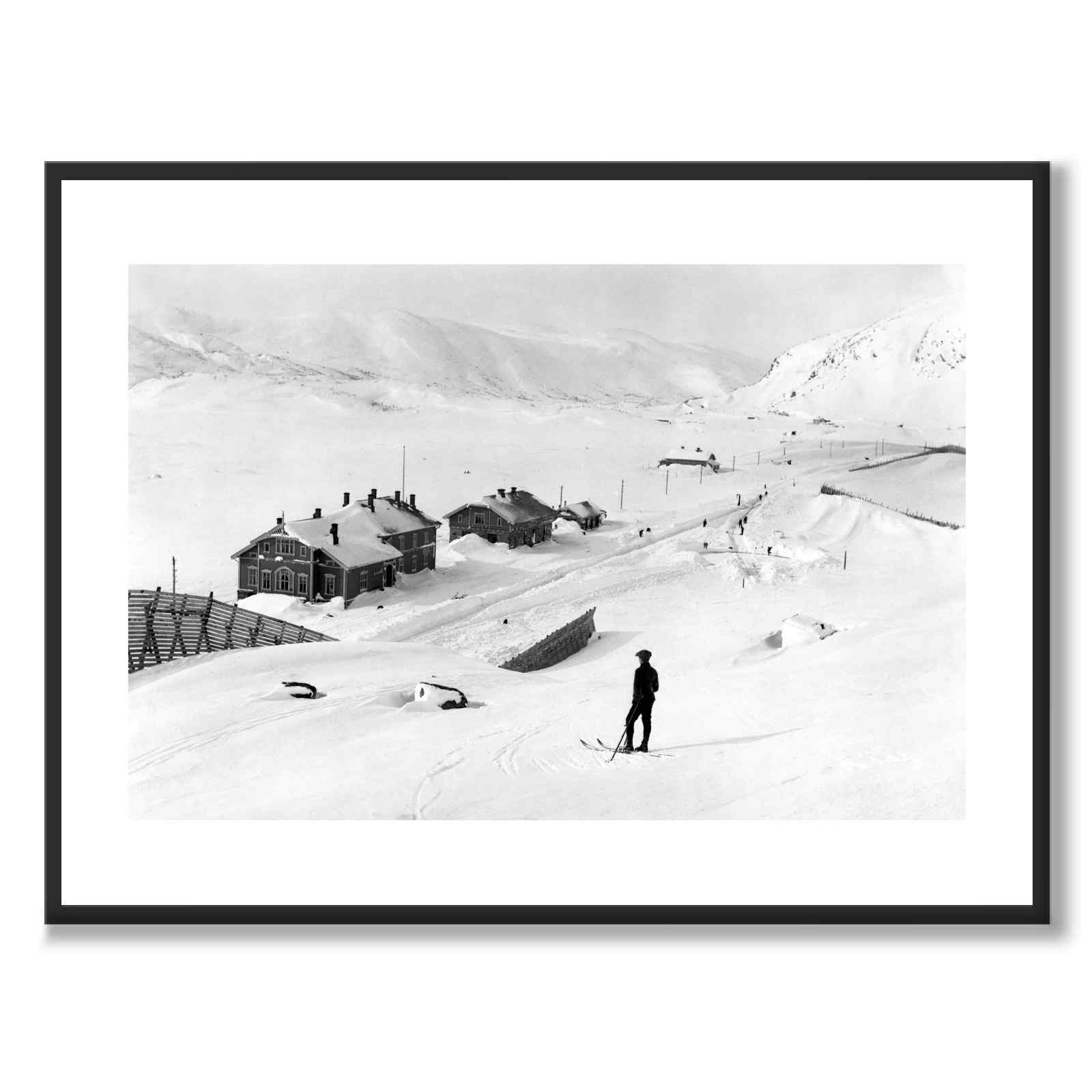 Plakat med fotografi av en skiløper på Haugastøl , tatt av Anders Beer Wilse.