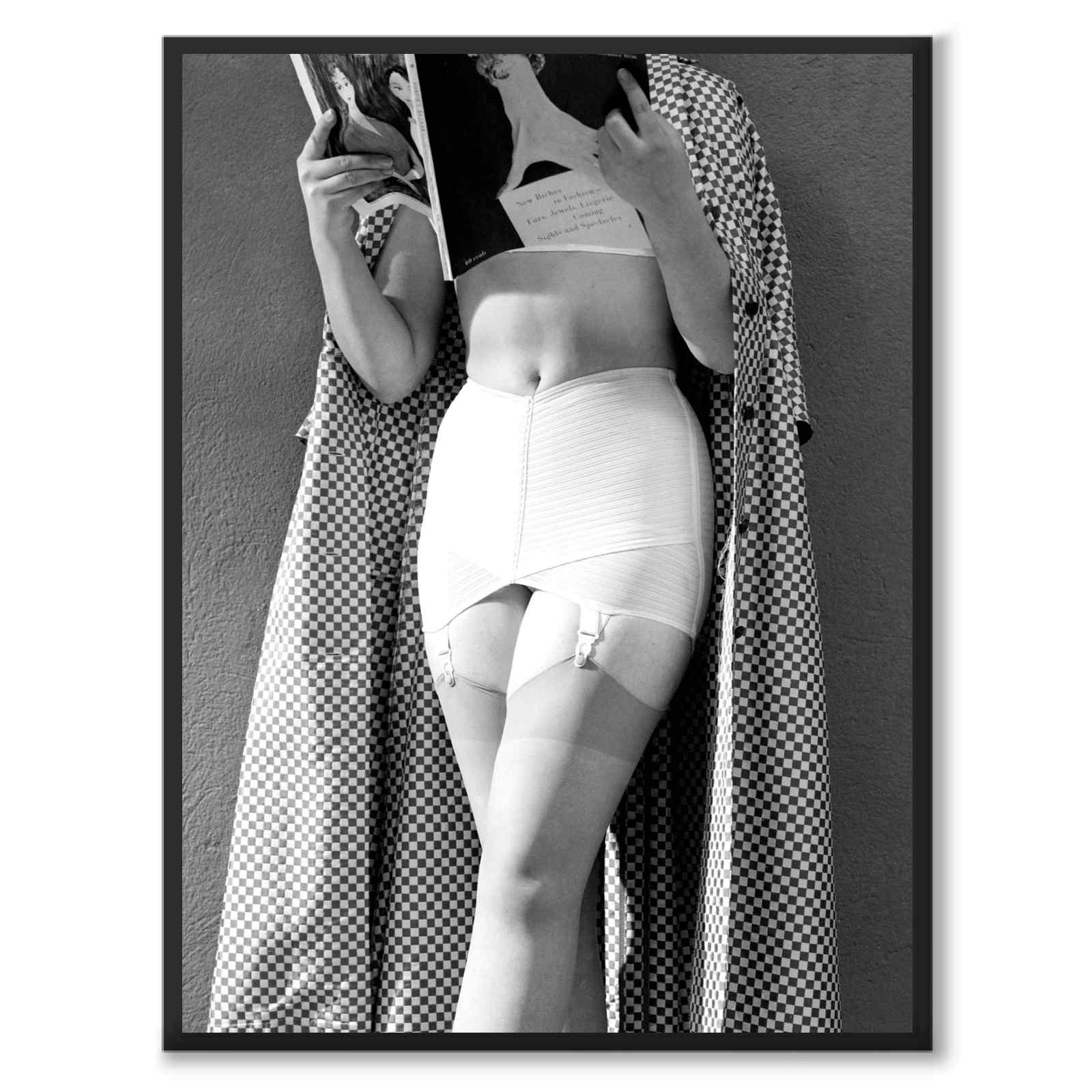 Plakat av en ung kvinne som poserer som en utstillingsdukke for den siste kvinnemoten i 1956. Hun har på seg en rutete frakk, undertøy og strømpebånd.