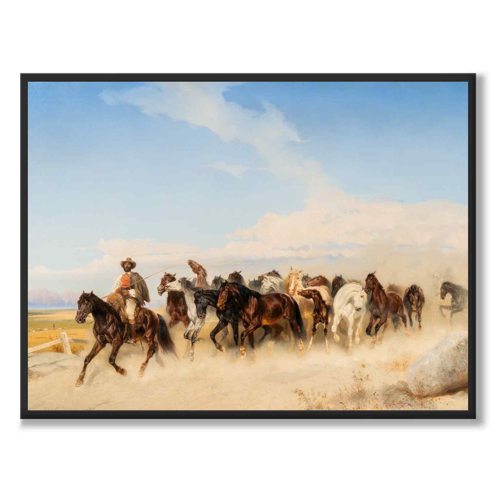 Carl Wahlbom var en av Sveriges mest populære historiemalere på 1800-tallet. Det fengslende maleriet viser en mann på hesteryggen som leder en flokk med hester i et vakkert landskap i Campagna, Italia. Det er et oljemaleri laget med vakre, sterke farger.