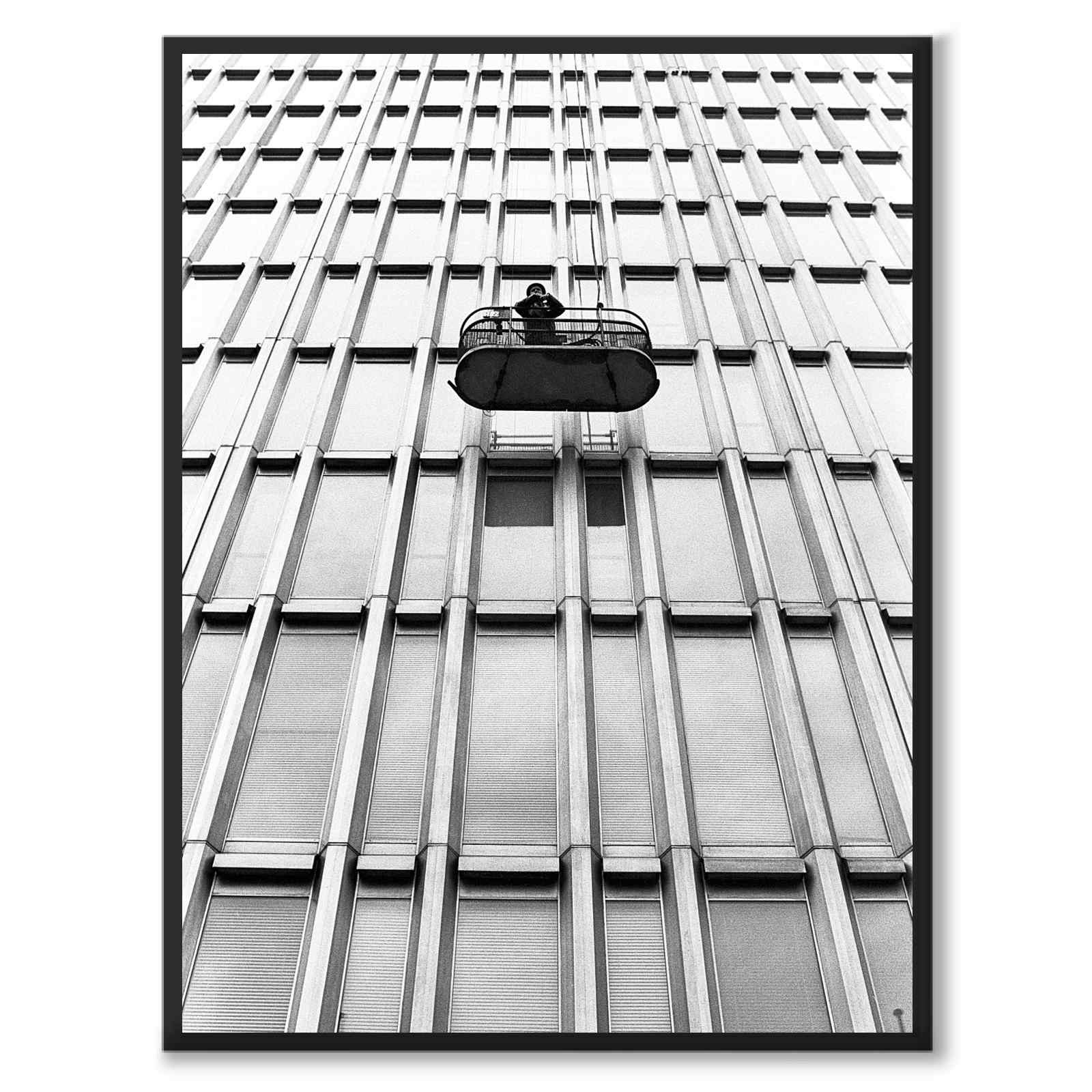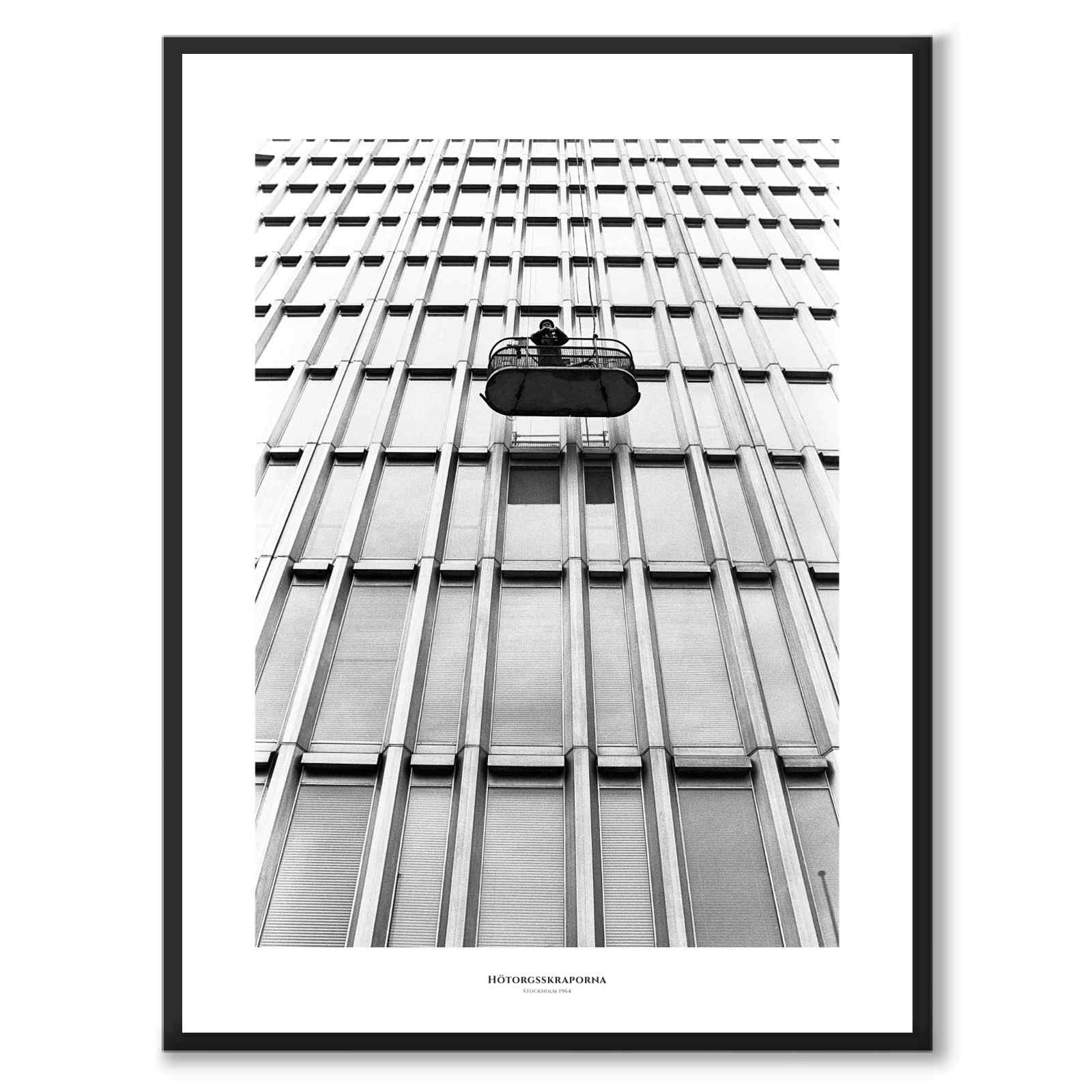 Innlegg med Hötorg-skrapere i Stockholm i 1964. Skraperne er plassert mellom Hötorget og Sergels torg. På bildet ser vi en mann i en kurv som utfører vedlikeholdsarbeid og rengjøring av fasaden.