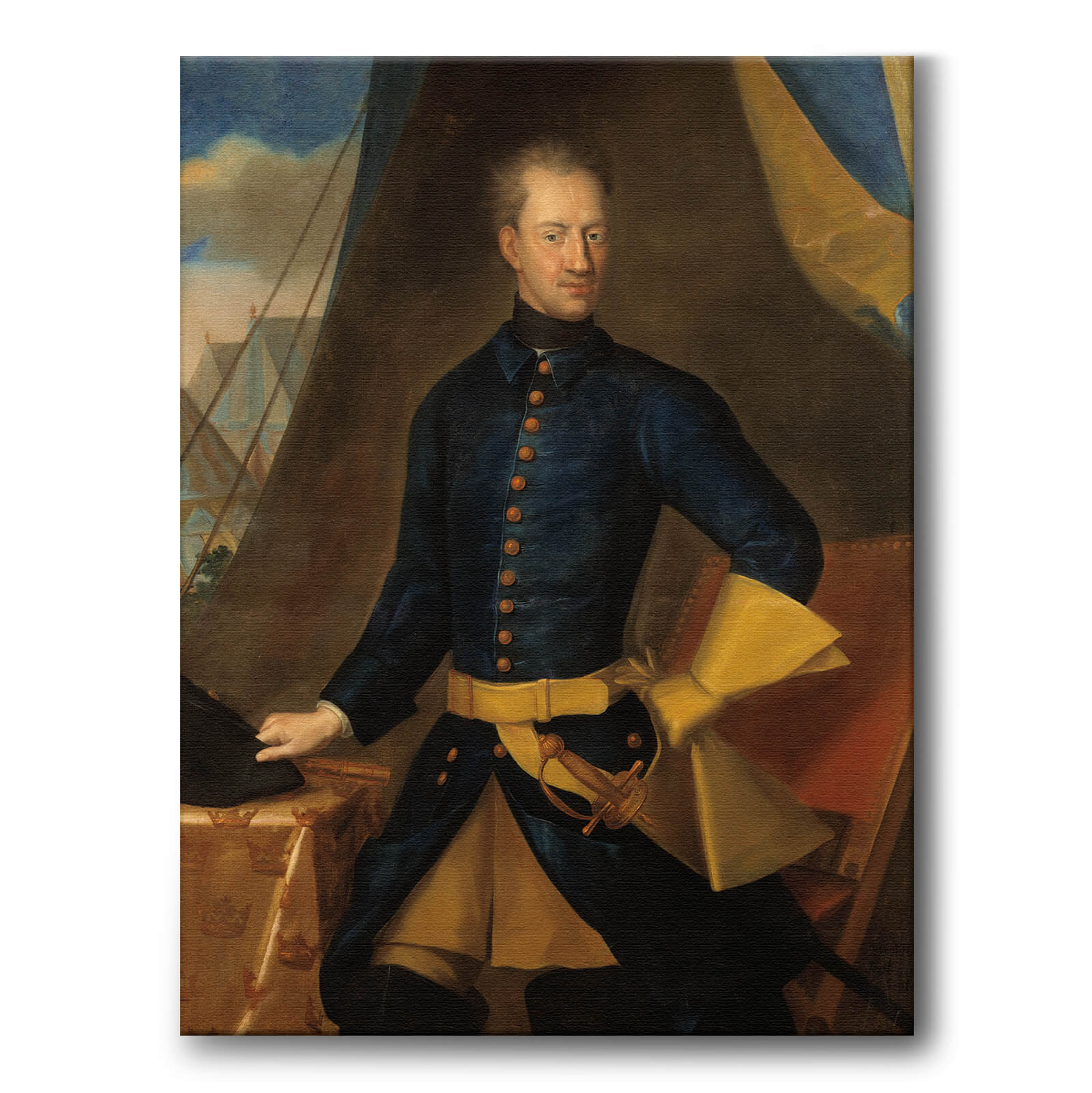 Et vakkert lerret malt av Johan David Schwartz, en svensk kunstner som var spesielt aktiv innen portrettmaling. Bildet er et portrett av kong Karl XII som vi ser posere i en fancy uniform.