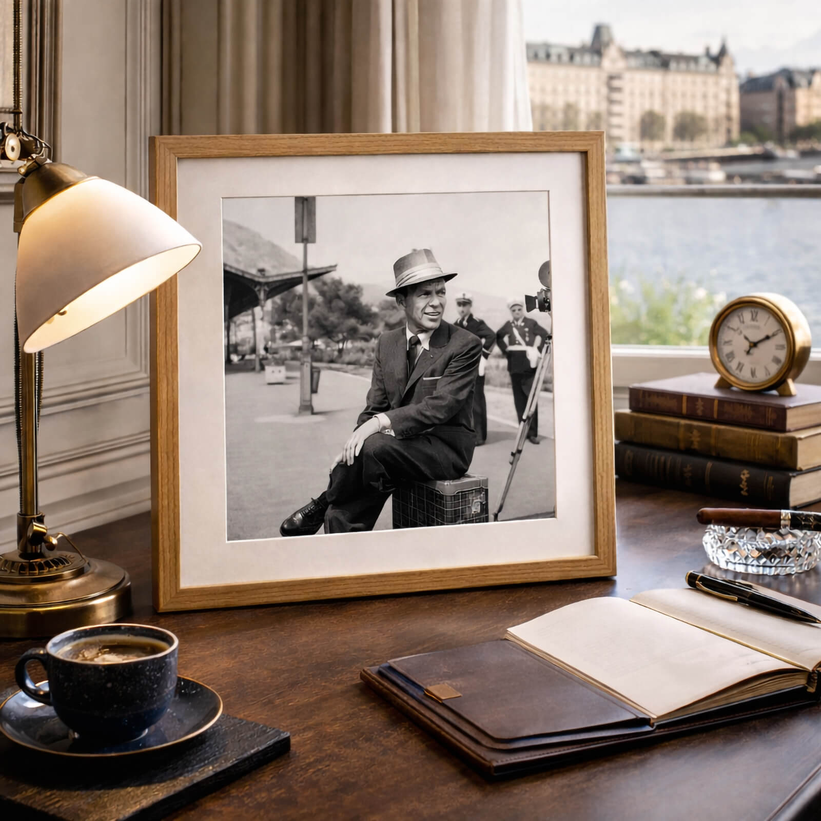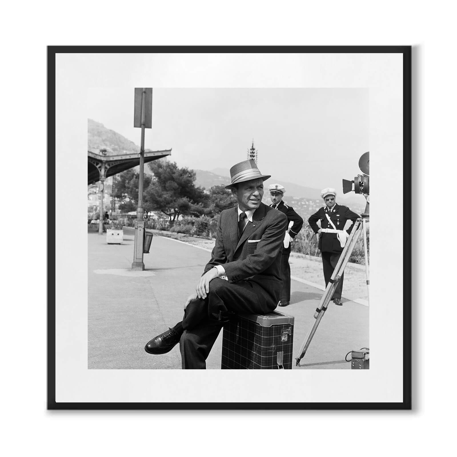 Frank Sinatra, fotografert på Cannes jernbanestasjon på slutten av 1950-tallet mens han ventet på et tog i forbindelse med promoteringen av Kings Go Forth. Sittende tilfeldig blant jernbanepersonale og filmutstyr, viser bildet et sjeldent, ærlig øyeblikk av en verdensstjerne mellom offentlige opptredener.