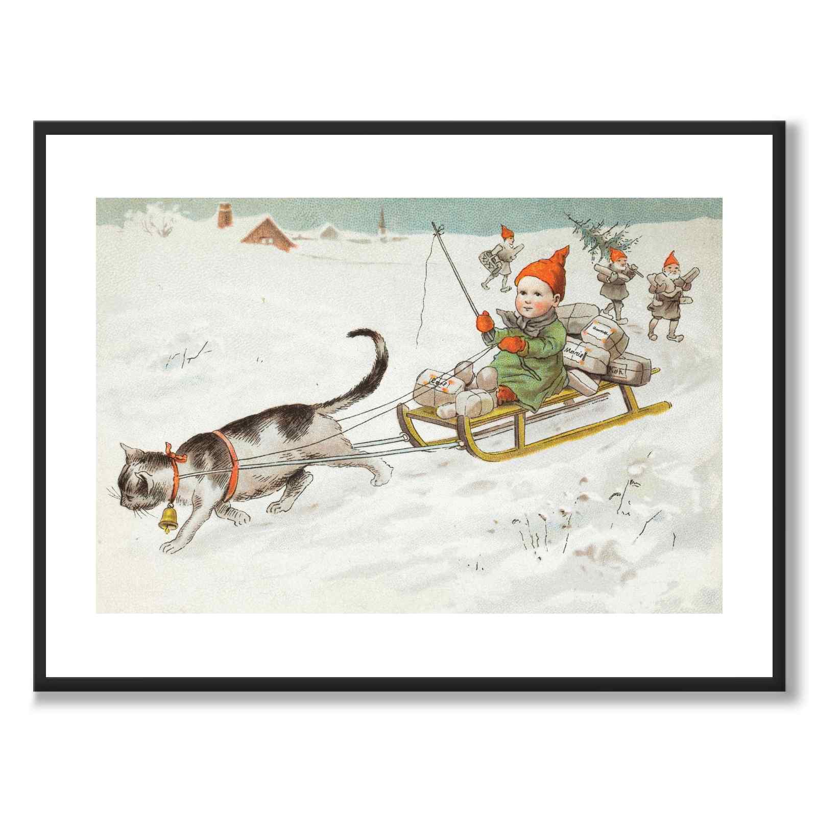 Plakat med klassisk julemotiv av Jenny Nyström fra 1890. Et lite barn kjører slede trukket av en katt i et vinterlandskap. I bakgrunnen ser vi nisser som bærer julegaver.